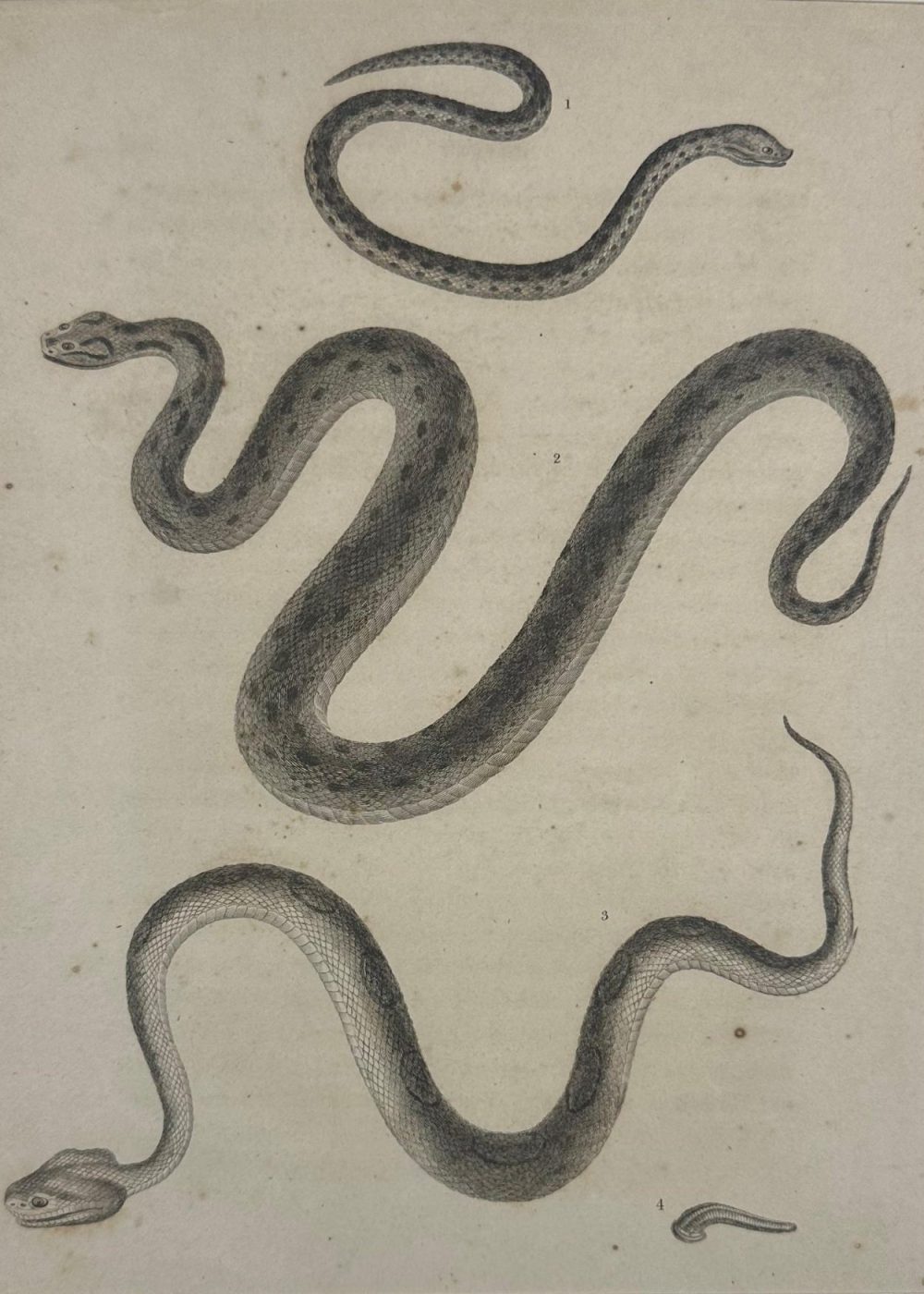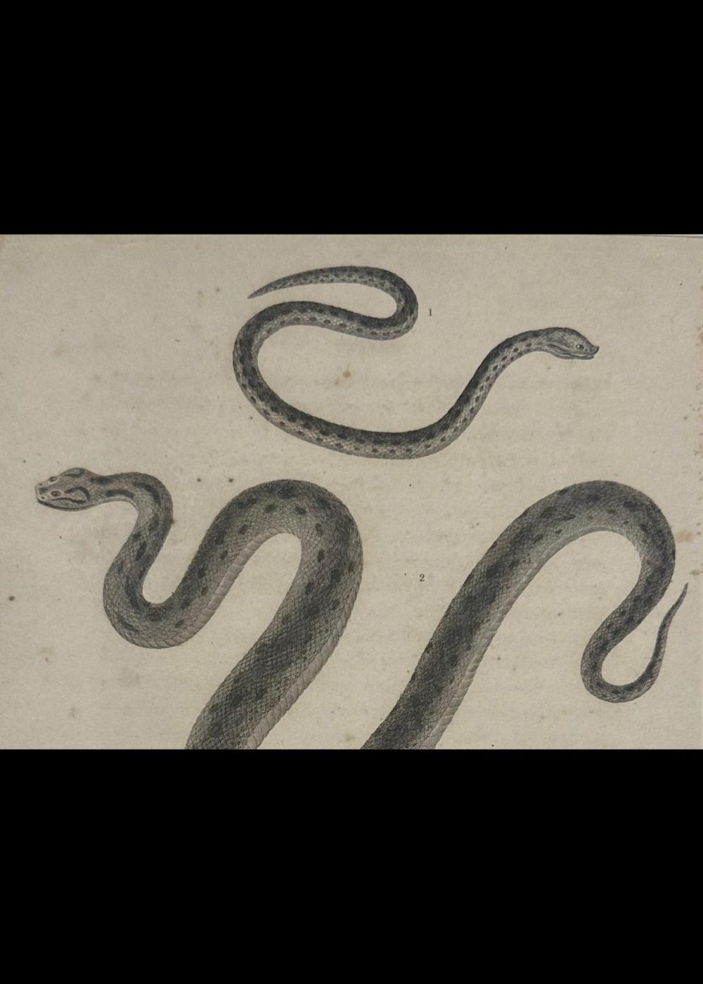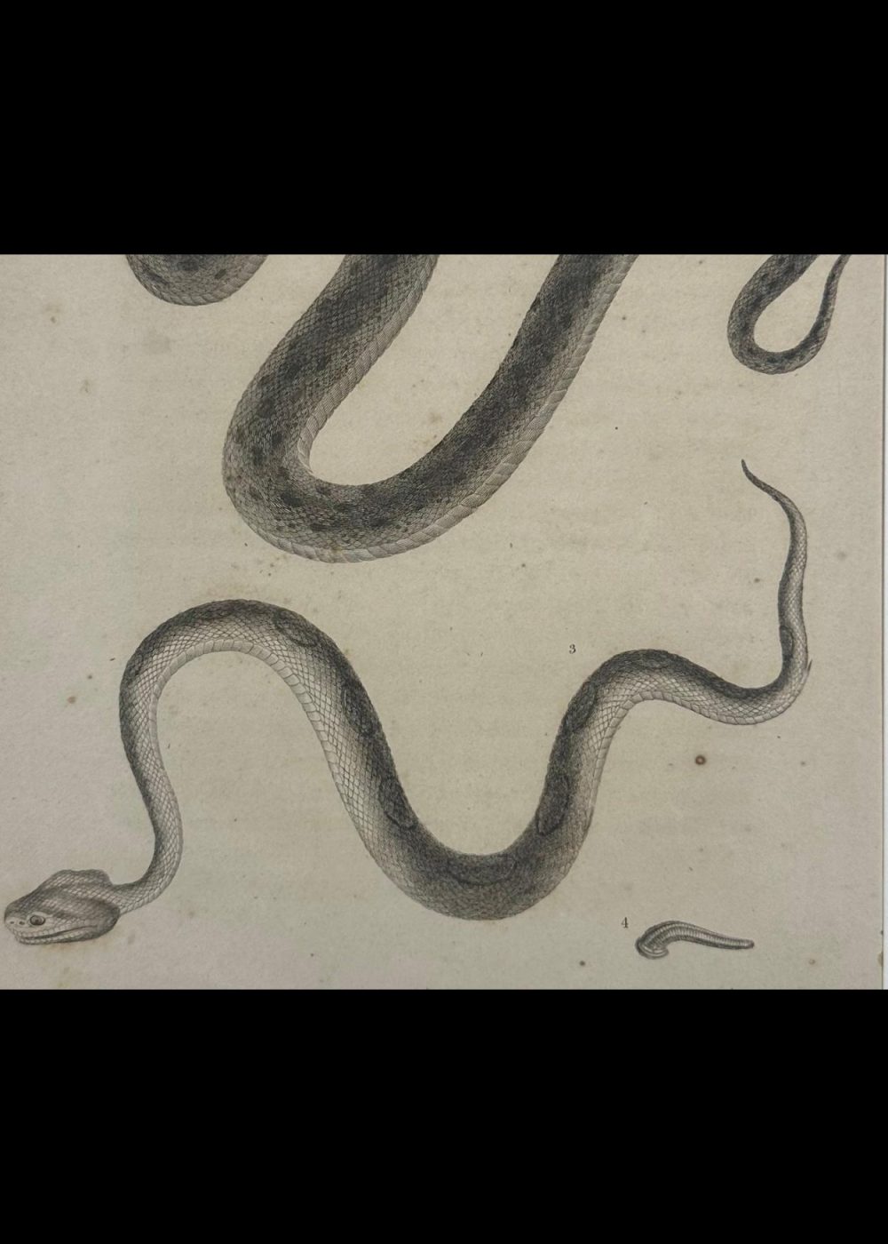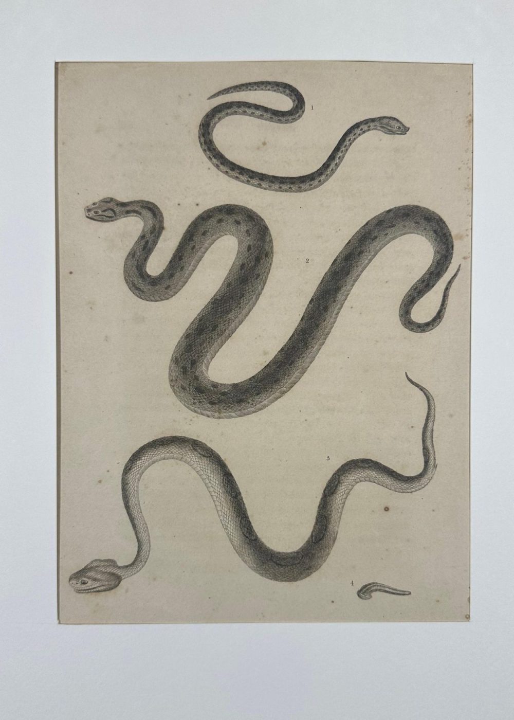 This 19th-century scientific engraving features a comparative illustration of various snake species in fluid, lifelike postures. The image highlights differences in body proportions, head shapes, and skin patterns. Each specimen is meticulously rendered to showcase the scale textures and natural markings, ranging from smooth to heavily spotted. Likely created for early zoological reference, the engraving serves as an educational tool for identifying and classifying serpents based on external morphology.
