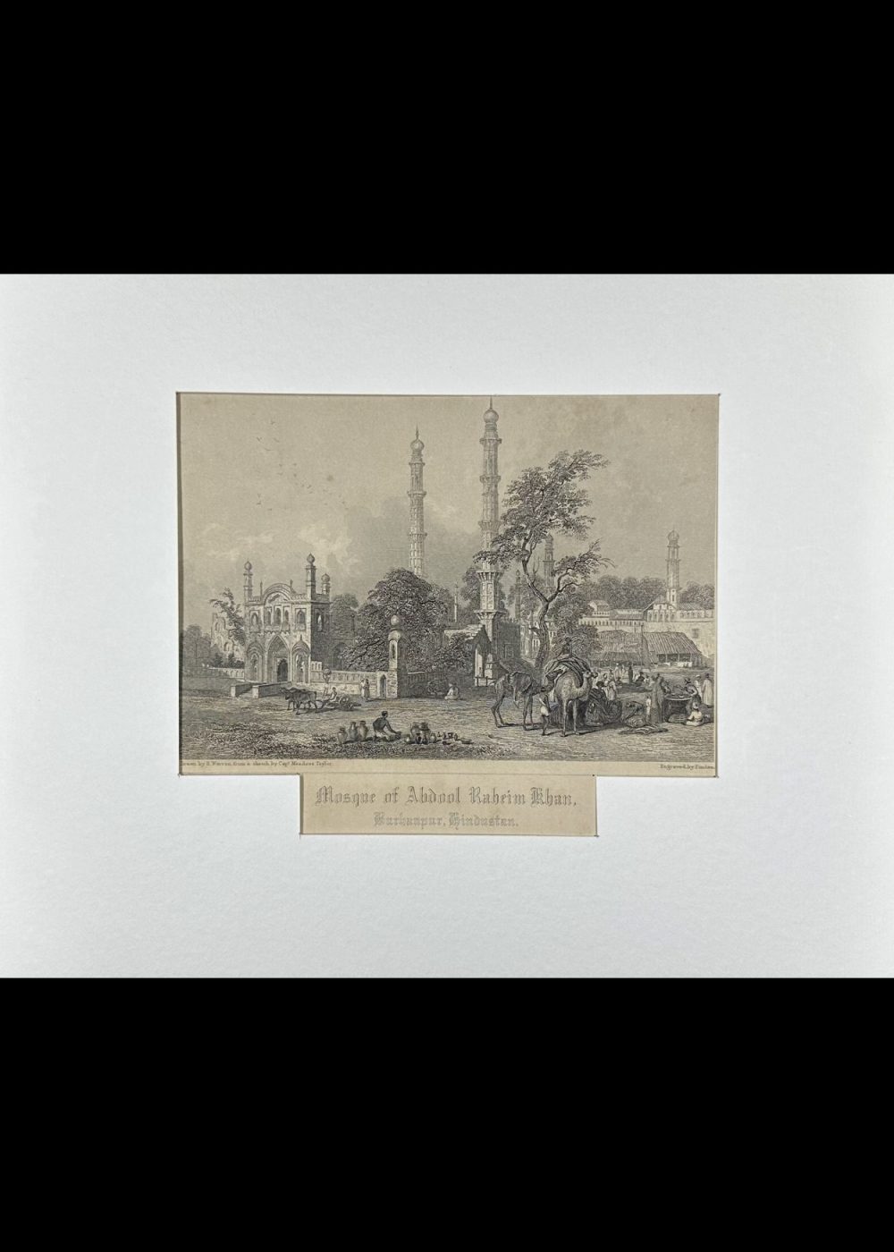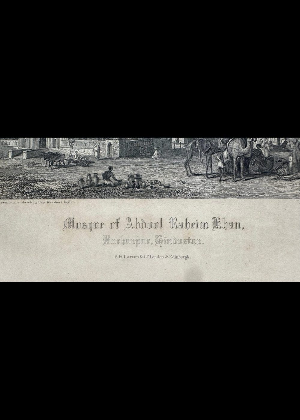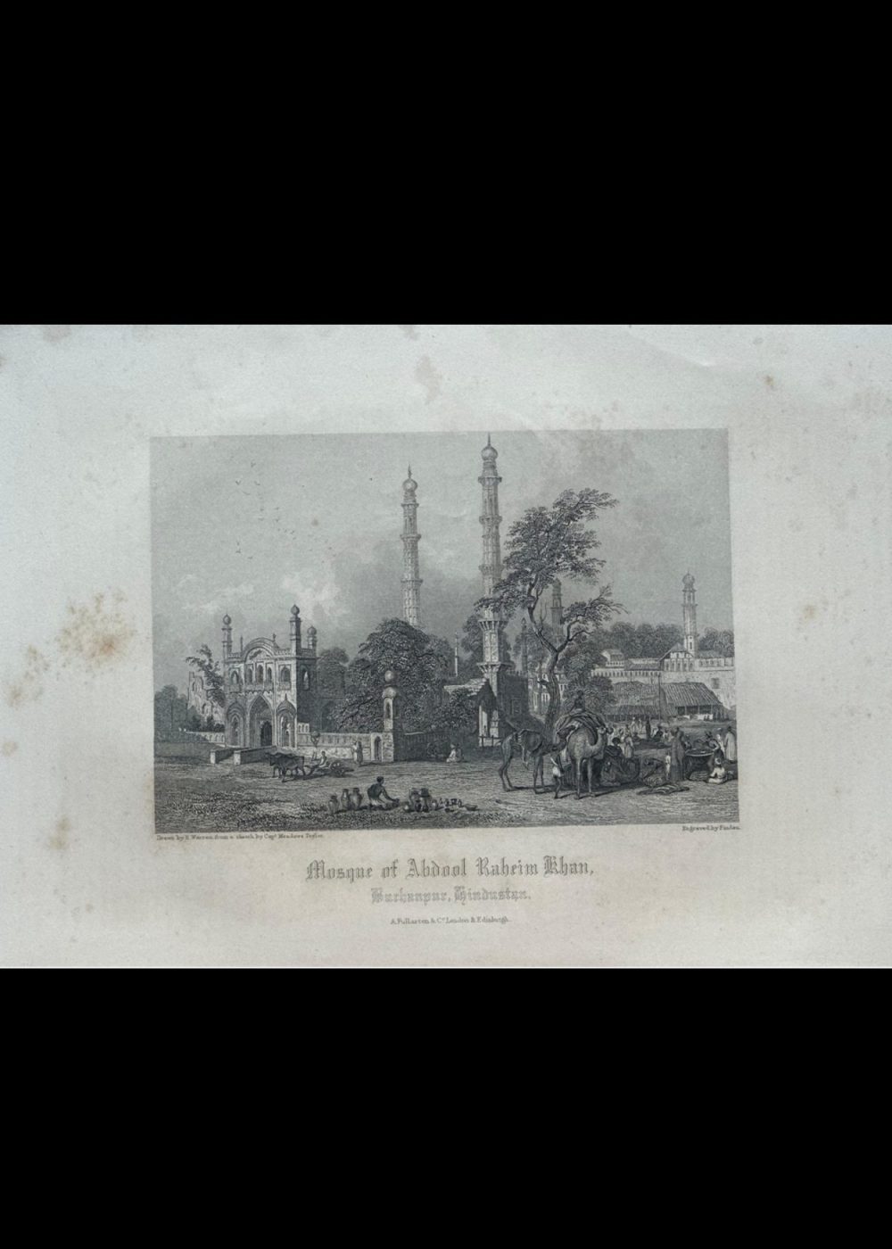 “THE FAITHS IN THE WORLD”. A dictionary of all religions and their religious sects. by The Rev. James Gardner. This is a historical engraving titled “Mosque of Abdaool Rabeim Khan, Ferozepore, Hindostan.” The scene depicts a mosque complex with intricate Mughal-style architecture, including tall minarets and arched entrances. In the foreground, people and animals are shown going about daily activities, offering a glimpse of life in colonial-era India. The engraving was drawn by W. F. Starling and engraved by Finden, and published by A. Fullarton & Co., London & Edinburgh. It reflects the British interest in documenting and romanticizing Indian architecture during the 19th century.