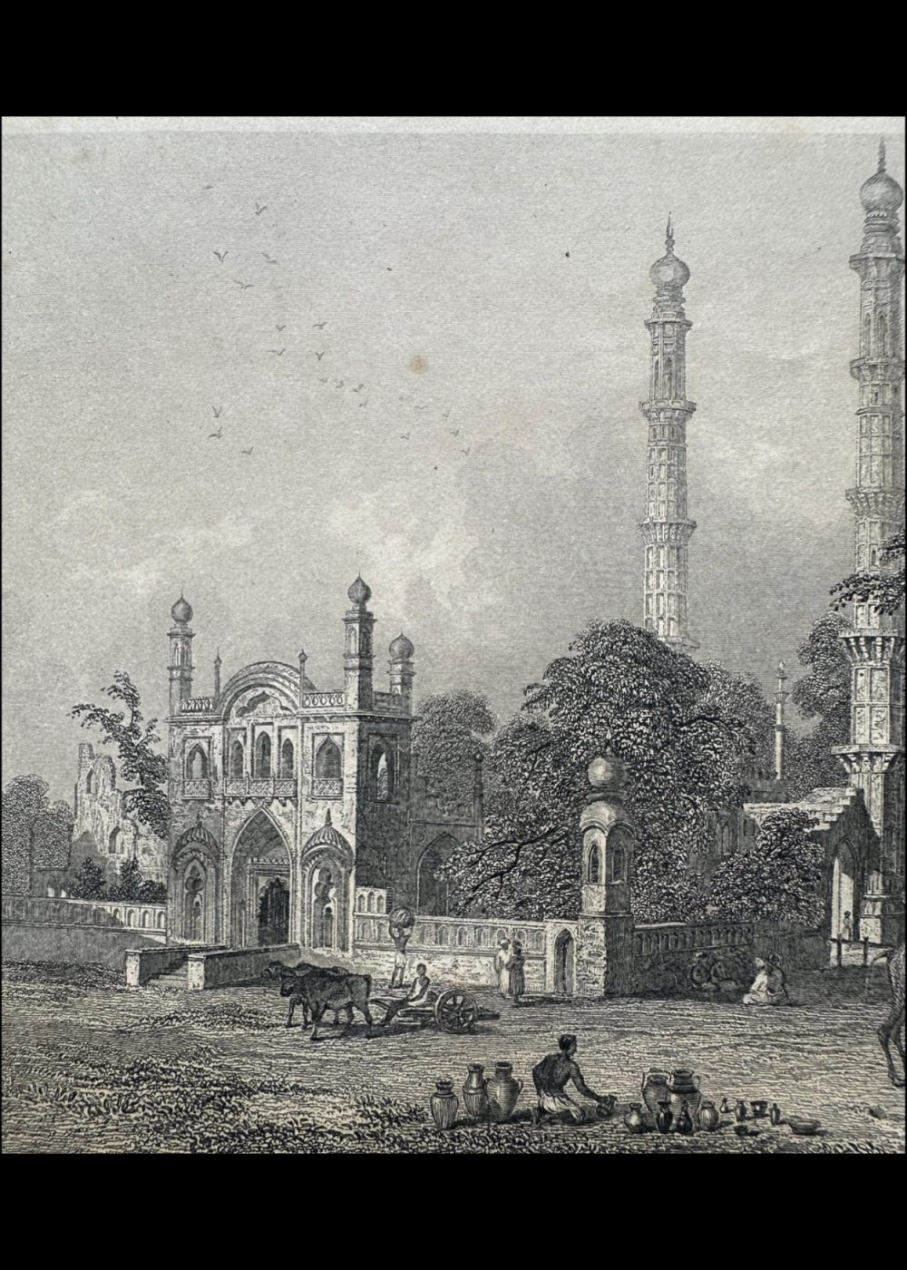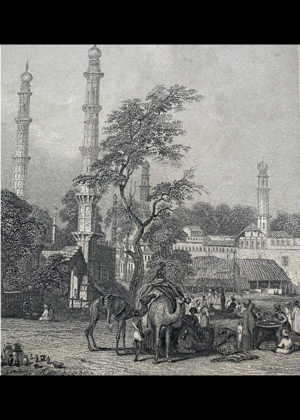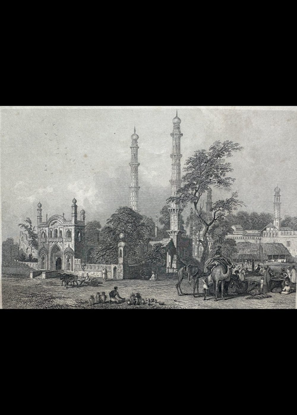 “THE FAITHS IN THE WORLD”. A dictionary of all religions and their religious sects. by The Rev. James Gardner. This is a historical engraving titled “Mosque of Abdaool Rabeim Khan, Ferozepore, Hindostan.” The scene depicts a mosque complex with intricate Mughal-style architecture, including tall minarets and arched entrances. In the foreground, people and animals are shown going about daily activities, offering a glimpse of life in colonial-era India. The engraving was drawn by W. F. Starling and engraved by Finden, and published by A. Fullarton & Co., London & Edinburgh. It reflects the British interest in documenting and romanticizing Indian architecture during the 19th century.
