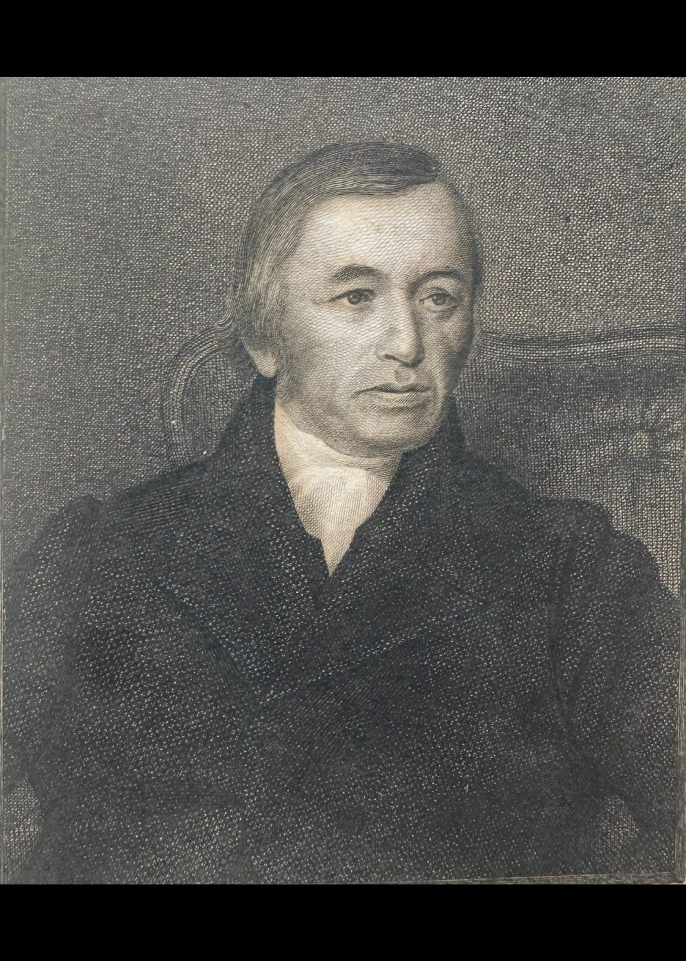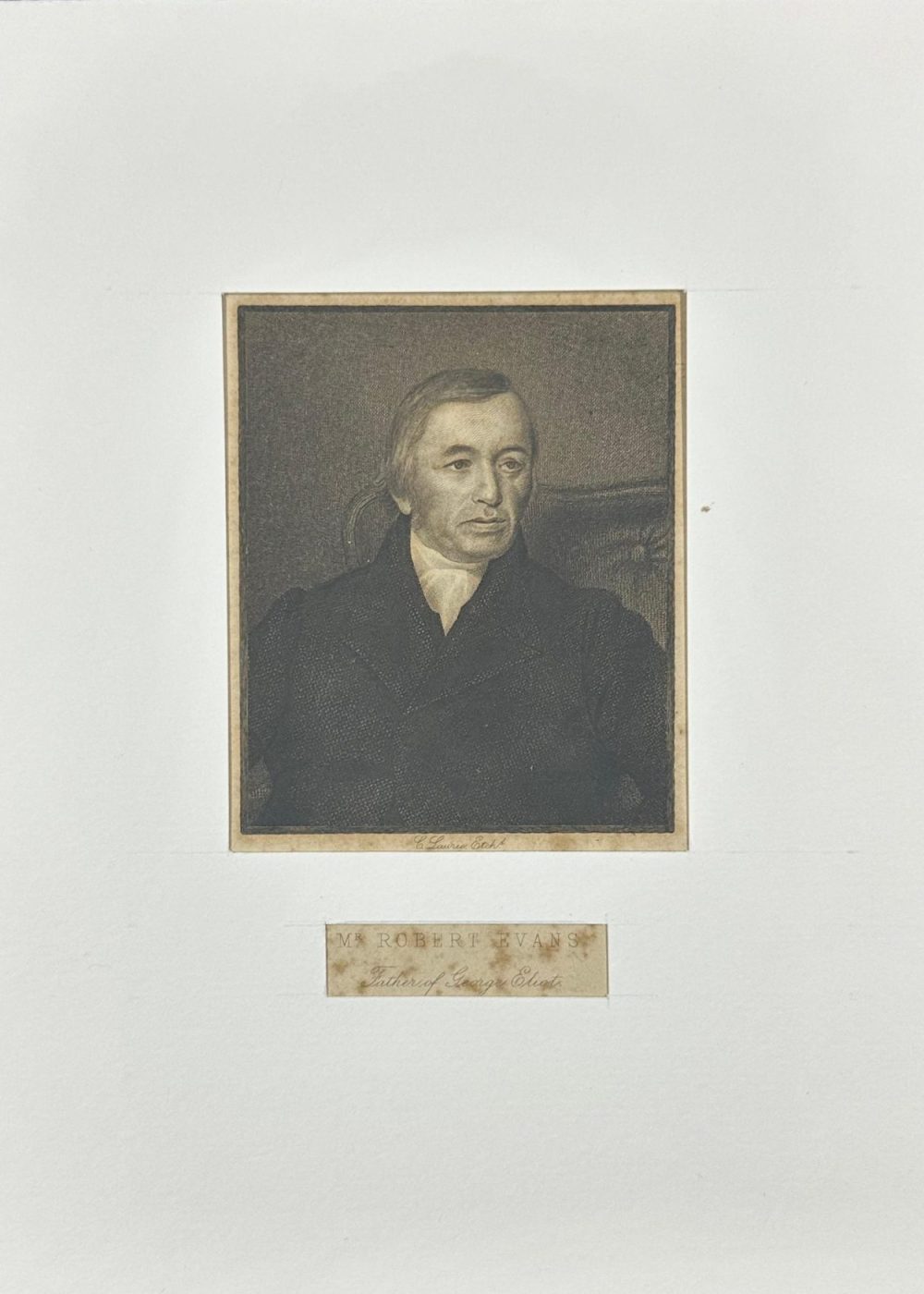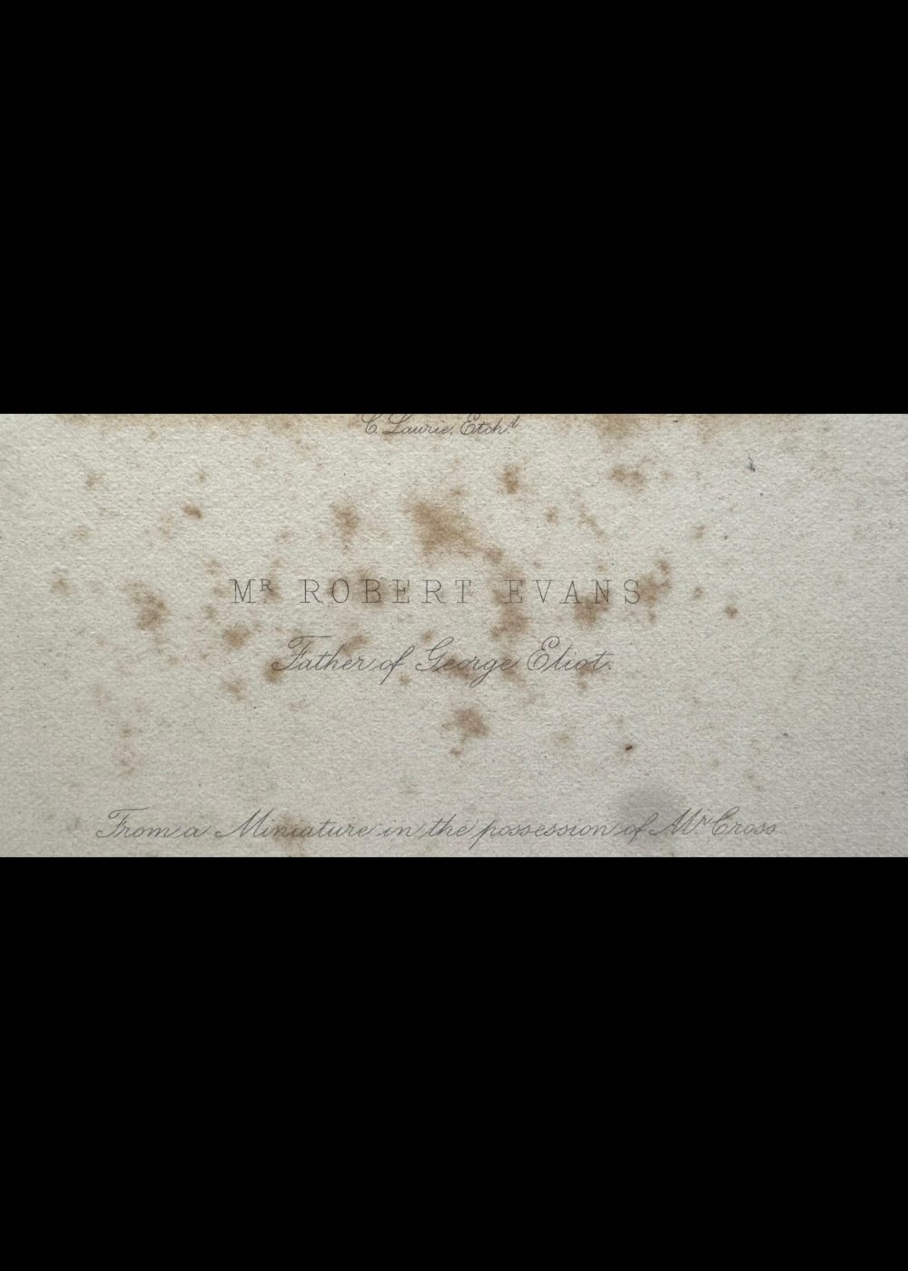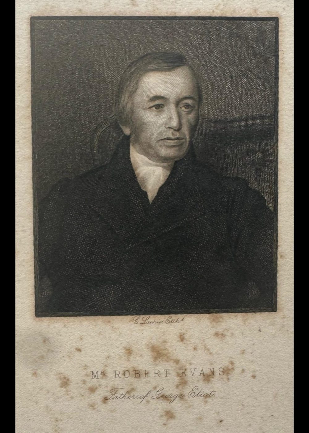 This finely detailed engraving presents Mr. Robert Evans, father of the renowned Victorian novelist George Eliot (the pen name of Mary Ann Evans). Seated in a composed and formal pose, Evans is depicted in 19th-century attire, his thoughtful expression reflecting the character often attributed to him in Eliot’s autobiographical fiction. The engraving is signed “C. Lewis, Erth.” below the image, and the caption beneath clearly identifies him as “Mr. Robert Evans, Father of George Eliot.” This portrait holds literary significance as a representation of the man who deeply influenced one of England’s greatest literary figures.