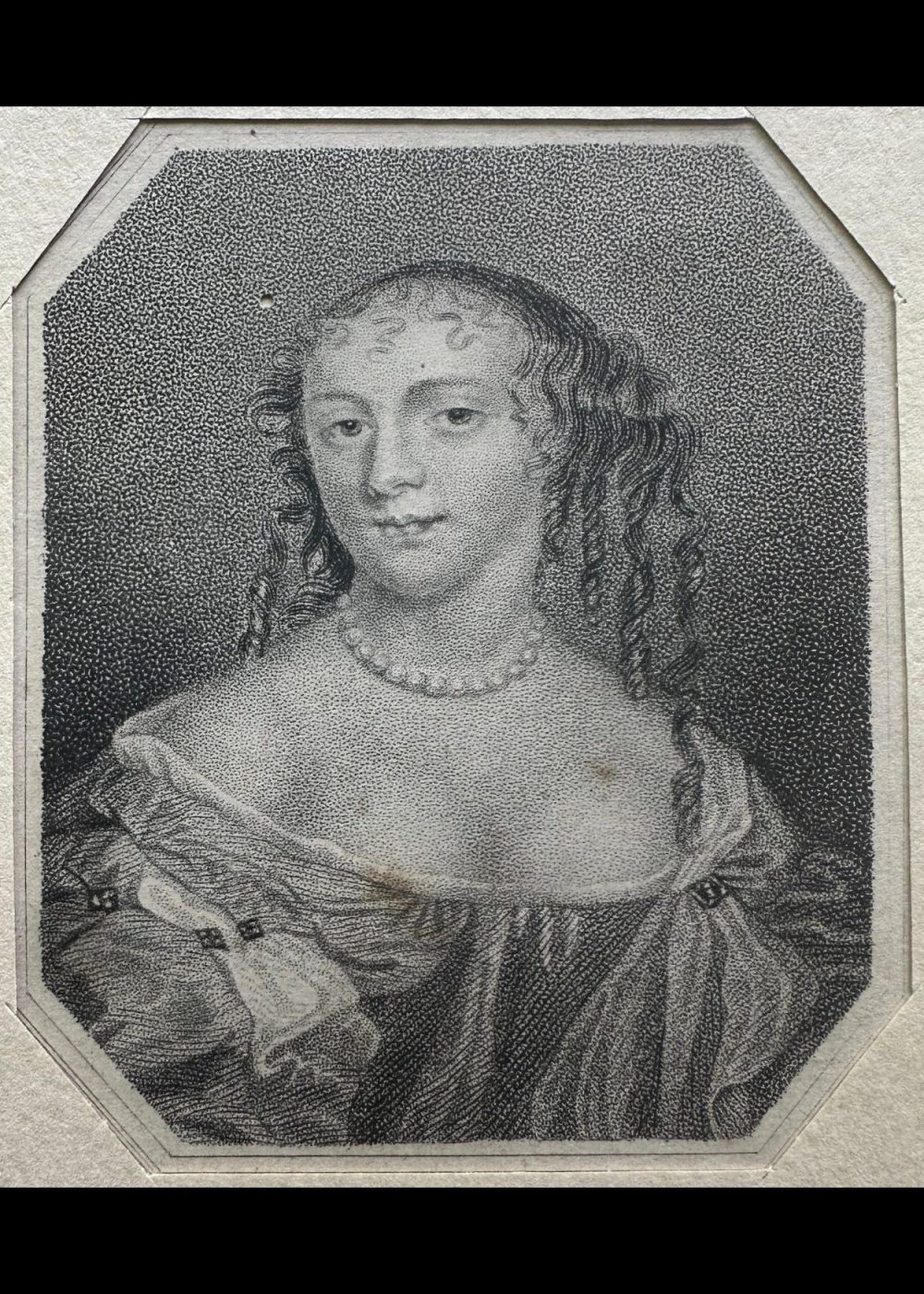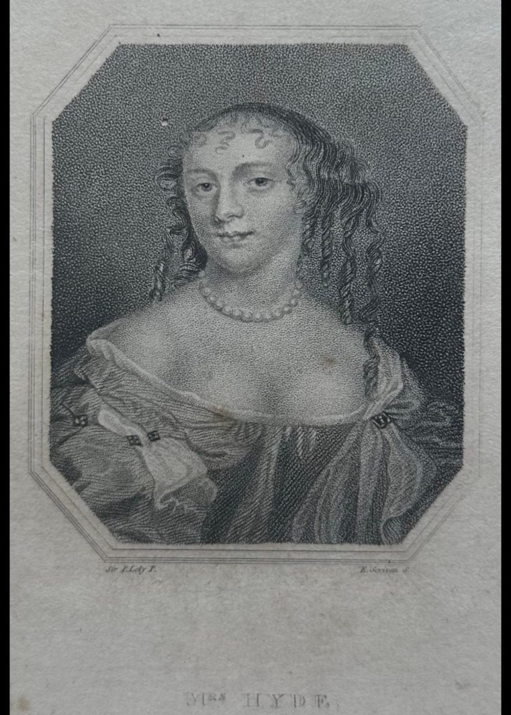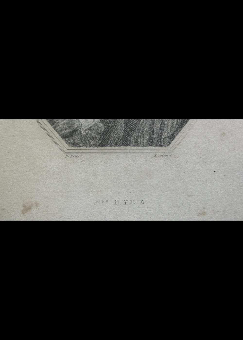 Mrs. Hyde afterwards lady Rochester. Published 1810. This delicately engraved portrait shows Mrs. Hyde adorned with a simple string of pearls and softly curled hair. She wears a draped gown accented with a bow, reflecting the graceful fashion of the 17th century. The engraving captures a sense of poise and refinement. Based on a painting by Sir Peter Lely, the work was skillfully engraved by E. Scriven.