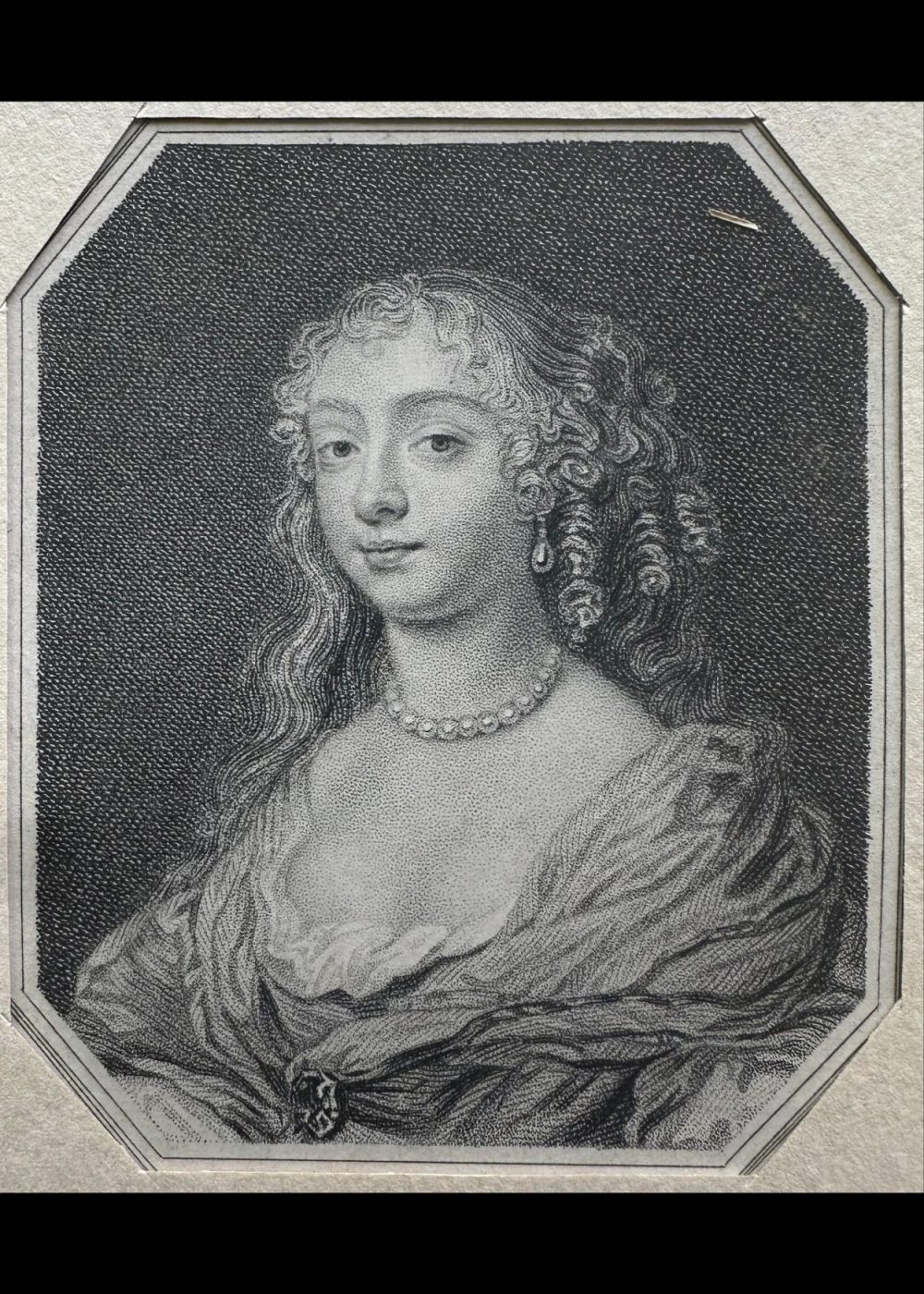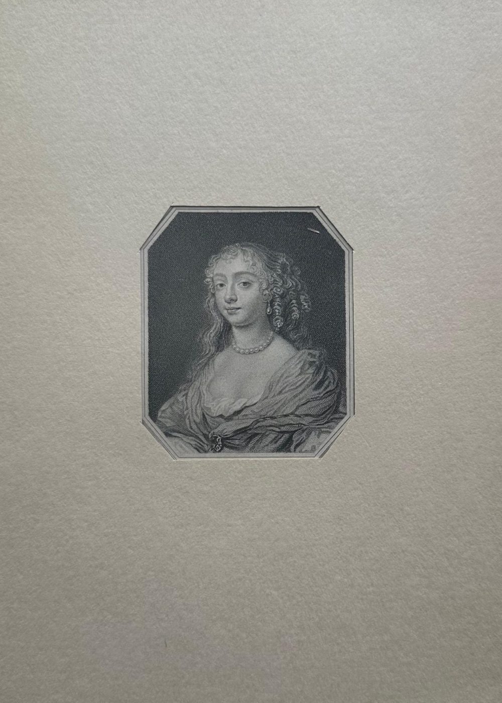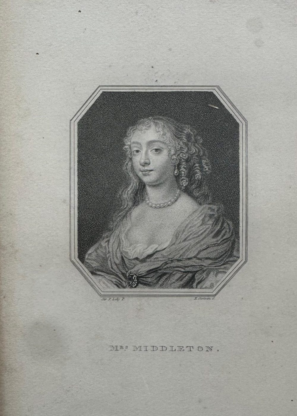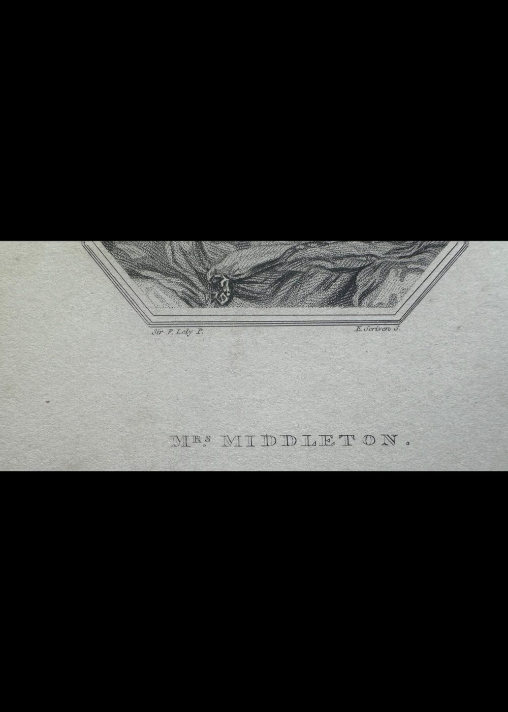 1646 to 1692. Publish 1810. This refined engraving presents Mrs. Middleton, elegantly portrayed with a composed expression and adorned in 17th-century attire. Her curled hair is styled with care, and she wears a delicate pearl necklace and earrings—symbols of grace and sophistication. The subtle drapery of her gown and the fine details of the engraving reflect the influence of Sir Peter Lely, whose portrait inspired this work. Executed by E. Scriven, the engraving exemplifies the courtly elegance typical of Restoration portraiture.