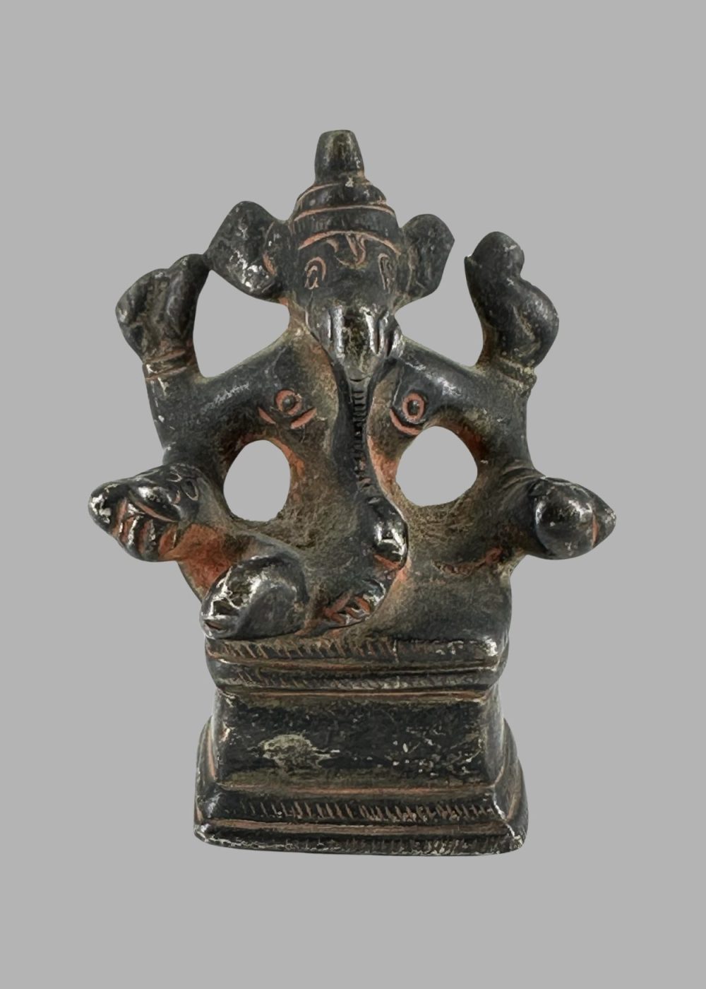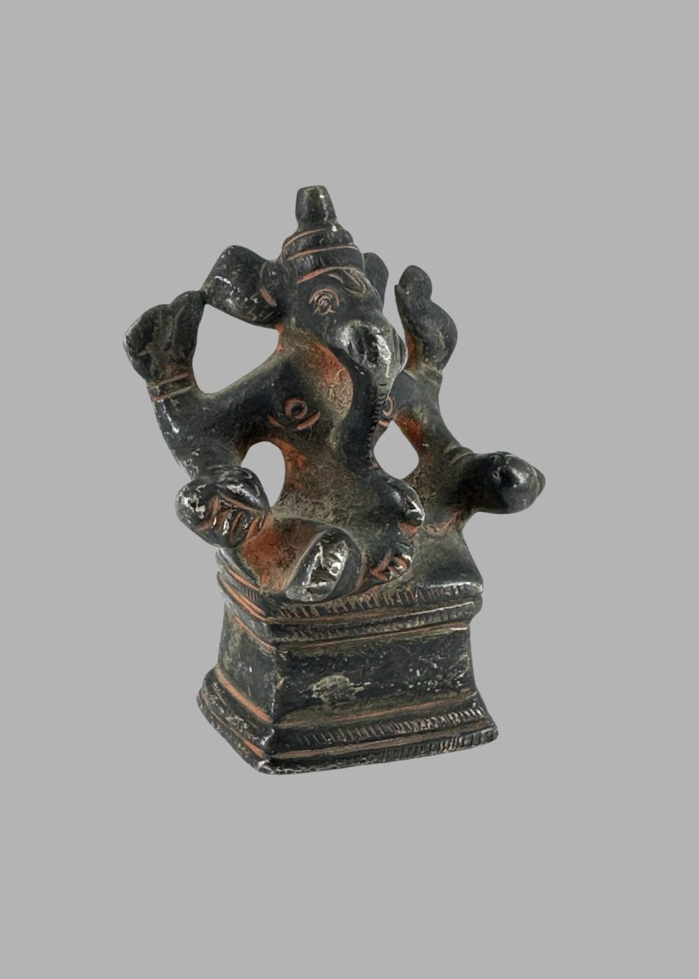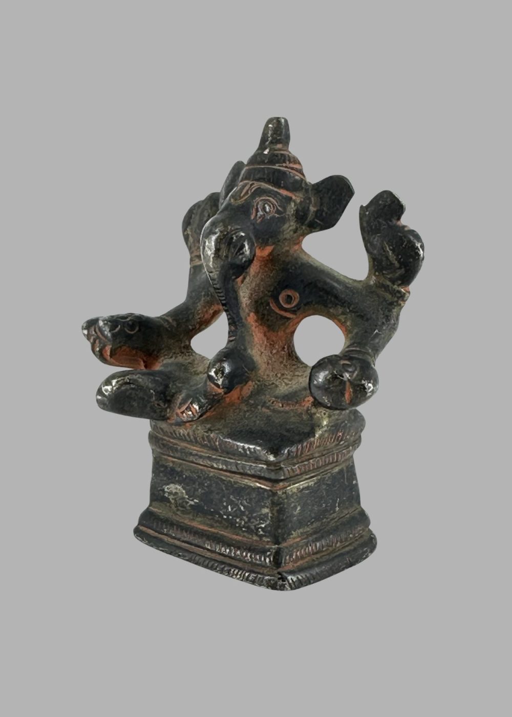 Seated regally with multiple arms and an elephantine countenance, this bronze sculpture of Ganesh exemplifies the elegance of Chola metalwork. The deity’s serene expression, finely cast ornaments, and poised posture reflect both devotional intimacy and masterful technique. Revered as the remover of obstacles and patron of intellect, Ganesh’s presence anchors spiritual and artistic continuity in South Indian tradition.