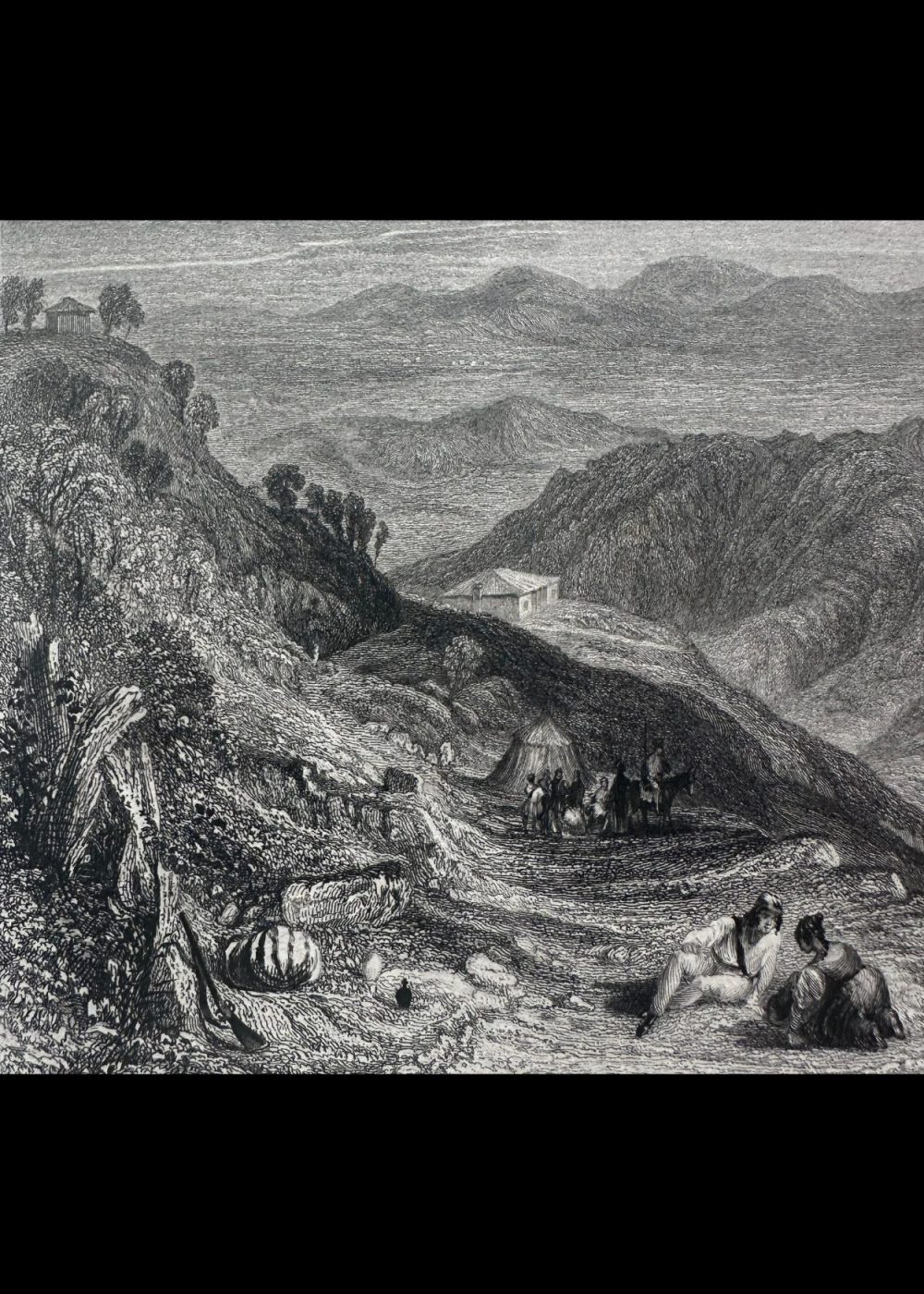 This 19th-century steel engraving, based on a drawing by the renowned British artist J.M.W. Turner, presents a panoramic view of the Doon Valley and the hill station of Mussoorie, as seen from Landour. The composition masterfully captures the undulating layers of the Himalayan foothills, leading the viewer’s eye into the vast horizon beyond. The detailed rendering of figures in the foreground—likely British visitors or residents in colonial attire—adds a sense of scale and narrative, highlighting the leisure and travel culture of the British Raj era. The landscape is populated with small settlements and winding paths, emphasizing the romantic and picturesque ideals of nature prevalent in 19th-century British art. The engraving serves not only as a work of aesthetic beauty but also as a historical document reflecting early colonial encounters with India’s mountainous terrain. This piece exemplifies Turner’s atmospheric vision interpreted through the precision of Finden’s engraving, merging topographical accuracy with poetic grandeur.