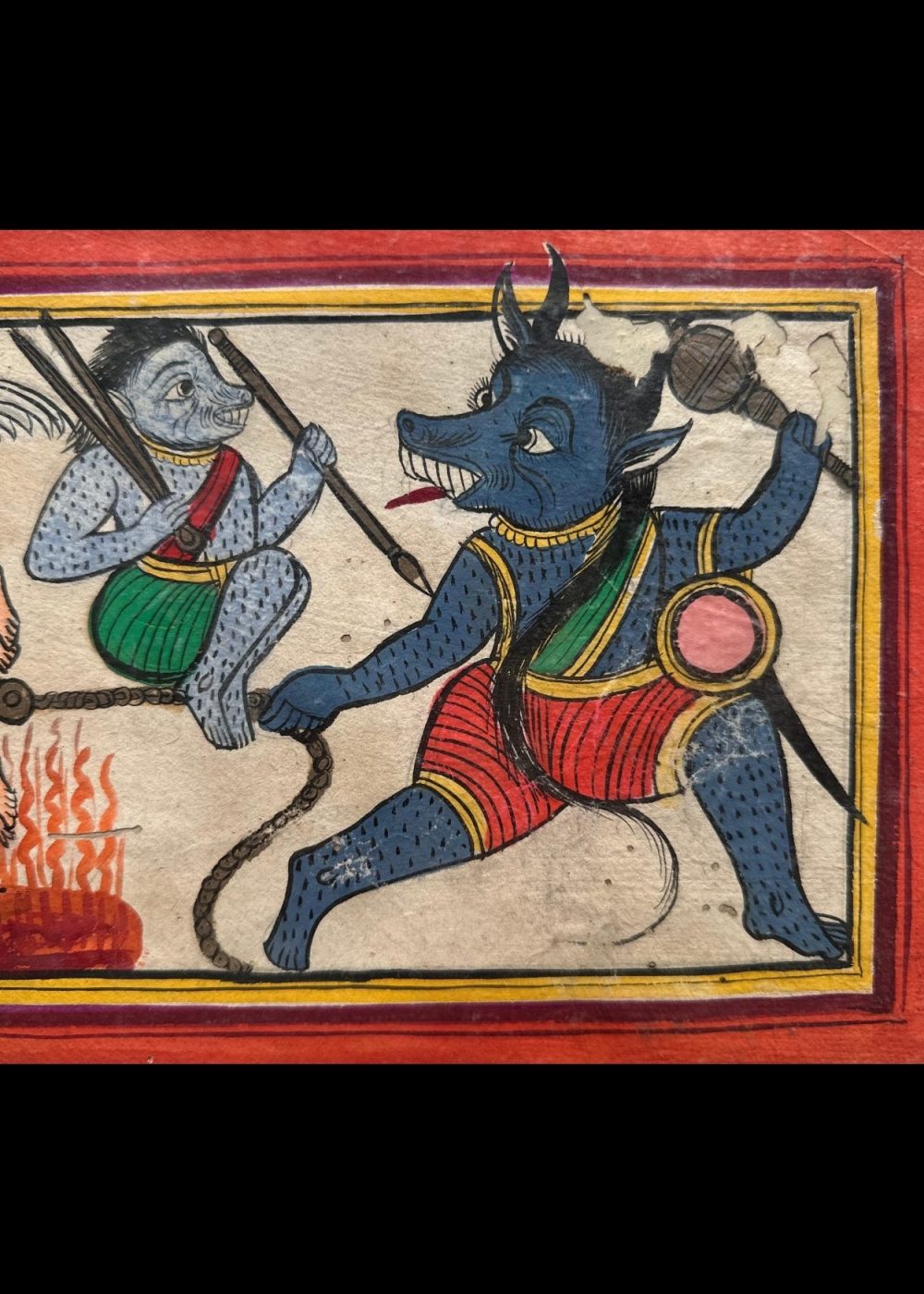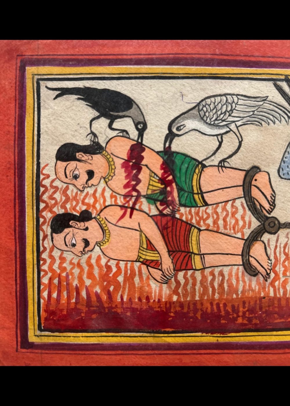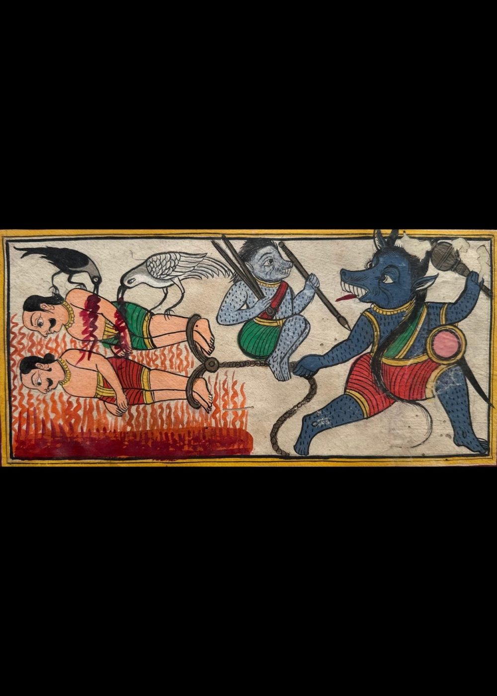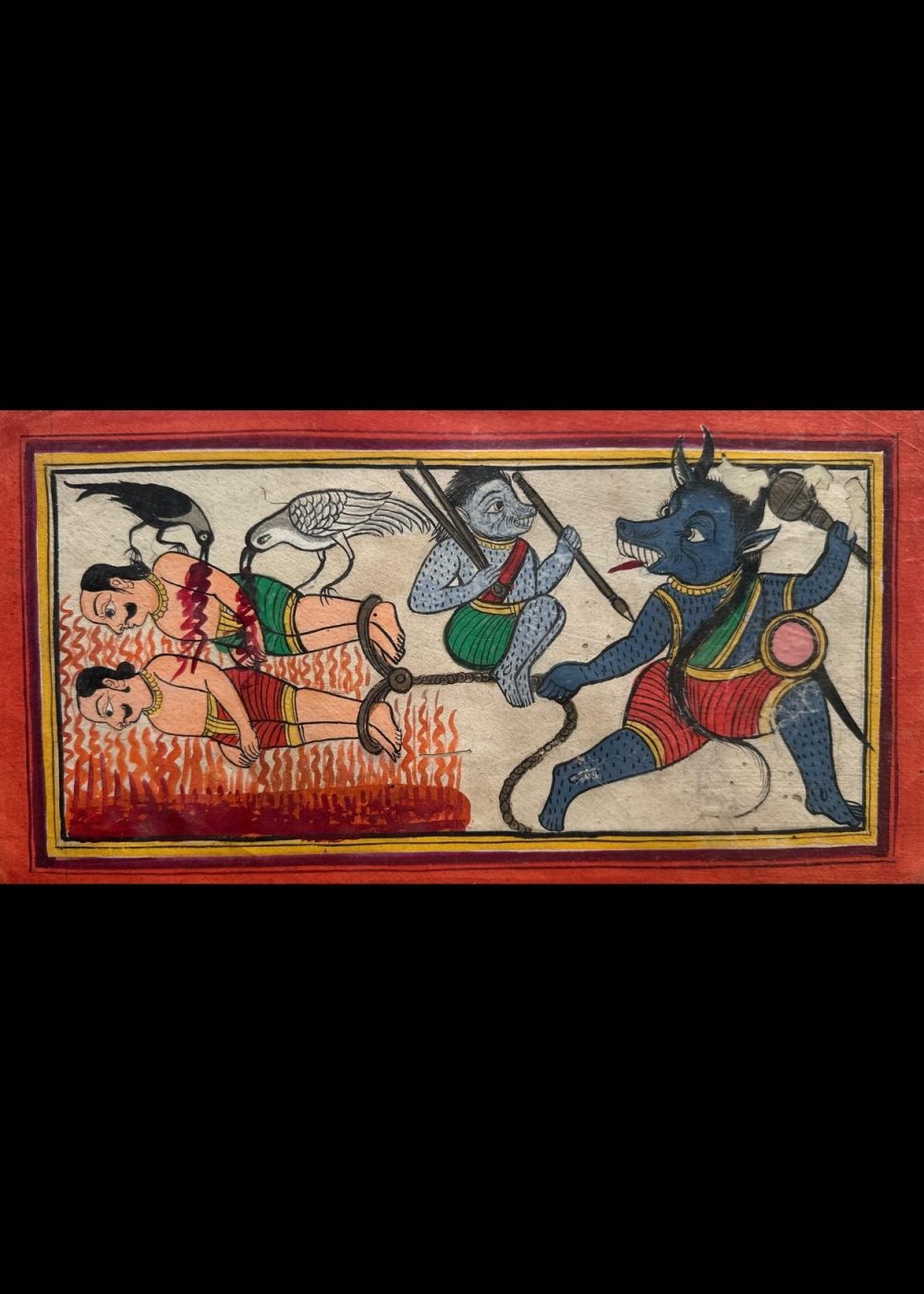 Painted in a folk miniature style, this work combines strong outlines, vivid colors, and moral symbolism, typical of regional traditions in Bengal or Rajasthan. These narrative scenes were not only devotional but also served as visual warnings about the consequences of sin, often used in storytelling or temple art.