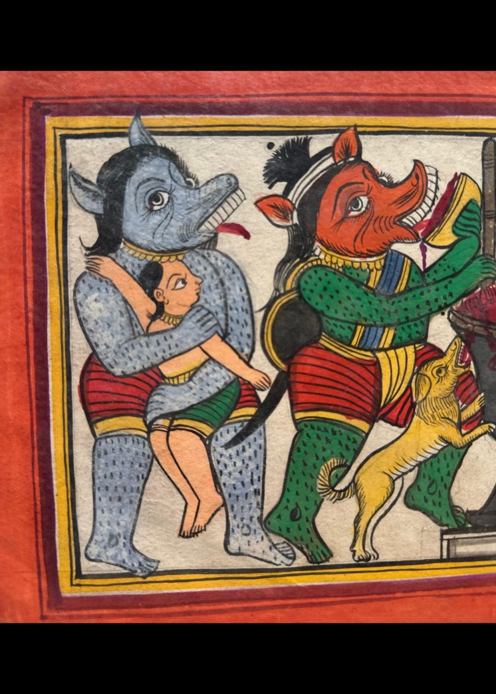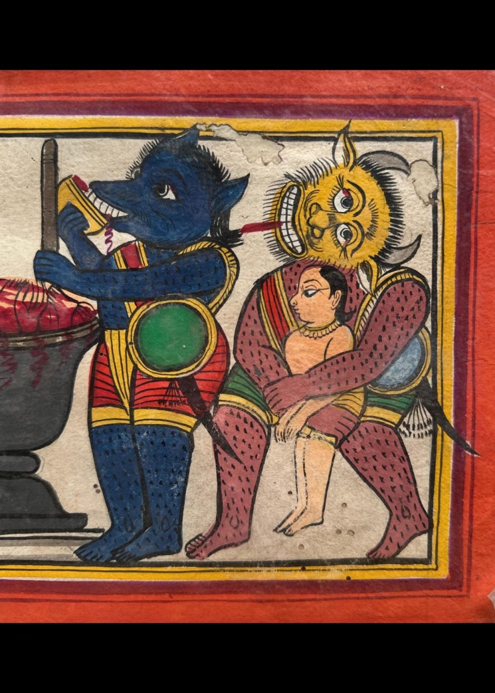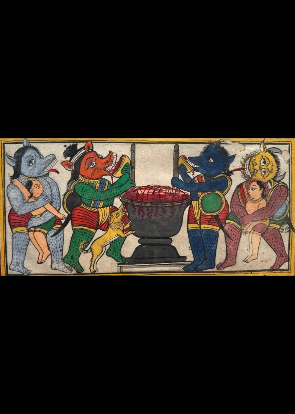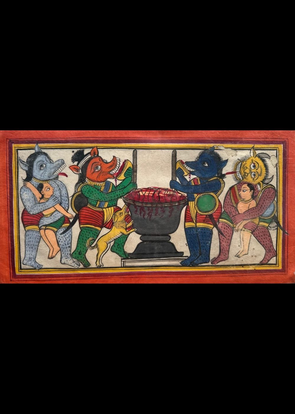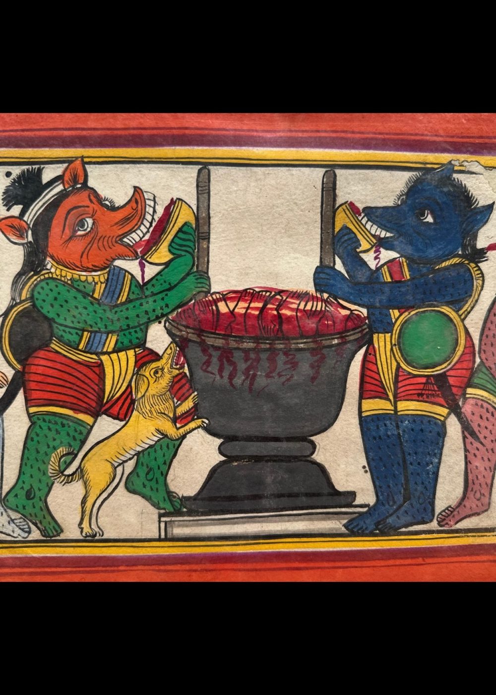 This striking miniature painting depicts a vivid Narakavali (scene from Hindu hell), where animal-headed demons punish sinners by boiling human limbs in a large cauldron. Two human figures are shown captive, symbolizing the souls facing karmic retribution. Bold colors, strong outlines, and expressive forms reflect traditional folk-art style, used to convey moral and religious themes. A powerful visual narrative on sin, punishment, and justice from Hindu mythology.