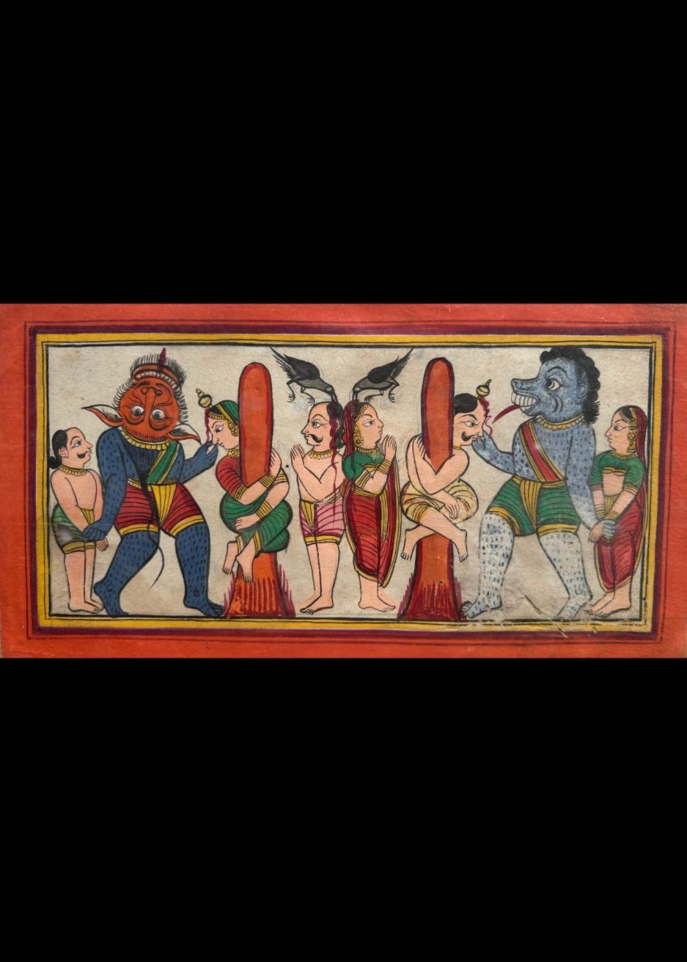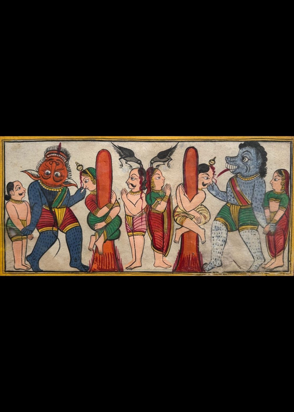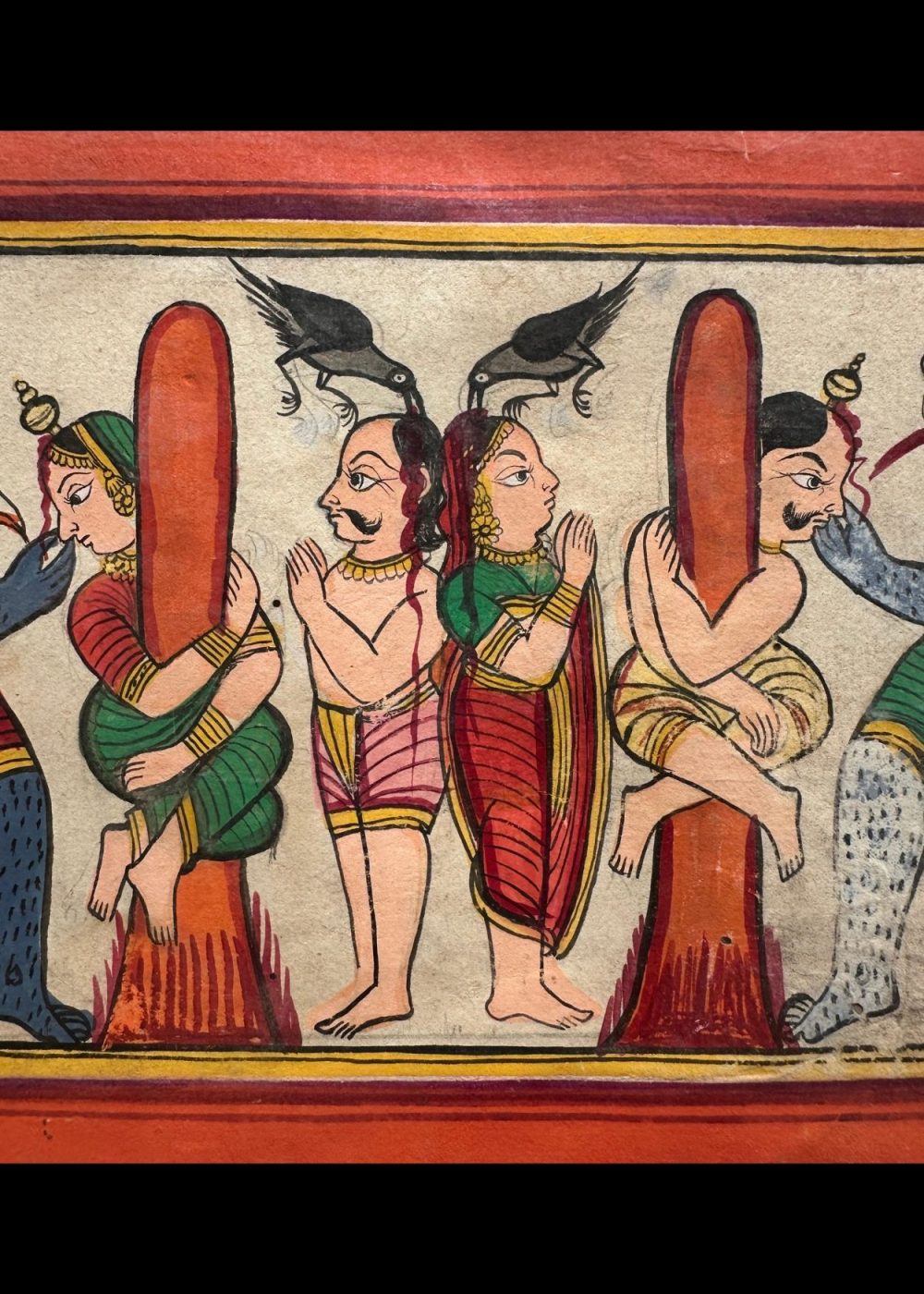 The condemned figures are shown impaled on fiery stakes, while crows peck at their heads, signifying eternal torment. Despite the violence, the figures are stylized with vibrant colors, bold outlines, and expressive gestures, typical of Pattachitra or Kalighat-style influences.