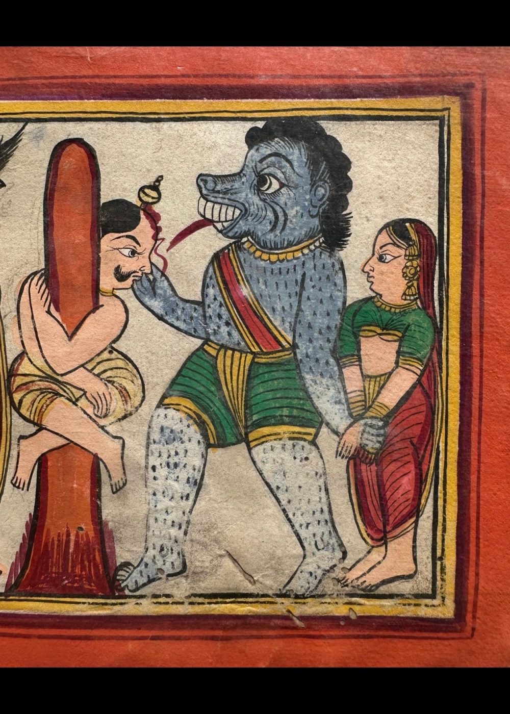 This dramatic miniature painting portrays scenes from Naraka (Hindu hell), illustrating the punishment of souls based on karmic retribution. The composition features demons — one with a buffalo-like head reminiscent of Yama’s attendants, and another with fierce features — enacting brutal punishments on sinners.