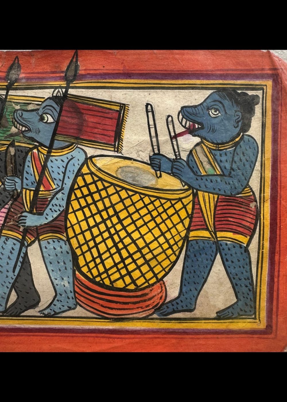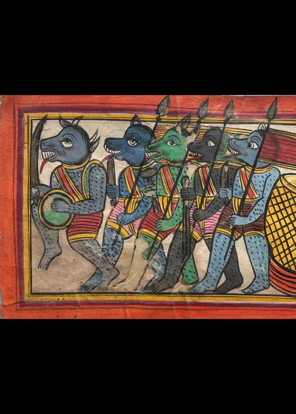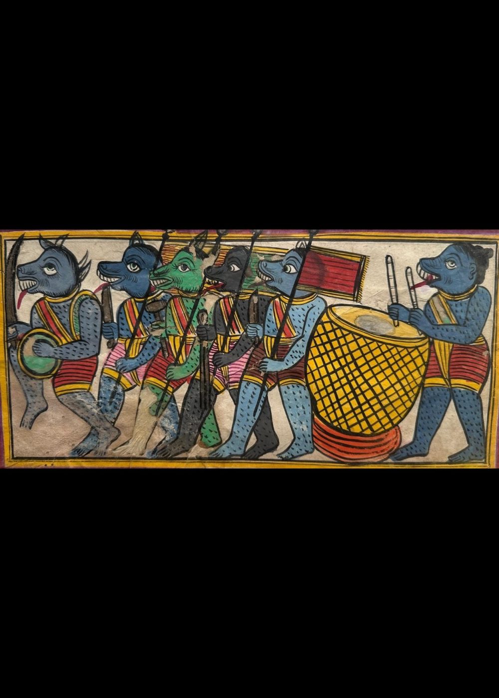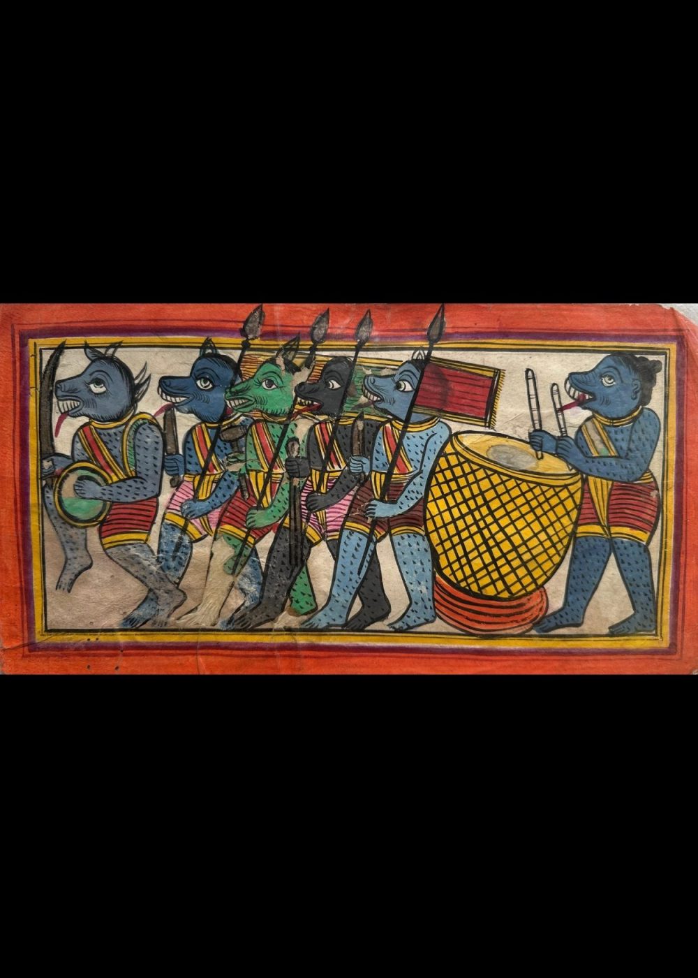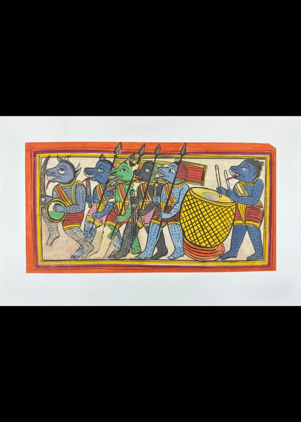 This traditional folk painting depicts a group of demon-like figures with animal heads and human bodies, marching in unison. Each figure is shown carrying weapons or playing musical instruments such as drums, cymbals, and pipes, creating an impression of a ceremonial procession or preparation for battle. Their exaggerated features, vivid colors, and patterned clothing emphasize their ferocity and supernatural presence. The scene reflects themes of power, intimidation, and ritual often associated with mythological narratives in Indian art traditions.