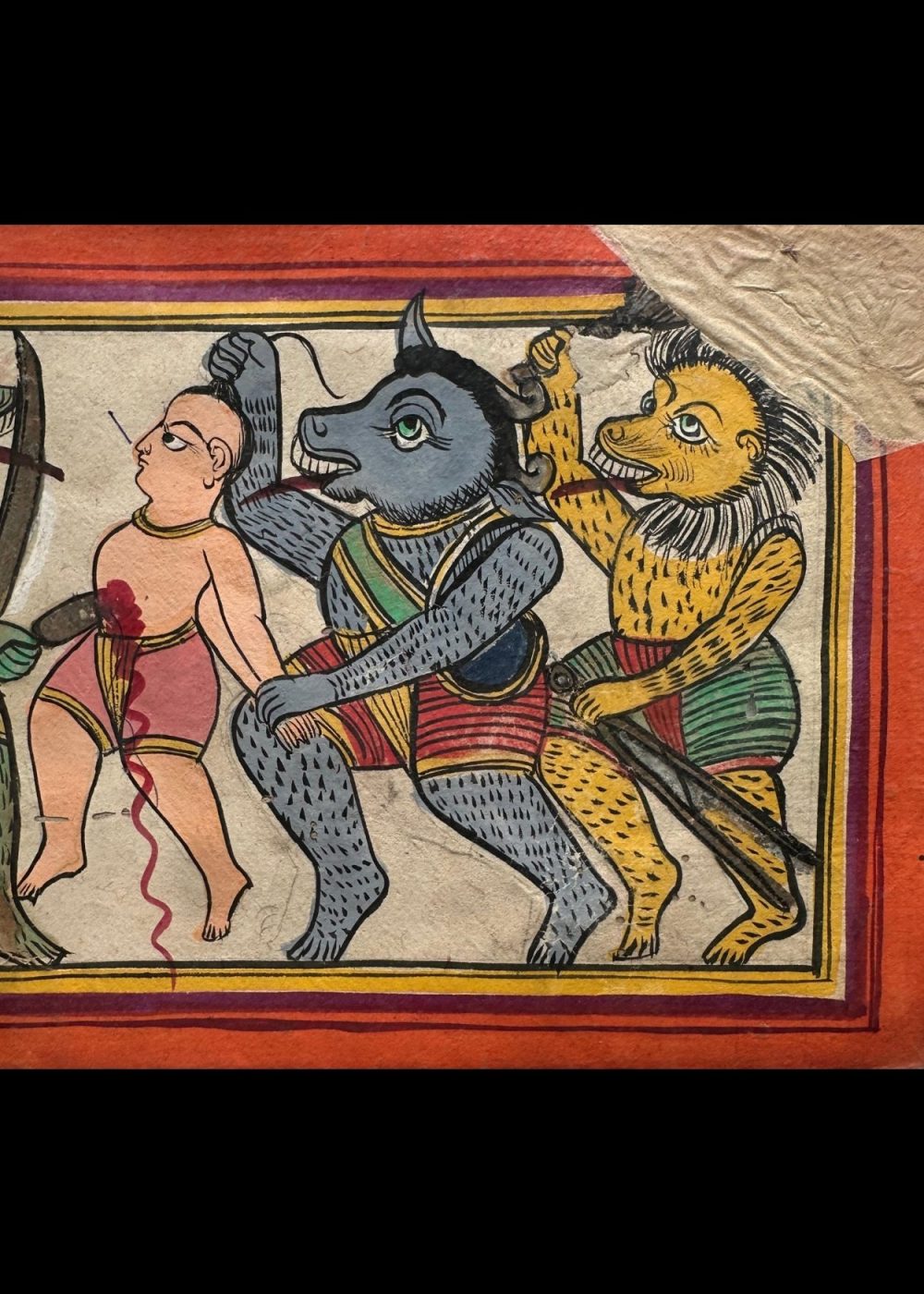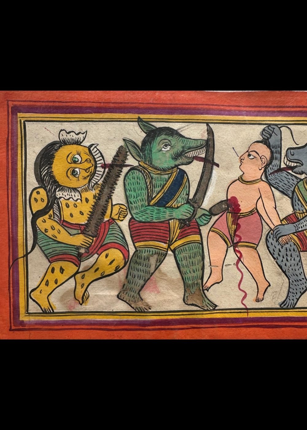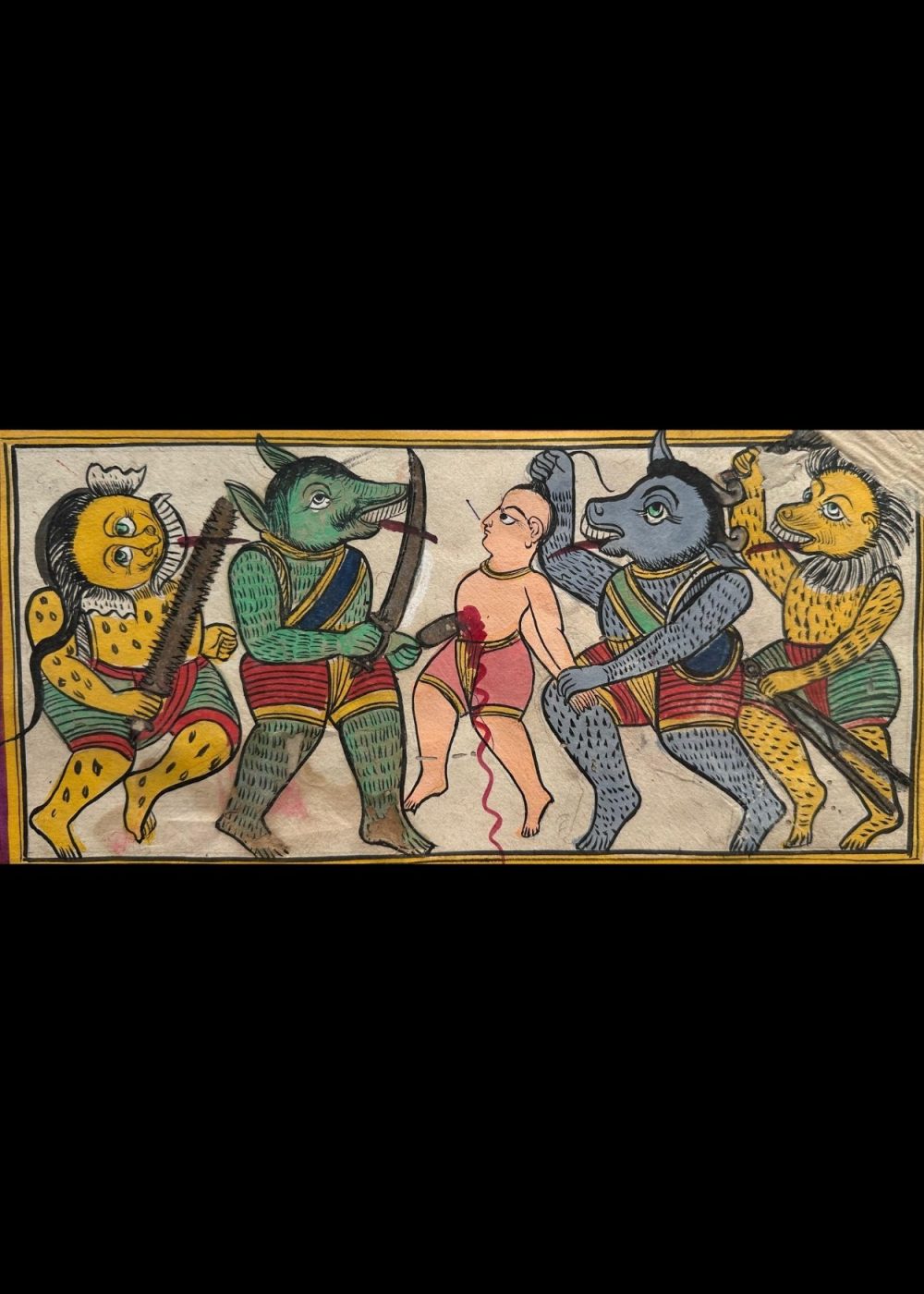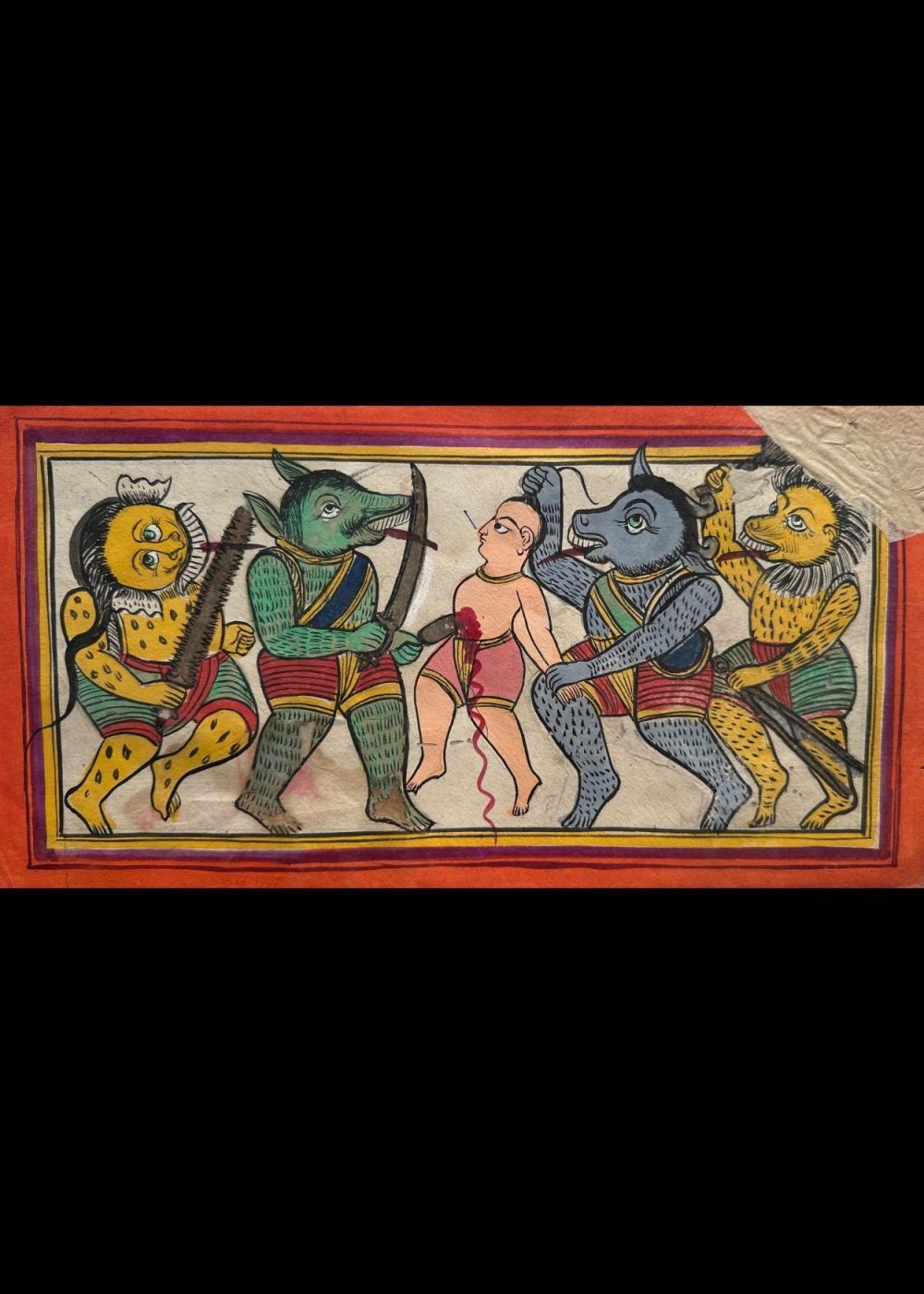 This painting depicts a dramatic and intense scene from Indian mythological or folk traditions. At the center, a human figure—likely a saint, devotee, or innocent victim—is shown being attacked by fierce demon-like beings. The demons have animalistic features such as snouts, fangs, and spotted or hairy bodies, each holding weapons like swords and clubs. Blood is shown on the central figure, emphasizing violence and suffering. The bold outlines, vivid colors, and expressive faces are characteristic of traditional Indian folk paintings, where symbolic depictions of good versus evil are common. The artwork conveys the cruelty of demonic forces in contrast to the vulnerability of human virtue.