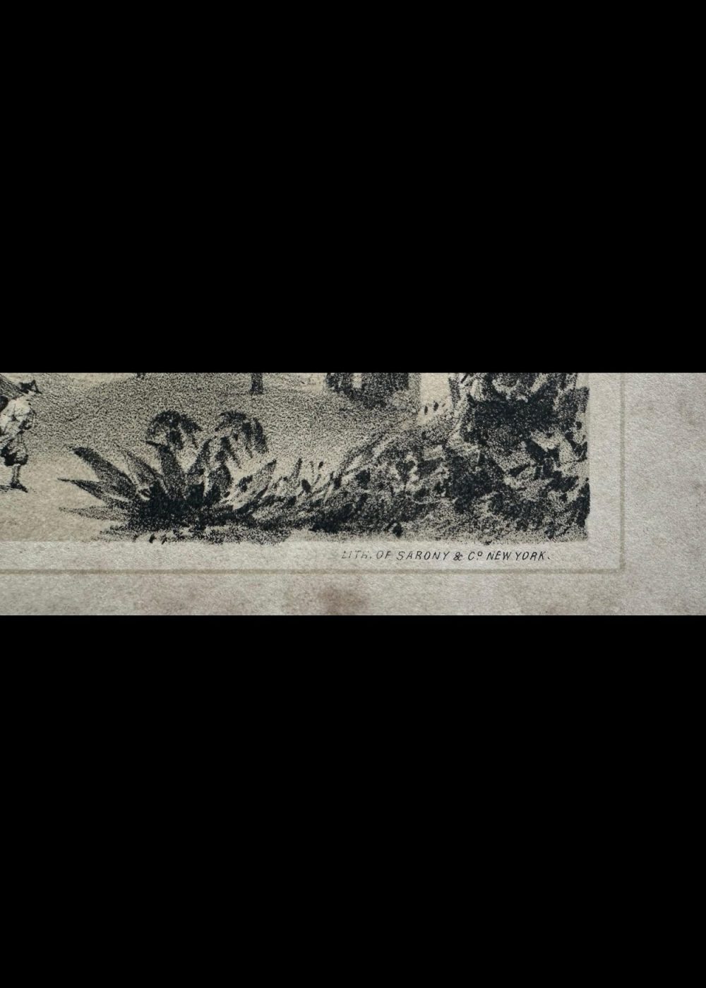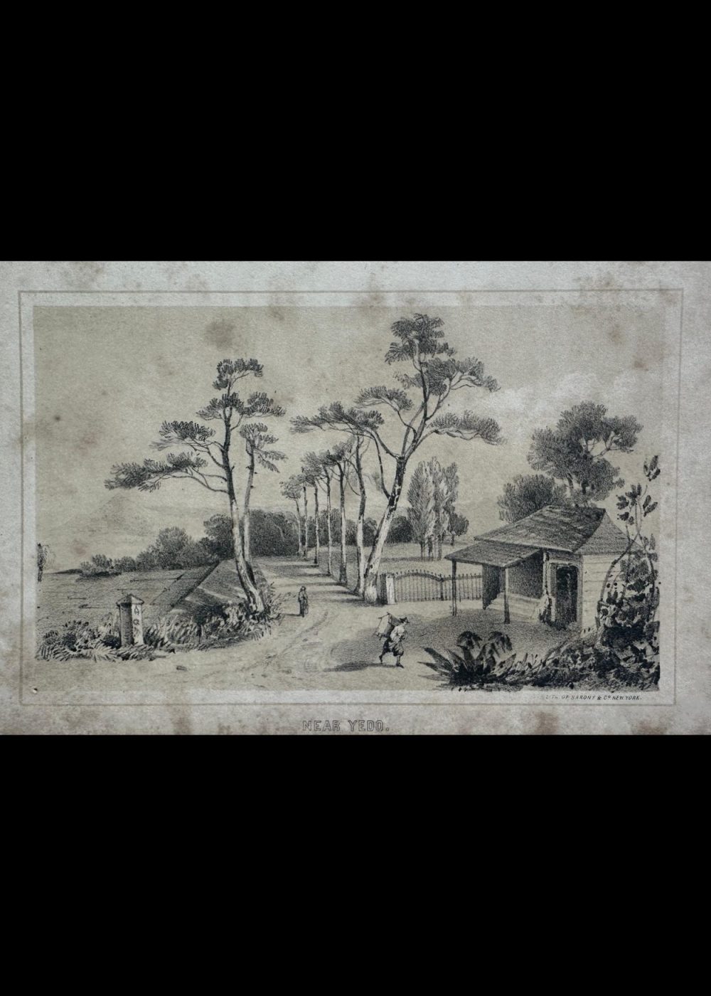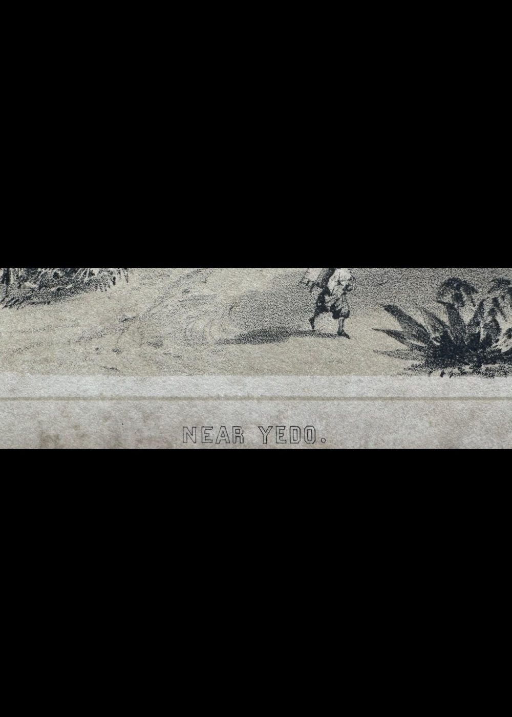 This monochrome lithograph titled “Near Yeddo” (an old Western name for Edo, now Tokyo) captures a tranquil rural scene in 19th-century Japan. The composition features a dirt pathway flanked by tall, slender trees leading toward a fenced estate. On the right, a simple wooden structure with a tiled roof stands beside lush vegetation, possibly serving as a rest stop or gatekeeper’s hut. Two figures are visible—one carrying traditional Japanese baskets on a yoke and another walking down the tree-lined path—adding life to the serene countryside setting. The artwork was lithographed by Sarony & Co., New York, indicating its likely Western production based on Eastern subjects, reflecting Western fascination with Japan during the late Edo period. The piece is rich in historical and cultural value, offering a romanticized glimpse into rural Japan before modernization.