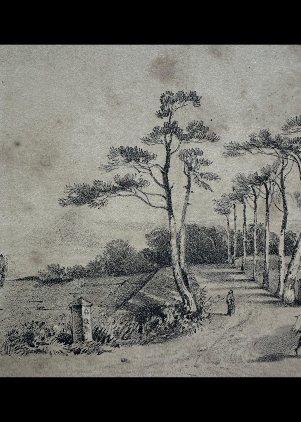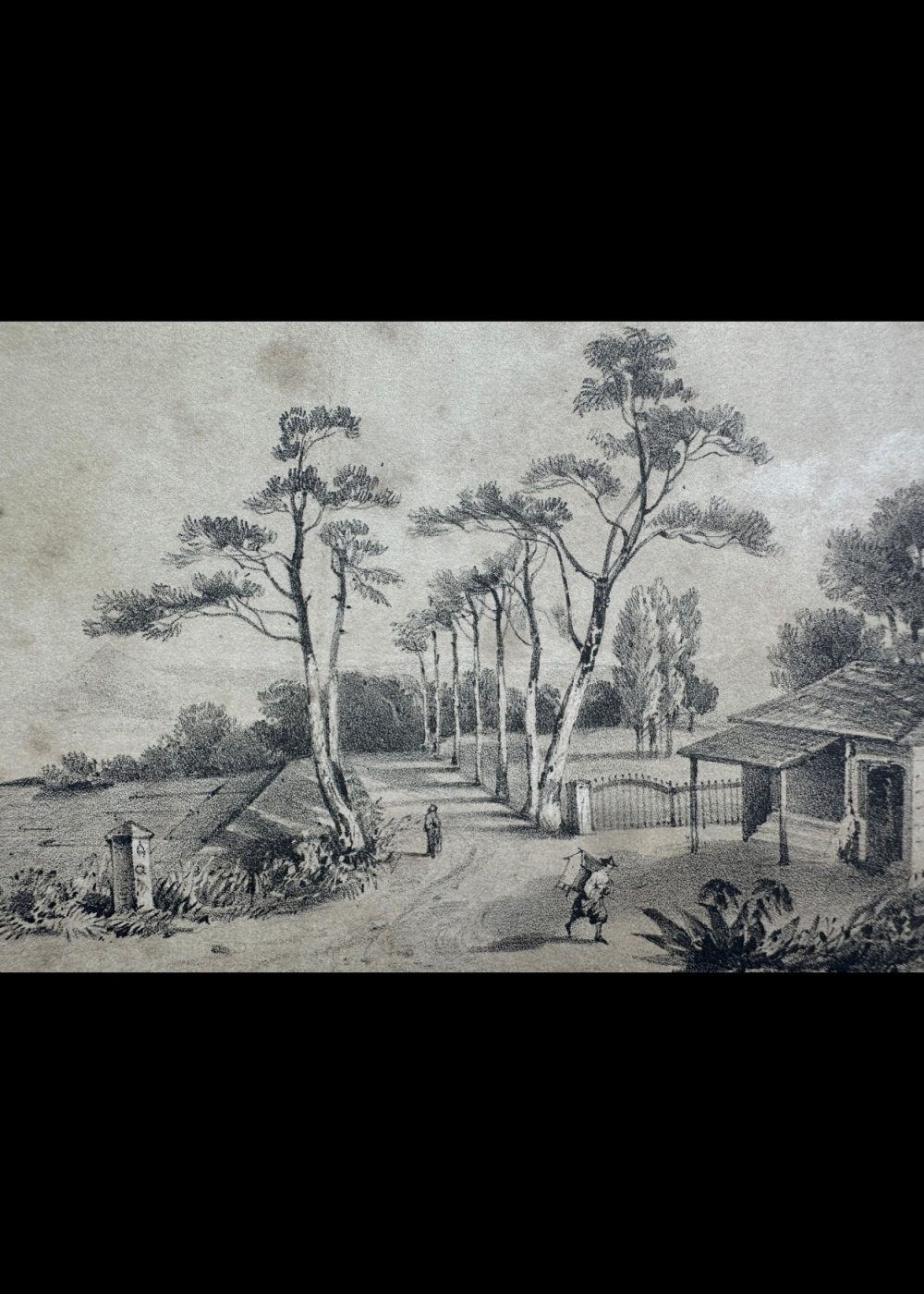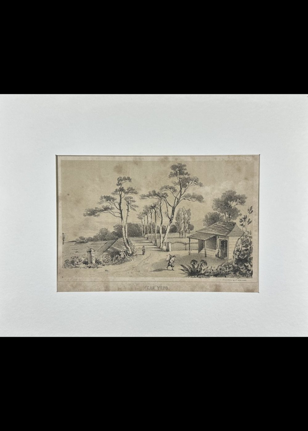 This monochrome lithograph titled “Near Yeddo” (an old Western name for Edo, now Tokyo) captures a tranquil rural scene in 19th-century Japan. The composition features a dirt pathway flanked by tall, slender trees leading toward a fenced estate. On the right, a simple wooden structure with a tiled roof stands beside lush vegetation, possibly serving as a rest stop or gatekeeper’s hut. Two figures are visible—one carrying traditional Japanese baskets on a yoke and another walking down the tree-lined path—adding life to the serene countryside setting. The artwork was lithographed by Sarony & Co., New York, indicating its likely Western production based on Eastern subjects, reflecting Western fascination with Japan during the late Edo period. The piece is rich in historical and cultural value, offering a romanticized glimpse into rural Japan before modernization.