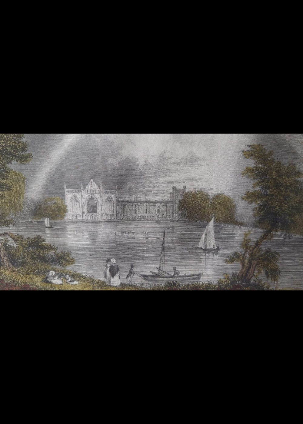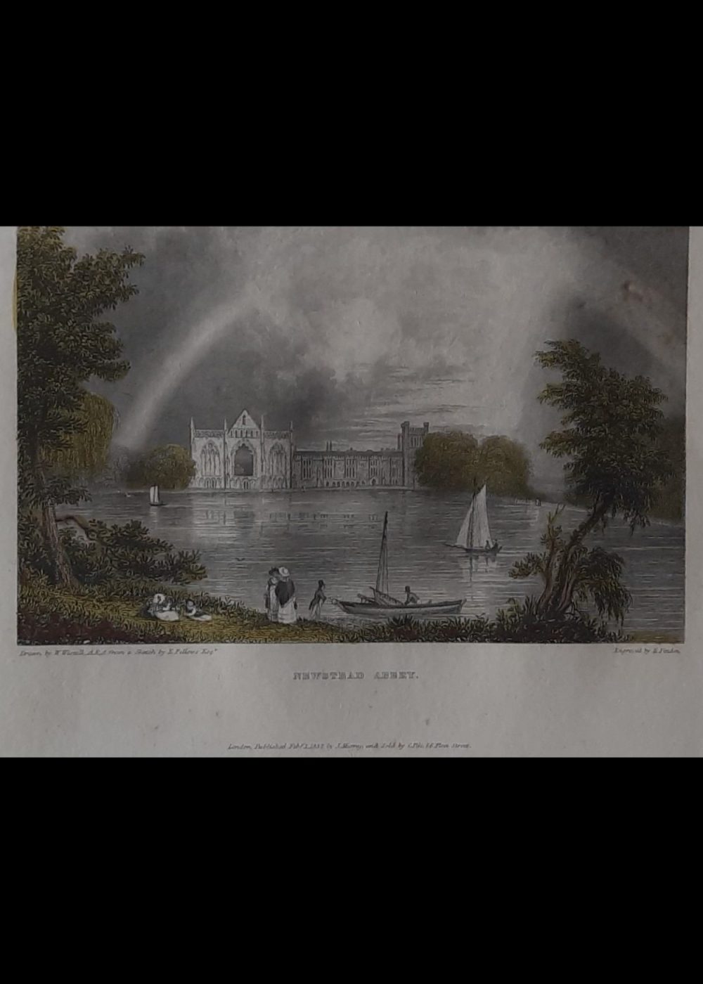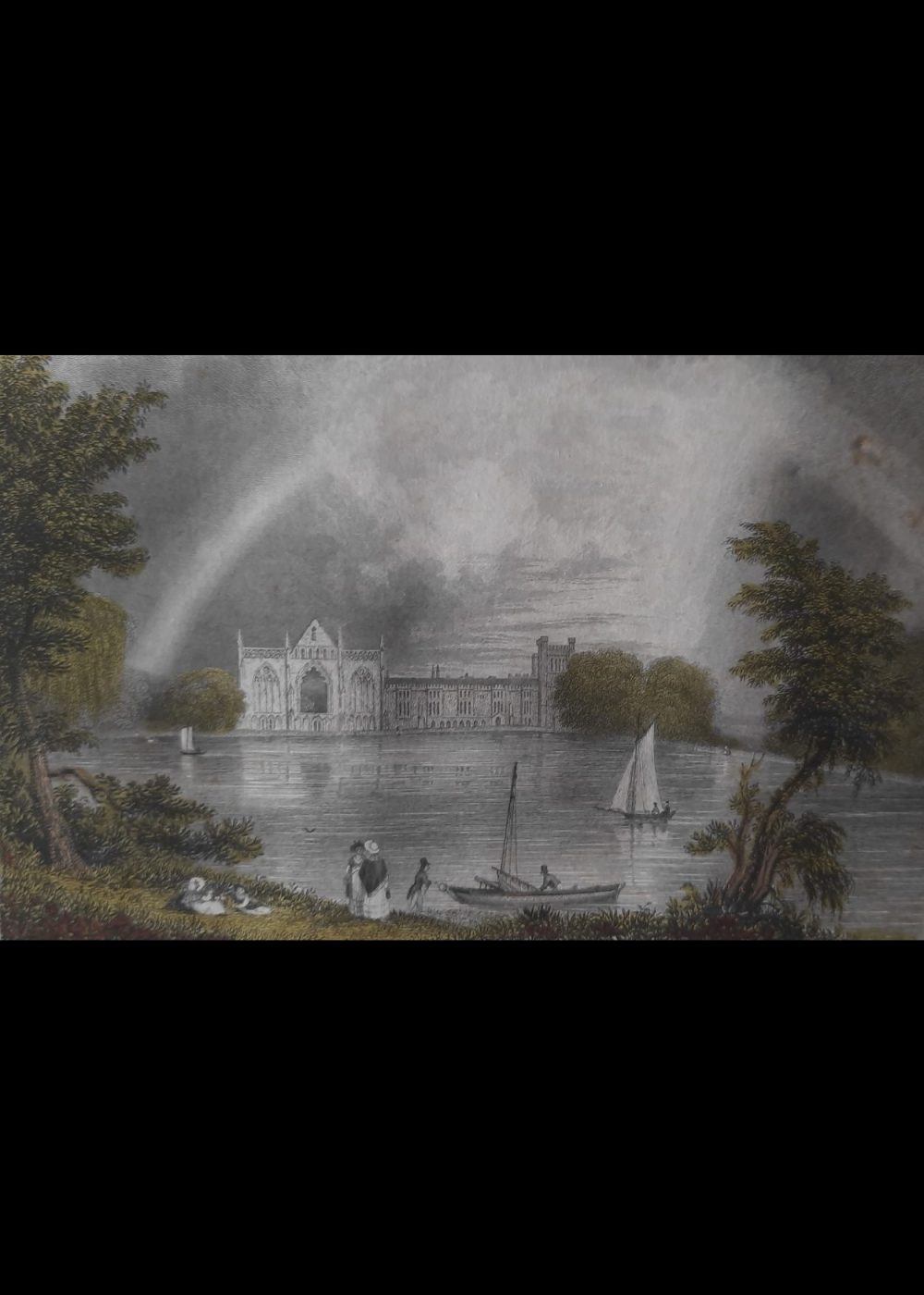 This is a 19th-century hand-colored engraving titled “Newstead Abbey”, drawn by T. Allom after a sketch by E. Fellows, and engraved by J. Tingle. The view features the historic Newstead Abbey—once a monastic house and later the ancestral home of poet Lord Byron—set against a dramatic sky with a vivid rainbow. The abbey’s Gothic facade reflects on a serene lake where small sailboats glide, while figures in the foreground enjoy the picturesque scenery. Published in 1834 by Fisher, Son & Co., London, this romantic depiction emphasizes both the architectural grandeur and tranquil natural beauty of the site.