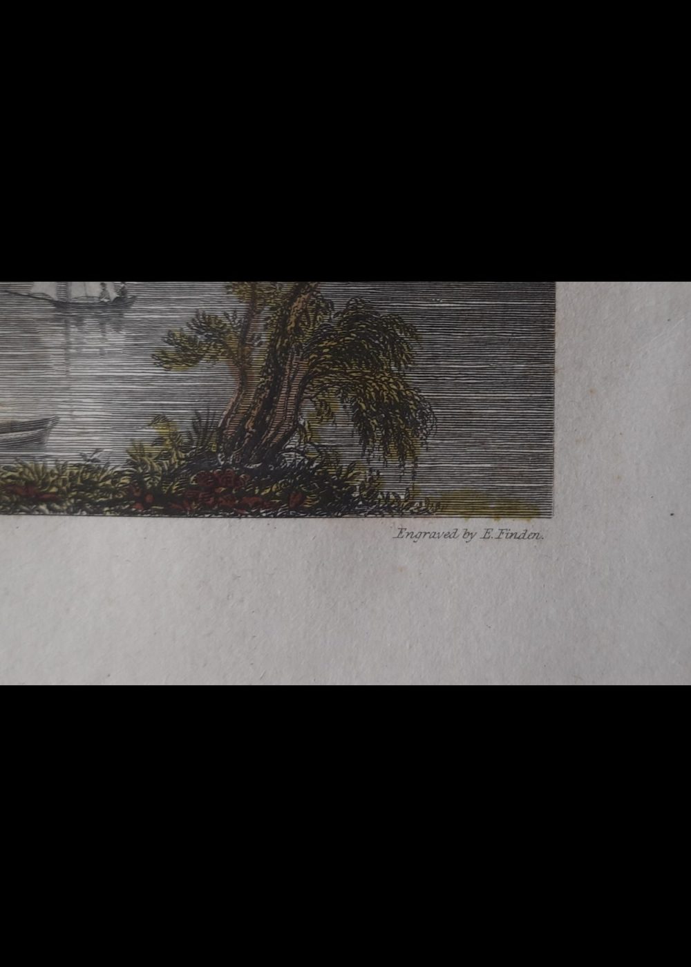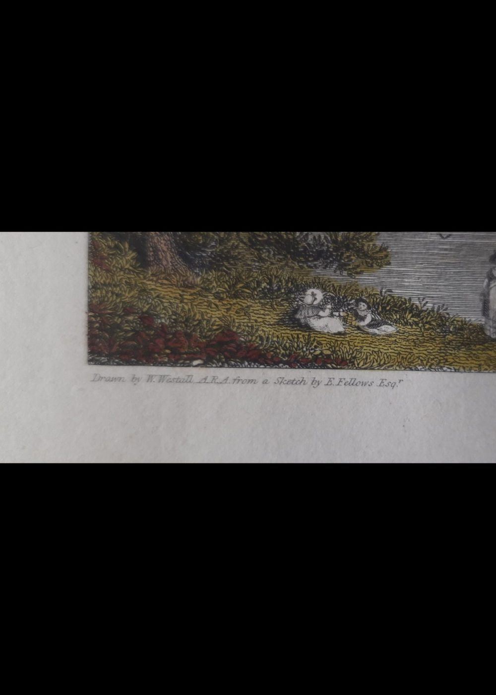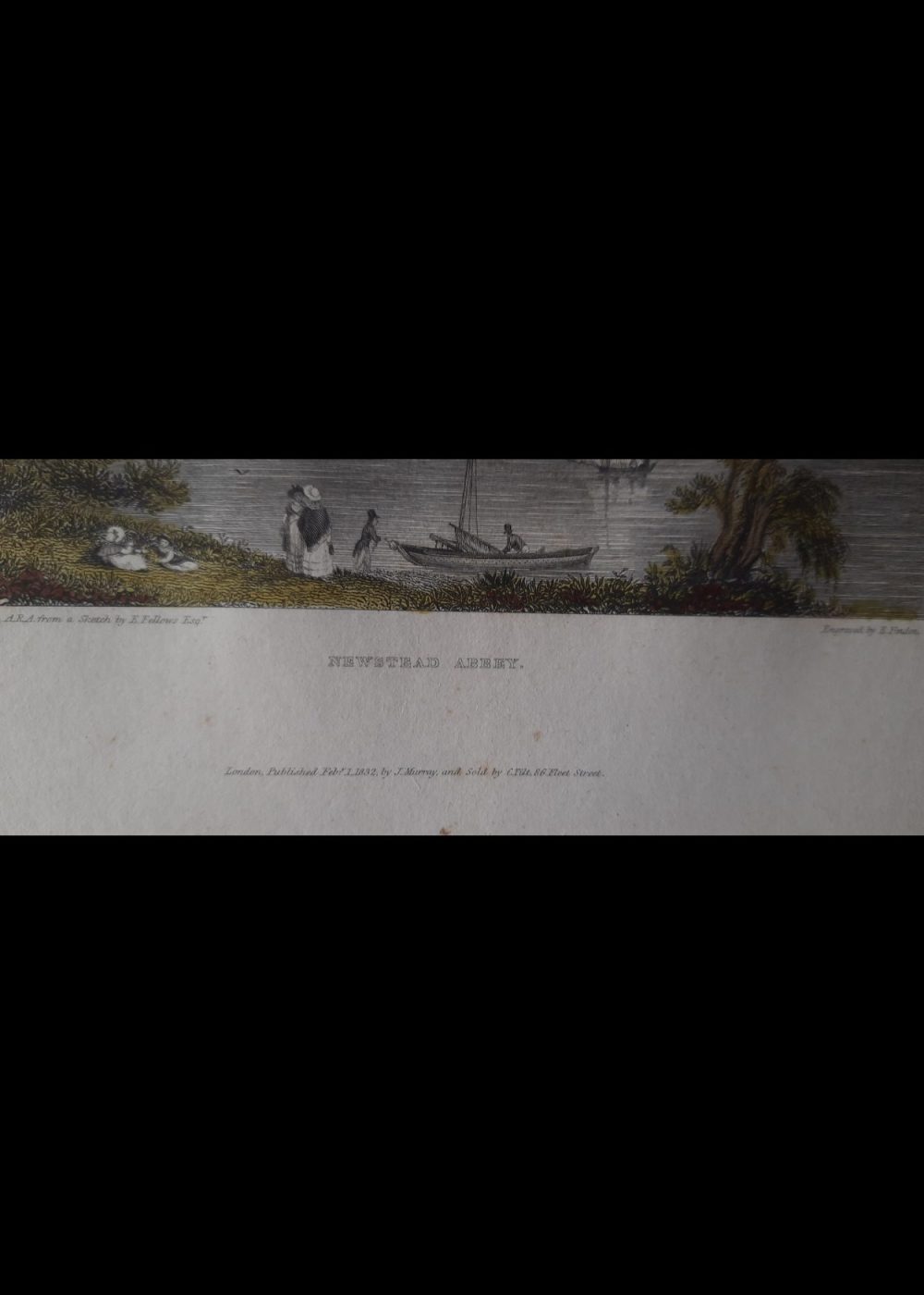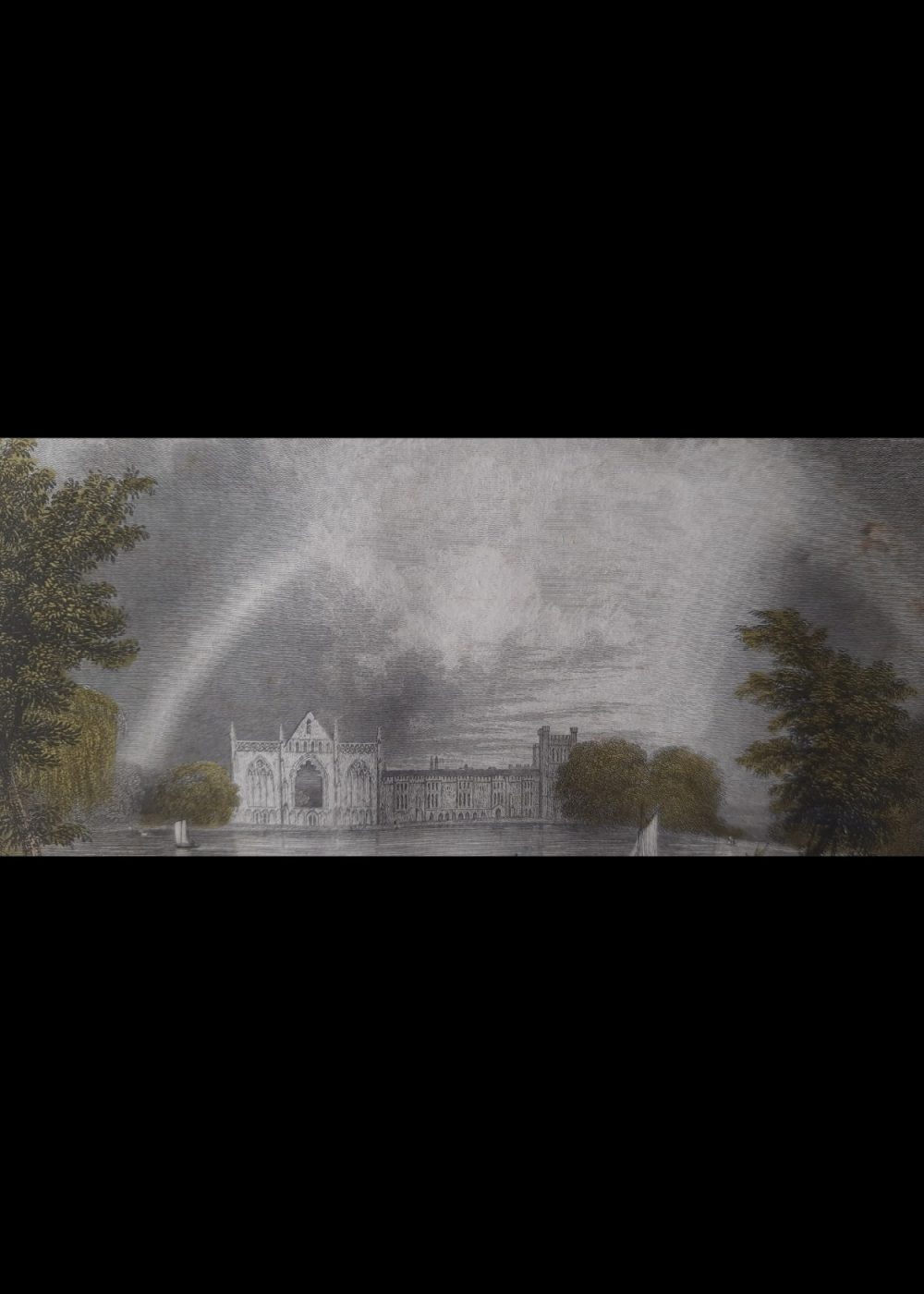 This is a 19th-century hand-colored engraving titled “Newstead Abbey”, drawn by T. Allom after a sketch by E. Fellows, and engraved by J. Tingle. The view features the historic Newstead Abbey—once a monastic house and later the ancestral home of poet Lord Byron—set against a dramatic sky with a vivid rainbow. The abbey’s Gothic facade reflects on a serene lake where small sailboats glide, while figures in the foreground enjoy the picturesque scenery. Published in 1834 by Fisher, Son & Co., London, this romantic depiction emphasizes both the architectural grandeur and tranquil natural beauty of the site.