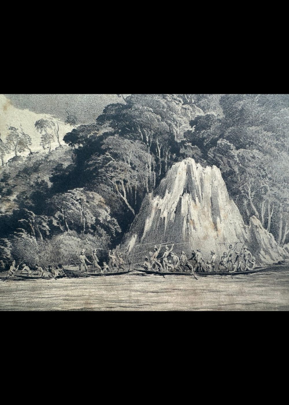 This vintage sepia-toned illustration captures a sweeping coastal scene of Mount Adolphus, located at the northeast end of Prince of Wales Island. A rugged cliff rises above dense, tree-covered terrain, dominating the composition with natural majesty. In the foreground, several boats row across gentle waters, adding a human presence to the tranquil landscape. The artwork blends exploration and geography, offering a nostalgic window into 19th-century maritime observation near the Torres Strait.
