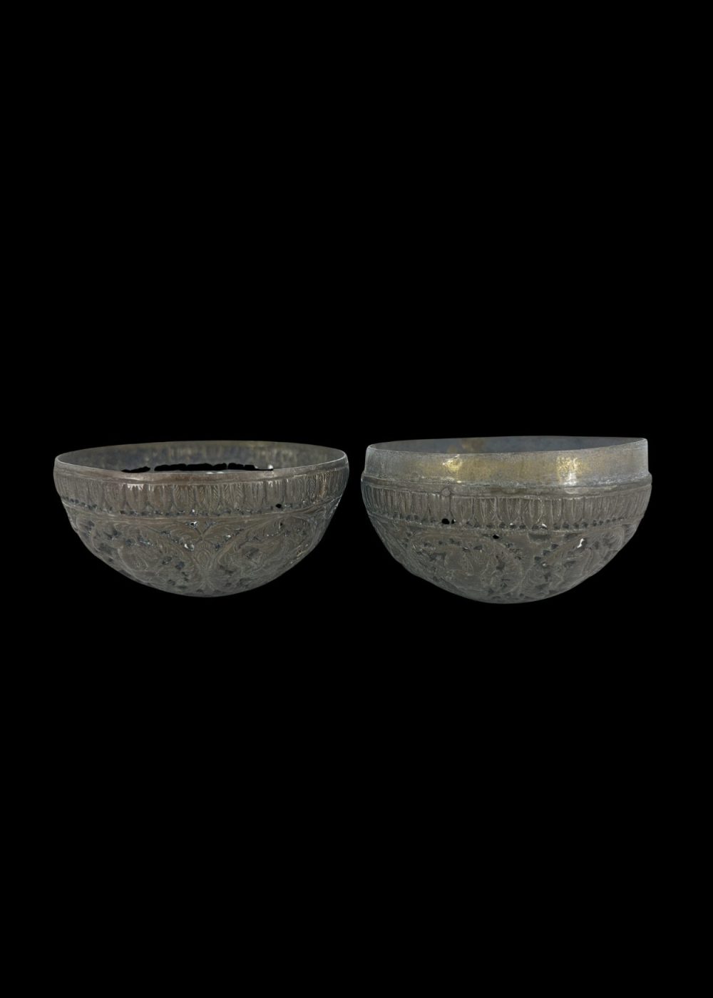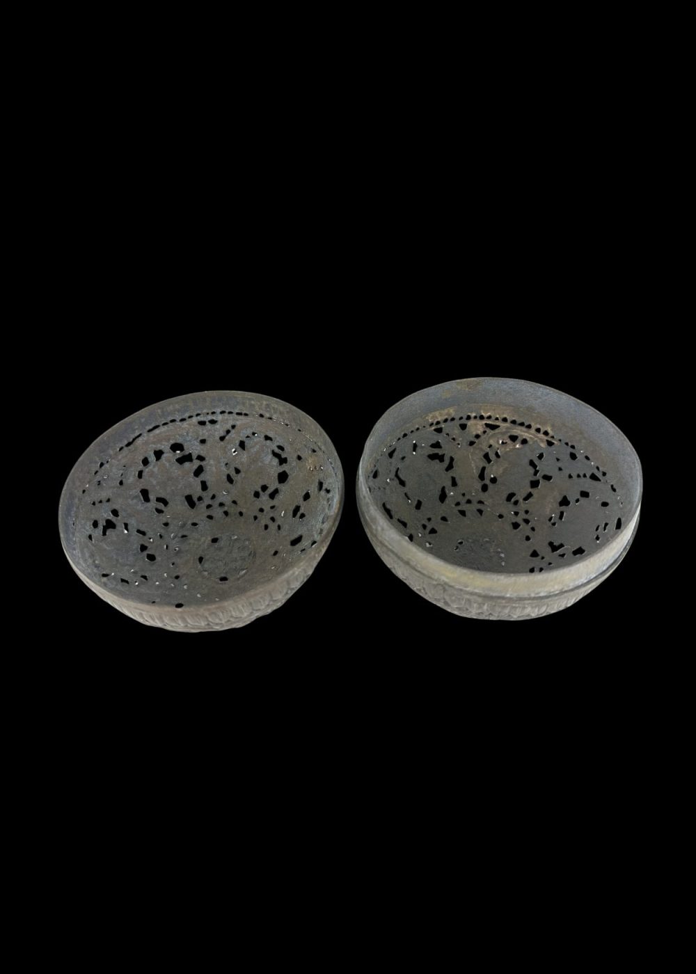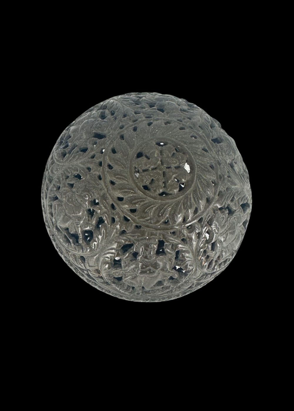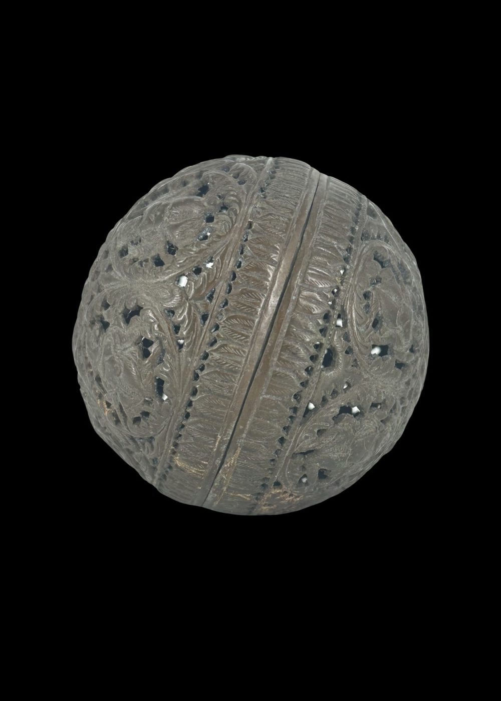 This finely crafted bronze night lamp from Karnataka showcases the region’s exceptional metalworking traditions and artistic finesse. Shaped into a hollow sphere, the lamp features delicate openwork (jali) with intricate floral and foliate motifs, allowing light to gently filter through its patterned surface. Designed to hold a small flame or oil lamp within, it would emit a soft, diffused glow—ideal for night-time use. Such lamps were not only functional but also ornamental, often used in homes and temples to create a serene and sacred ambiance. The craftsmanship reflects both utility and an appreciation for beauty in daily life.