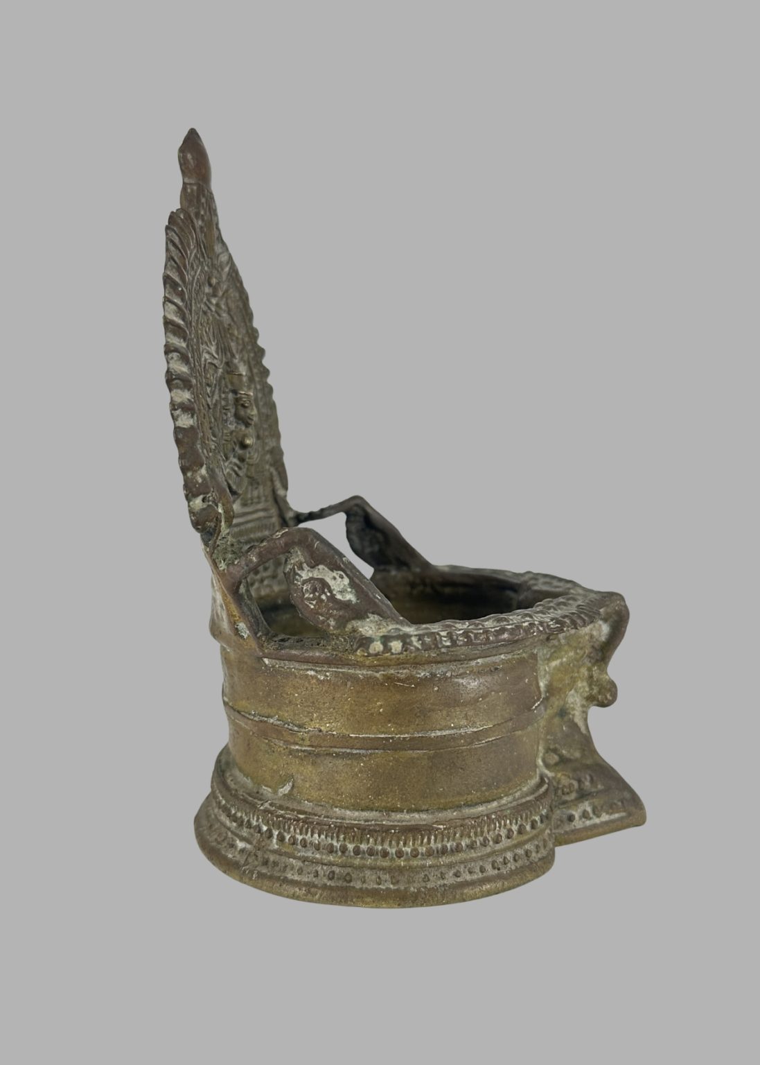 This finely crafted bronze night lamp from Karnataka showcases the region’s exceptional metalworking traditions and artistic finesse. Shaped into a hollow sphere, the lamp features delicate openwork (jali) with intricate floral and foliate motifs, allowing light to gently filter through its patterned surface. Designed to hold a small flame or oil lamp within, it would emit a soft, diffused glow—ideal for night-time use. Such lamps were not only functional but also ornamental, often used in homes and temples to create a serene and sacred ambiance. The craftsmanship reflects both utility and an appreciation for beauty in daily life.