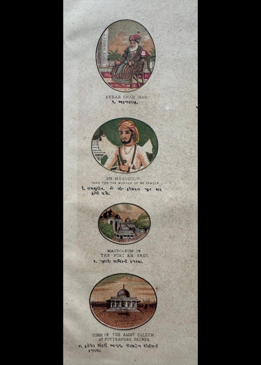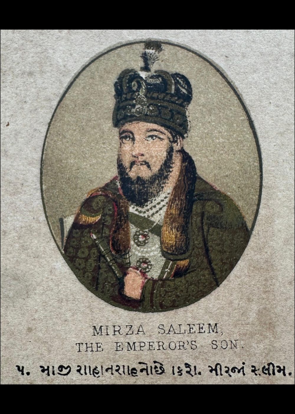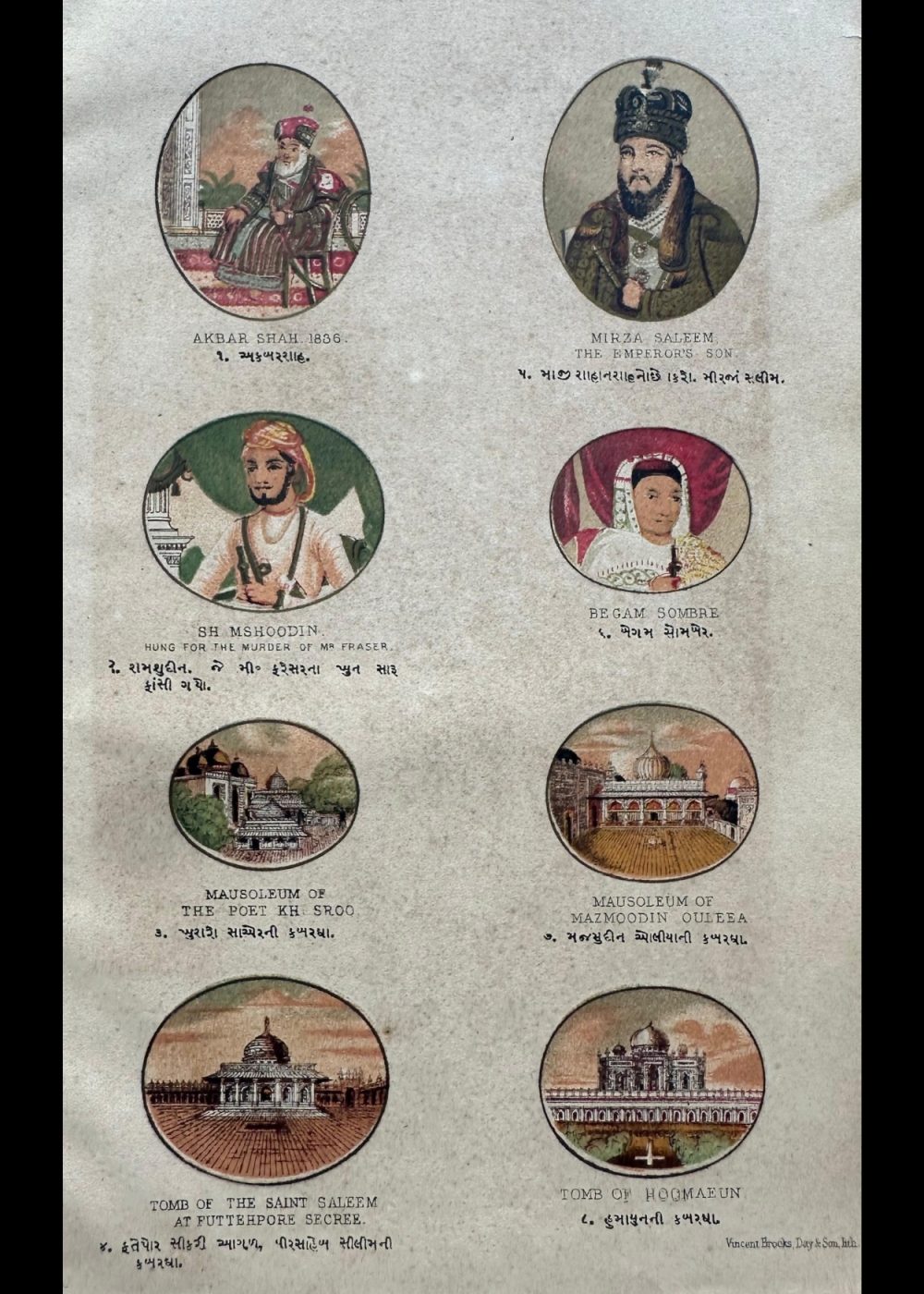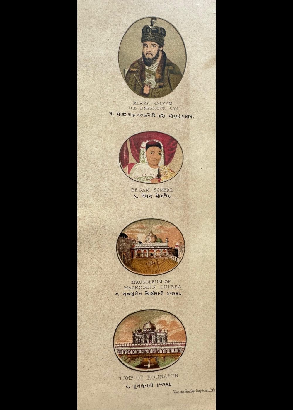 This vibrant cromo-lithograph, titled “The Late Emperor of Delhi,” features a portrait of a Mughal emperor, likely Bahadur Shah Zafar, the last ruler of the Mughal Empire. The image showcases the emperor adorned in an ornate robe and an intricately designed crown, richly embellished with gemstones and feathers, reflecting the opulence of the Mughal court. The detailed color work brings out the emperor’s dignified appearance, with a wise and serene expression. Created by Vincent Brooks Day & Son, this lithograph is part of a travel book that offers a glimpse into the grandeur and culturalThis cromo-lithograph, part of a “Travel of India” book, features a collection of portraits and monuments, each reflecting significant figures and architectural landmarks from India’s Mughal and colonial history.
