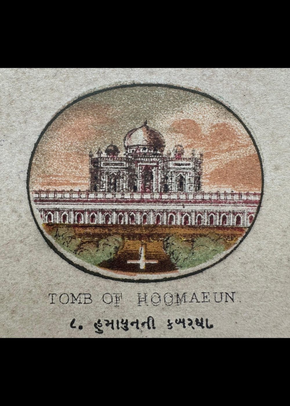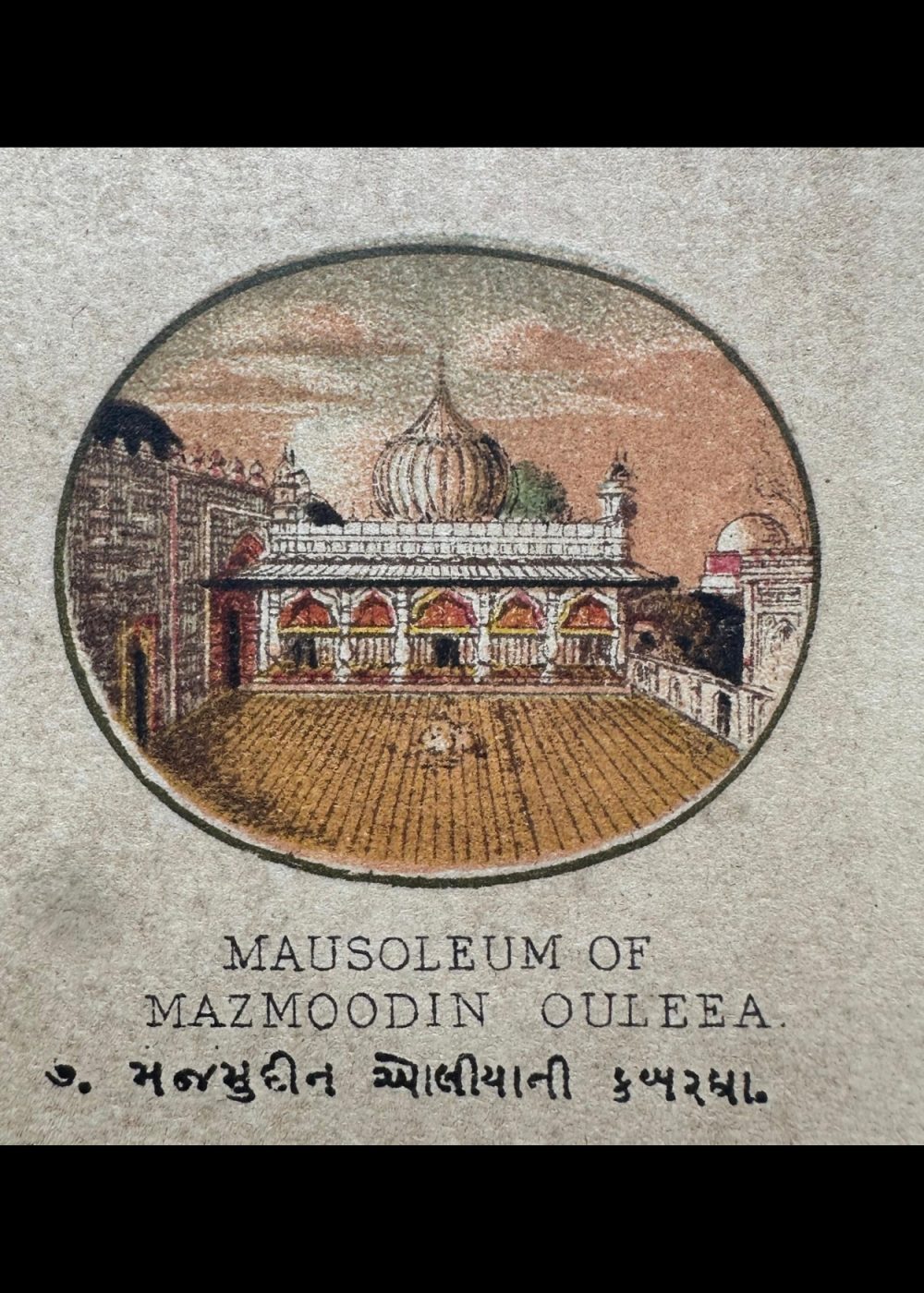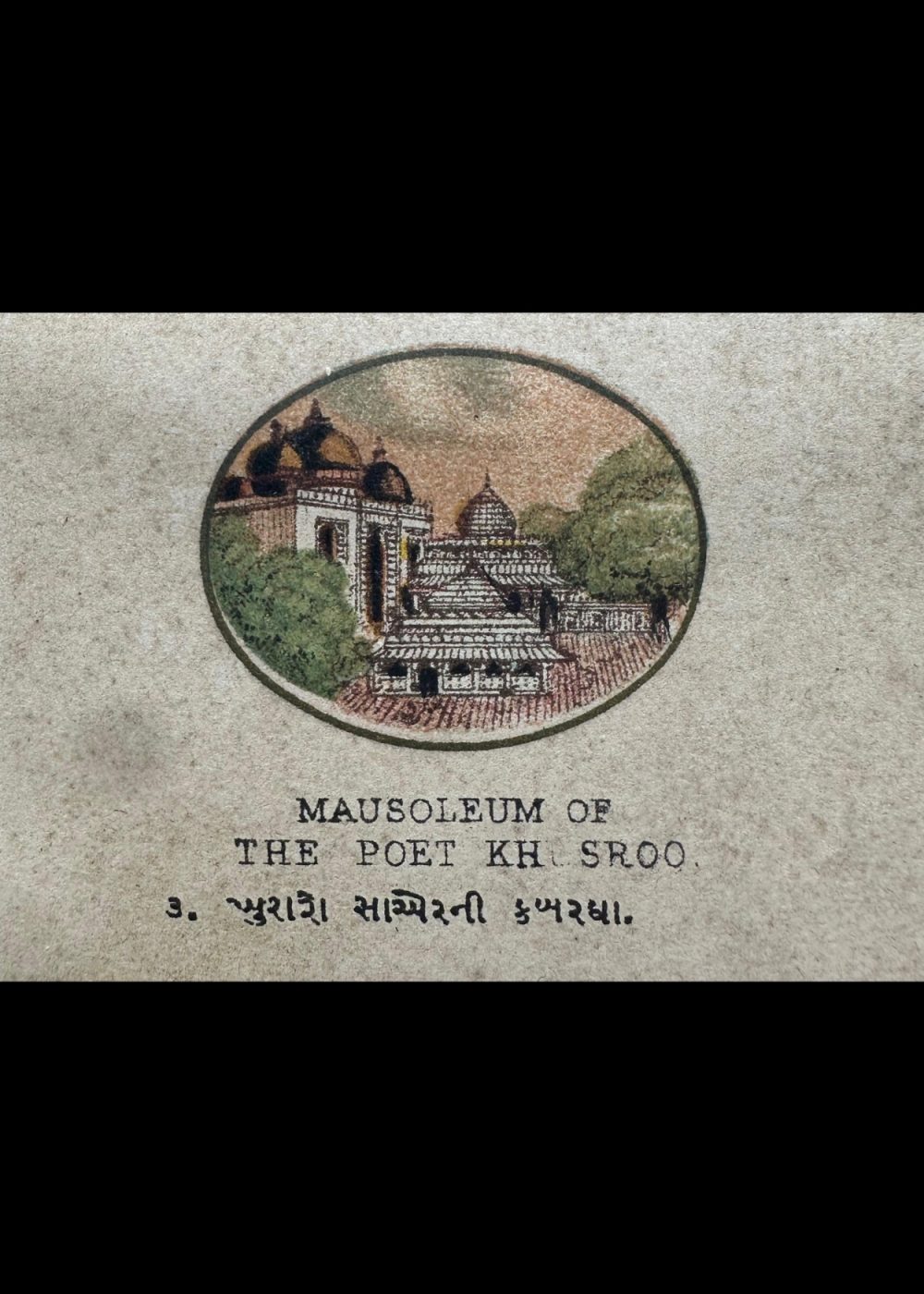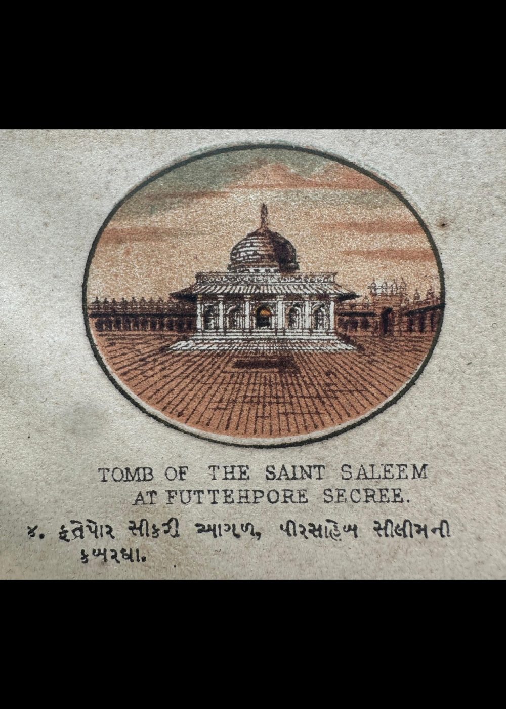 This vibrant cromo-lithograph, titled “The Late Emperor of Delhi,” features a portrait of a Mughal emperor, likely Bahadur Shah Zafar, the last ruler of the Mughal Empire. The image showcases the emperor adorned in an ornate robe and an intricately designed crown, richly embellished with gemstones and feathers, reflecting the opulence of the Mughal court. The detailed color work brings out the emperor’s dignified appearance, with a wise and serene expression. Created by Vincent Brooks Day & Son, this lithograph is part of a travel book that offers a glimpse into the grandeur and culturalThis cromo-lithograph, part of a “Travel of India” book, features a collection of portraits and monuments, each reflecting significant figures and architectural landmarks from India’s Mughal and colonial history.