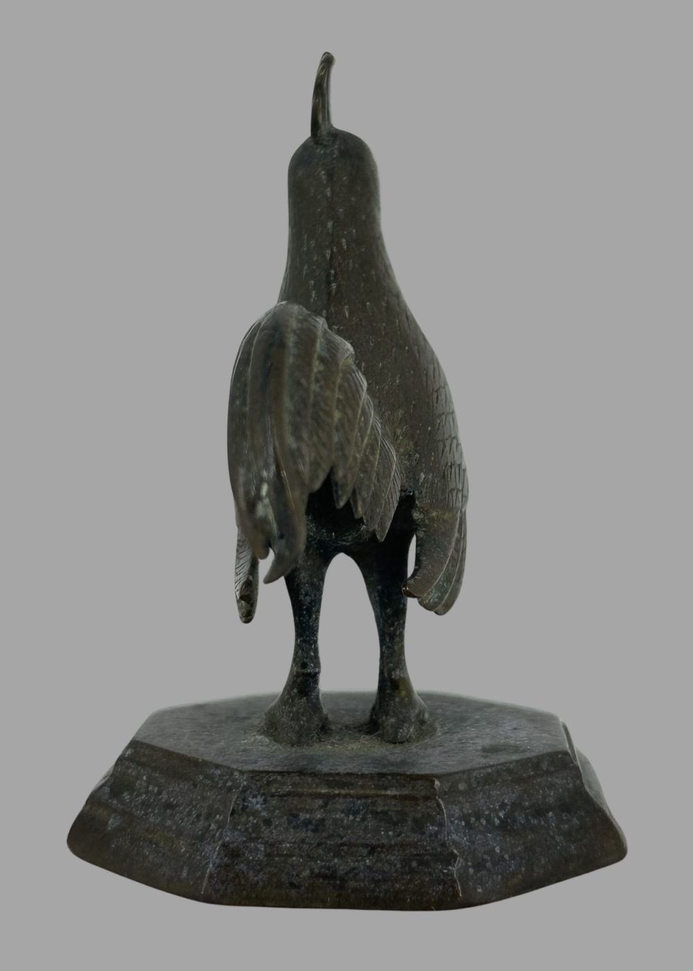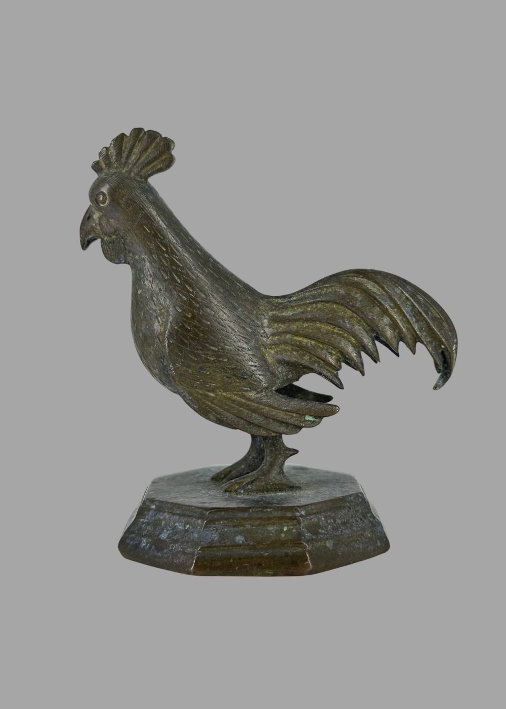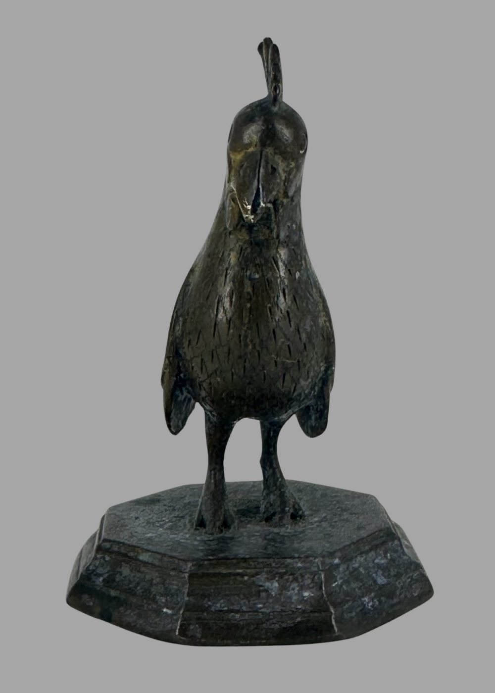 This bronze rooster from North India exemplifies the region’s enduring tradition of metal casting. Featuring intricate feather detailing and a confident stance atop a hexagonal base, the figurine reflects both folk symbolism and decorative artistry, where roosters often represent vigilance, prosperity, and protection.