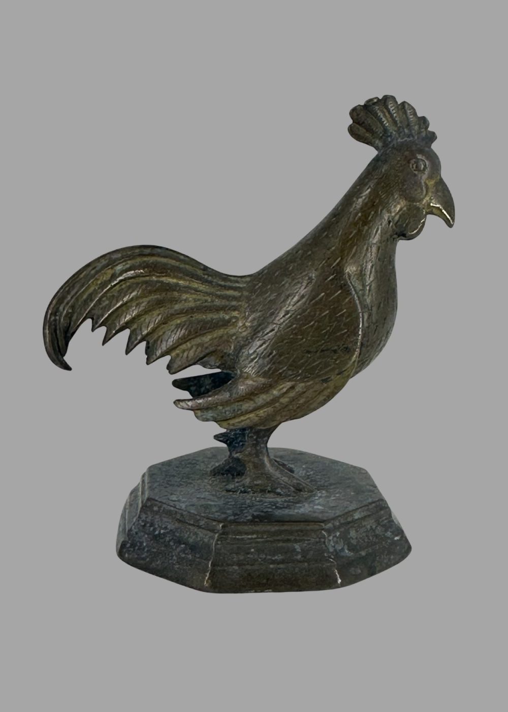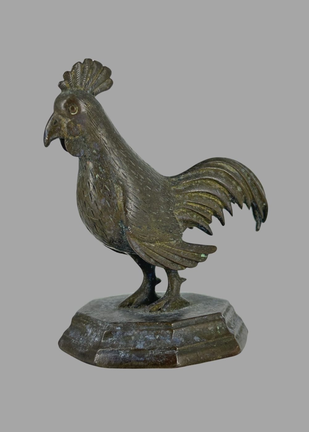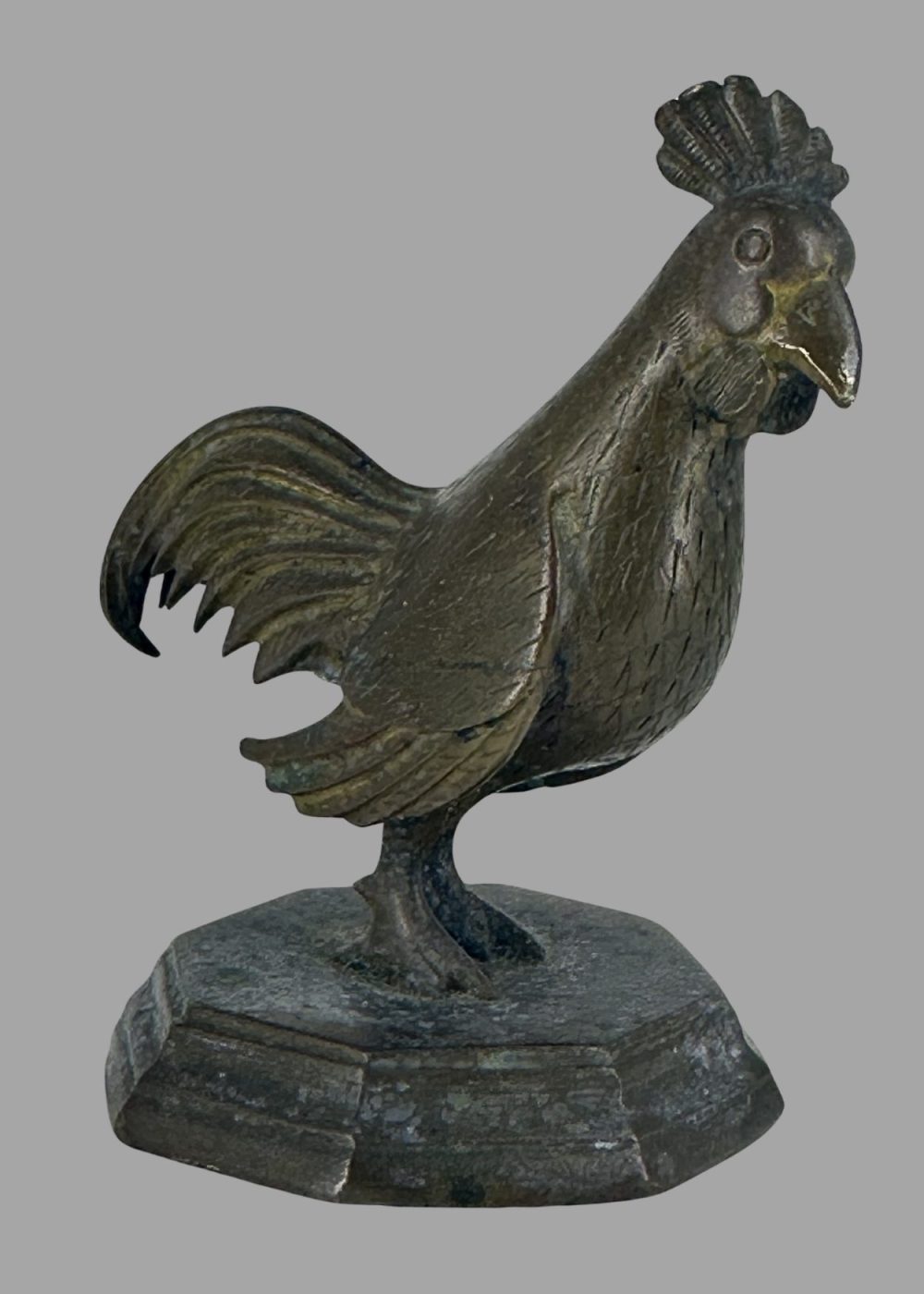 This bronze rooster from North India exemplifies the region’s enduring tradition of metal casting. Featuring intricate feather detailing and a confident stance atop a hexagonal base, the figurine reflects both folk symbolism and decorative artistry, where roosters often represent vigilance, prosperity, and protection.