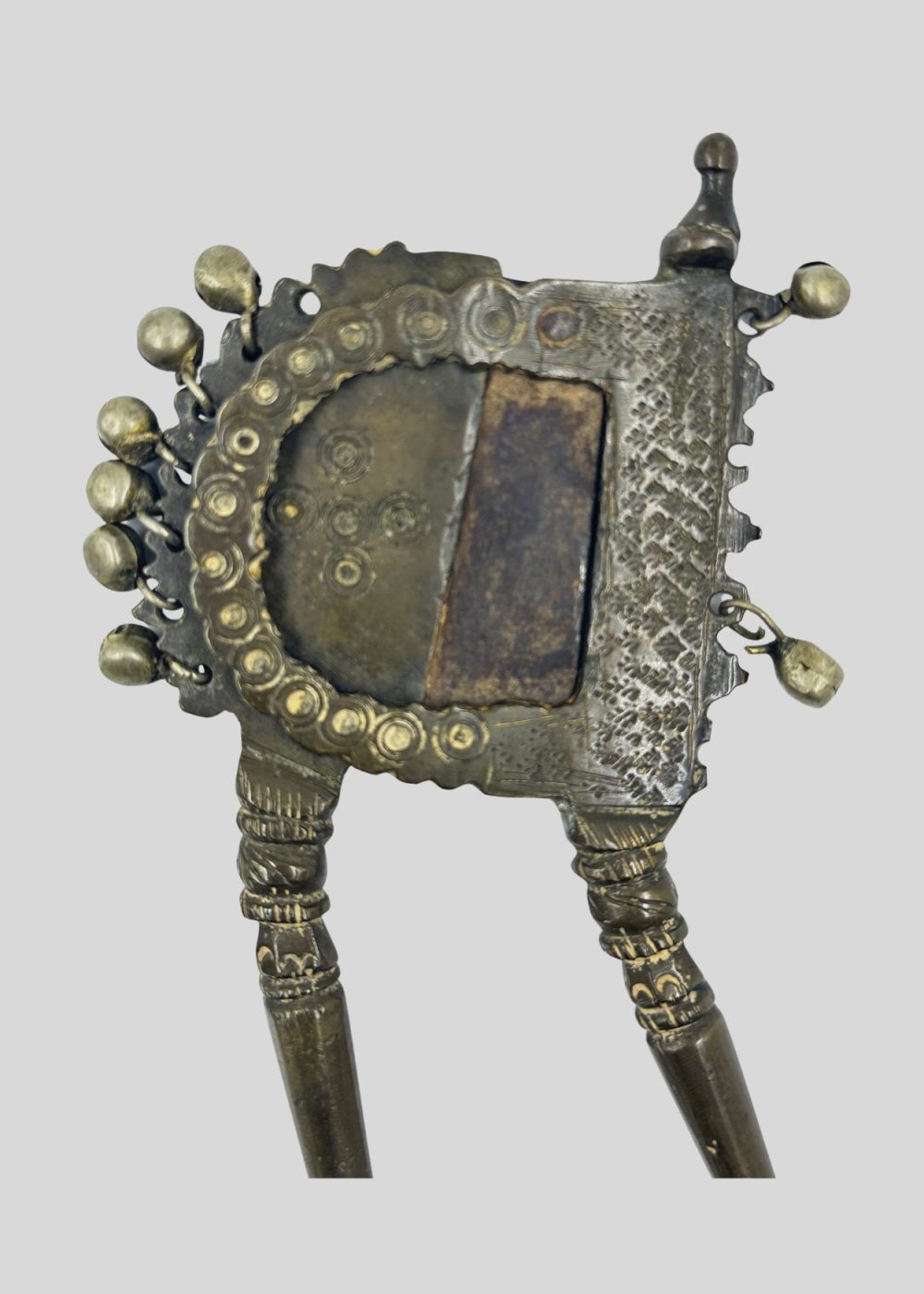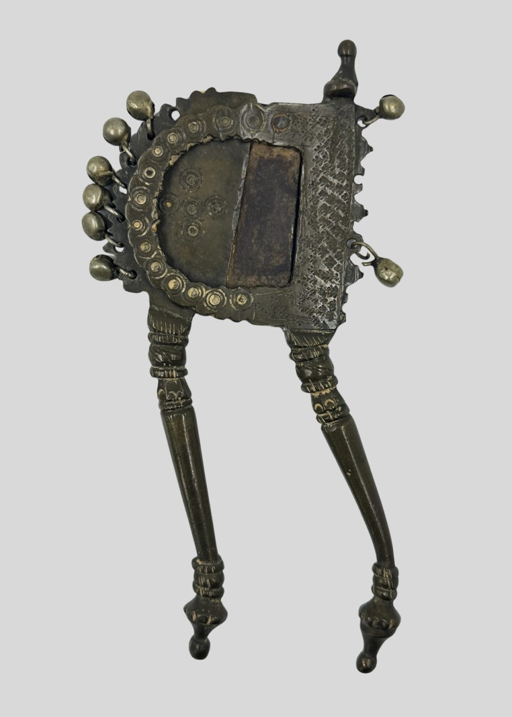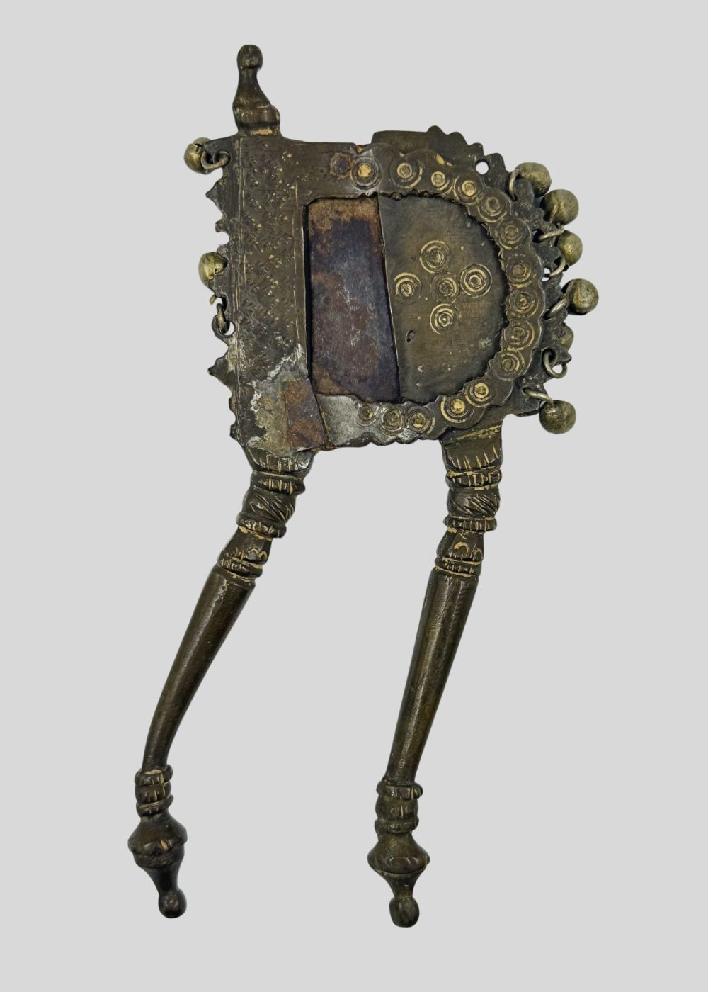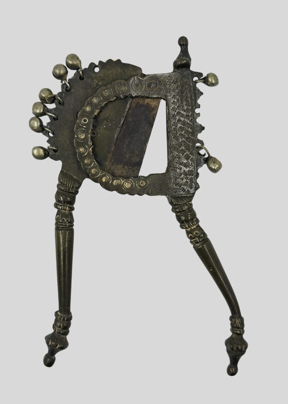 This cutter from North India, made from bronze, brass, and iron, exemplifies the region’s mastery in metal craftsmanship. Its ornate detailing and sculptural form reflect the artistic ingenuity and practical elegance characteristic of traditional Indian utilitarian objects.