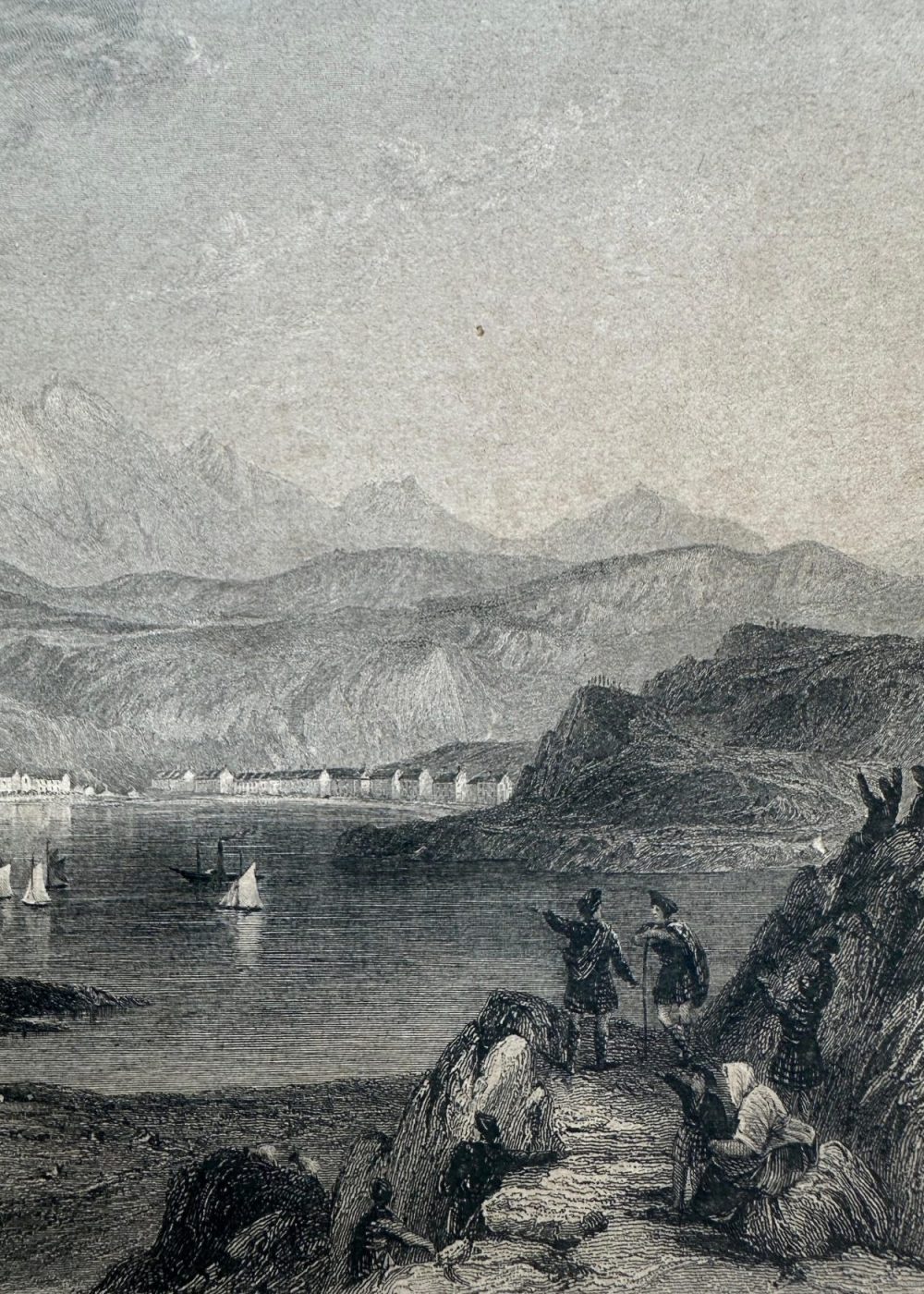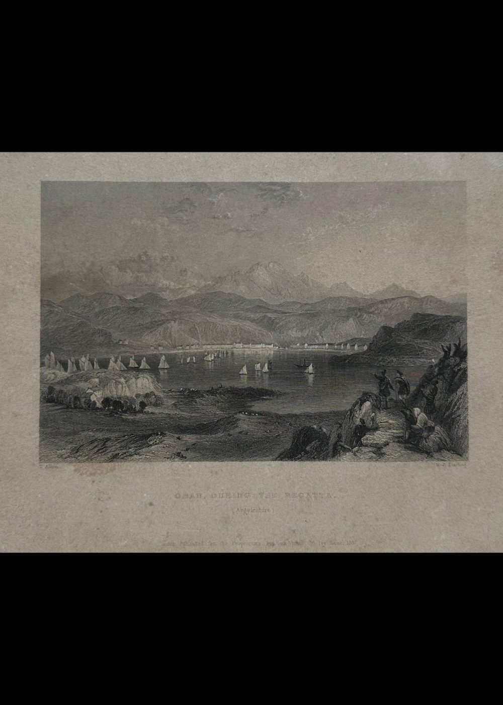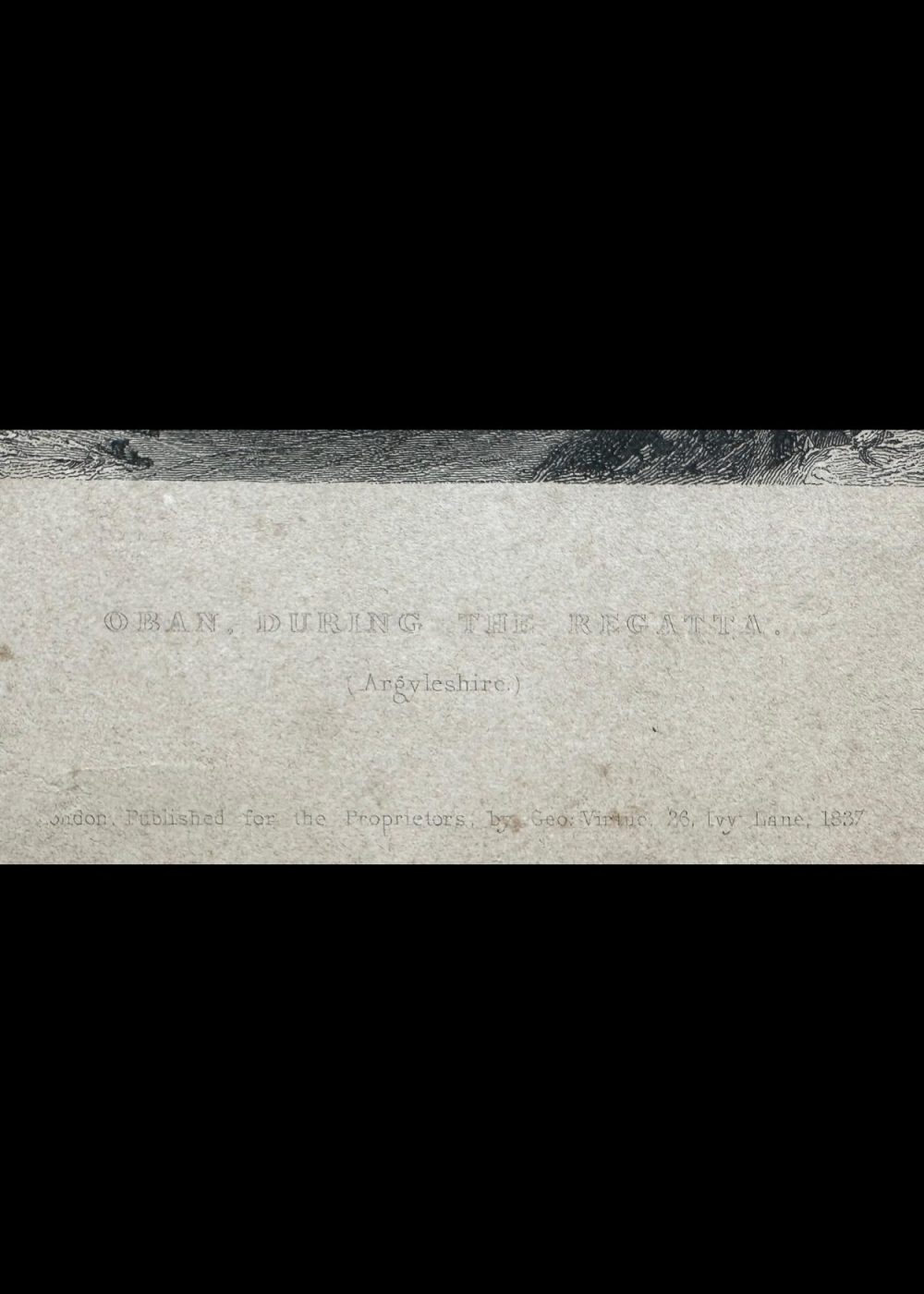 London, Published for the Proprietors, by Geo: Virtue, 26 Ivy Lane, 1837. This finely detailed 19th-century engraving captures a lively view of Oban, a coastal town in Argyllshire, Scotland, during a regatta. The scene is filled with numerous sailing vessels on the bay, set against a dramatic backdrop of rugged mountains. On the right, figures gather along a rocky hillside path, possibly spectators of the maritime event. Drawn by Thomas Allom and engraved by William Henry Starling, this work celebrates both the natural beauty and cultural vitality of the Scottish coast in the early Victorian period.