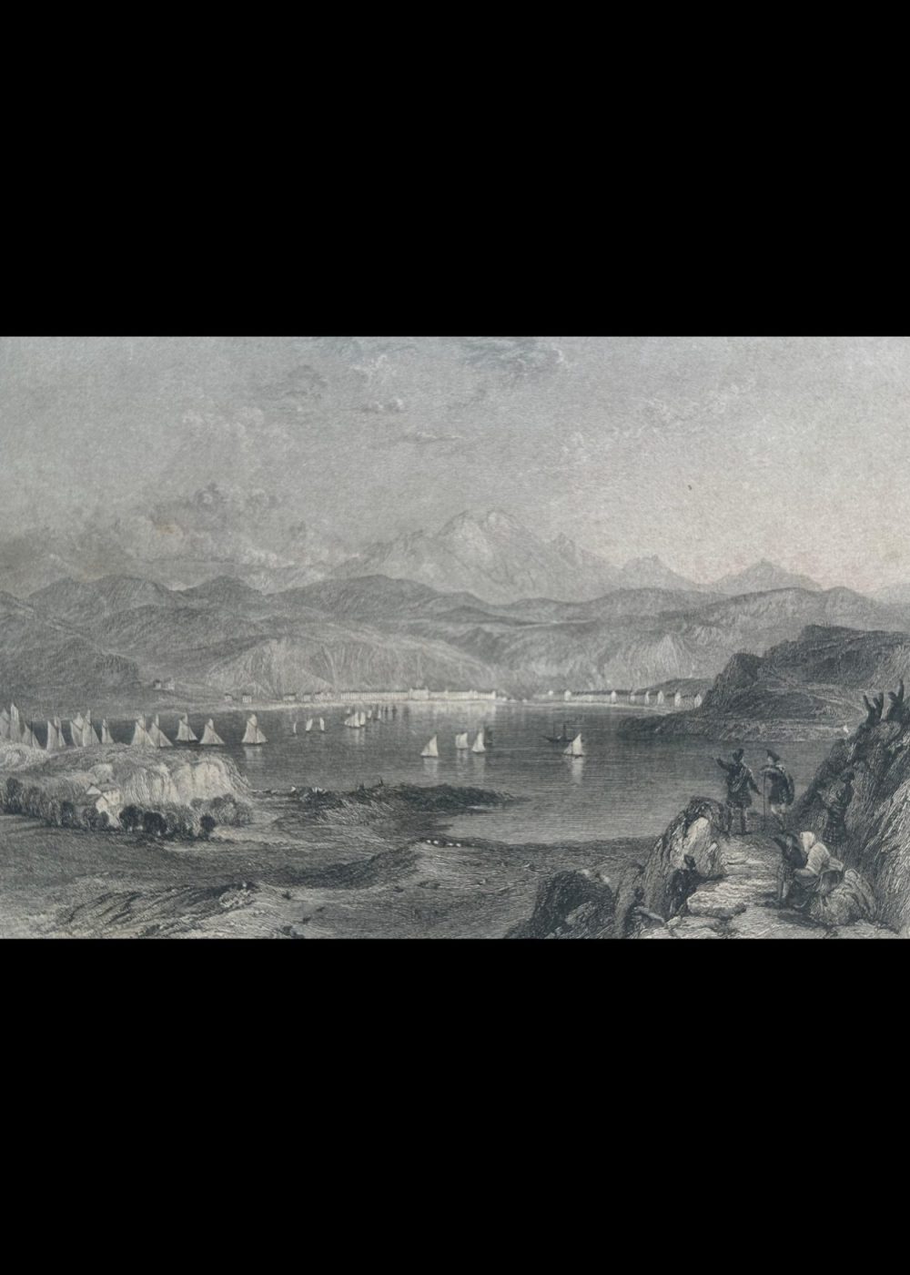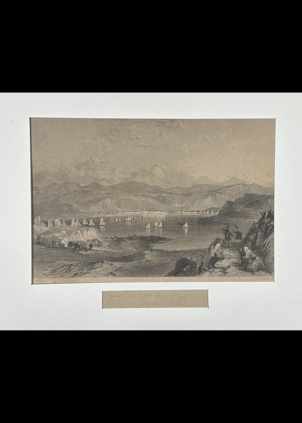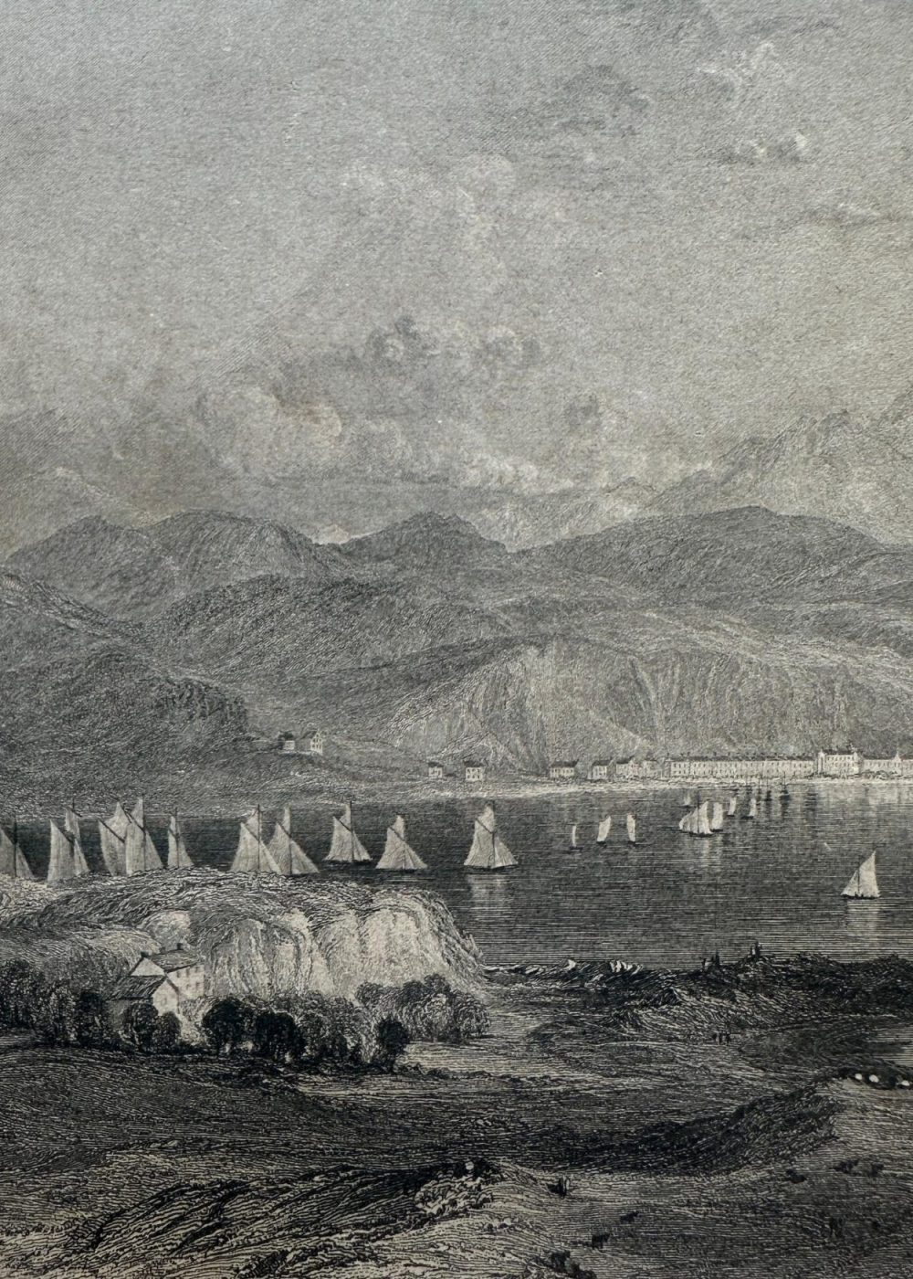 London, Published for the Proprietors, by Geo: Virtue, 26 Ivy Lane, 1837. This finely detailed 19th-century engraving captures a lively view of Oban, a coastal town in Argyllshire, Scotland, during a regatta. The scene is filled with numerous sailing vessels on the bay, set against a dramatic backdrop of rugged mountains. On the right, figures gather along a rocky hillside path, possibly spectators of the maritime event. Drawn by Thomas Allom and engraved by William Henry Starling, this work celebrates both the natural beauty and cultural vitality of the Scottish coast in the early Victorian period.