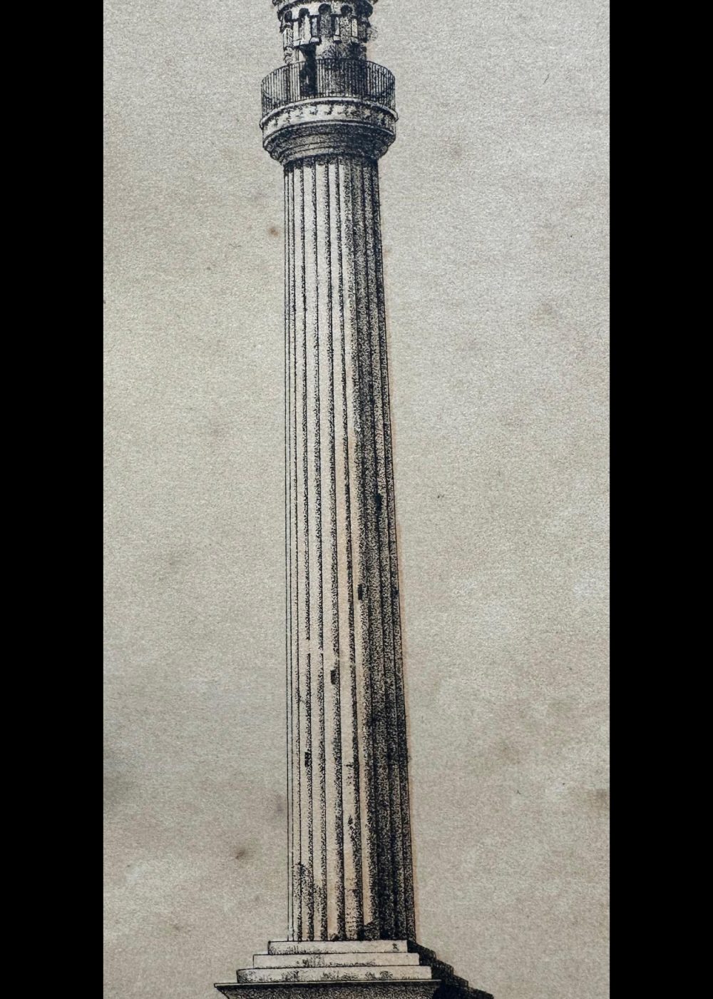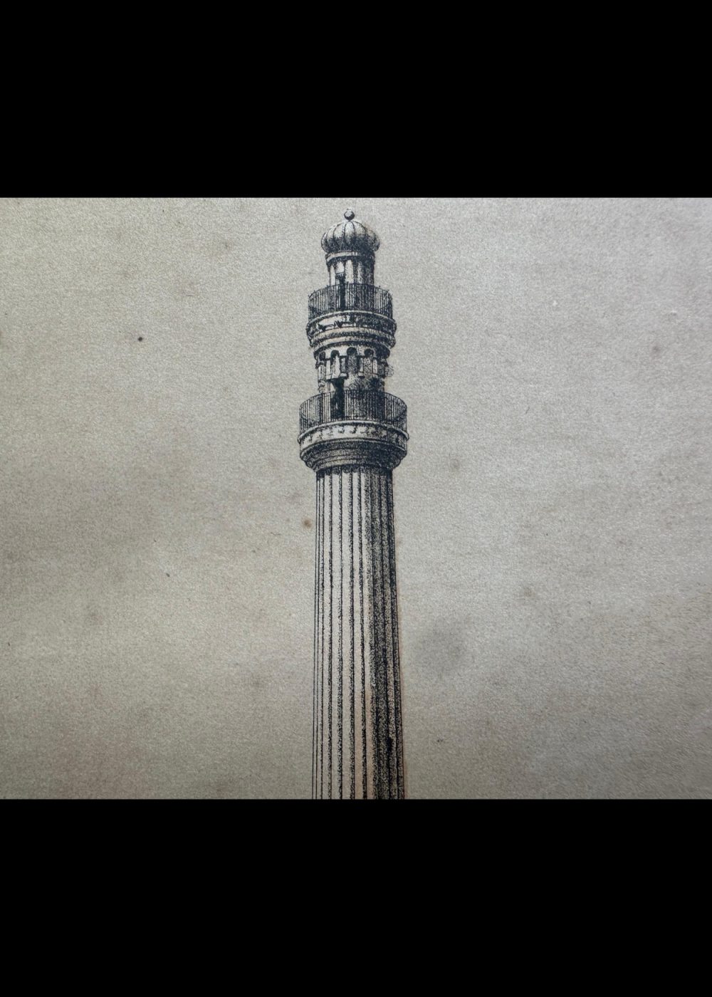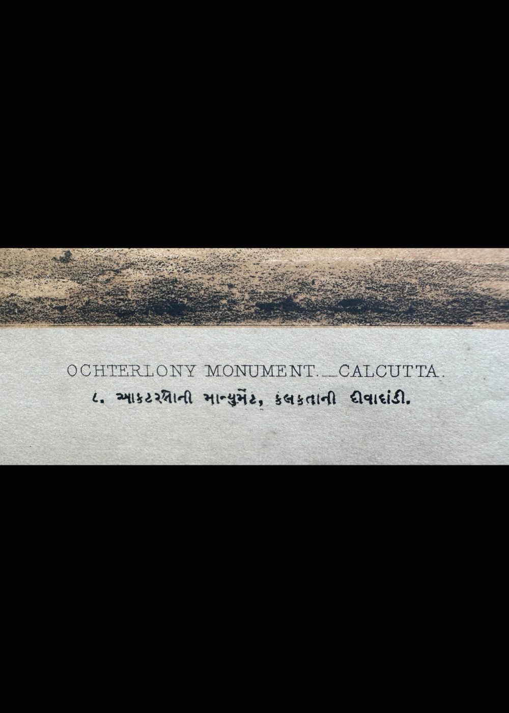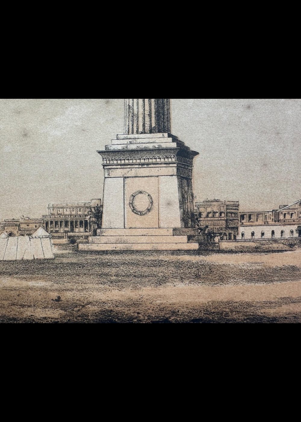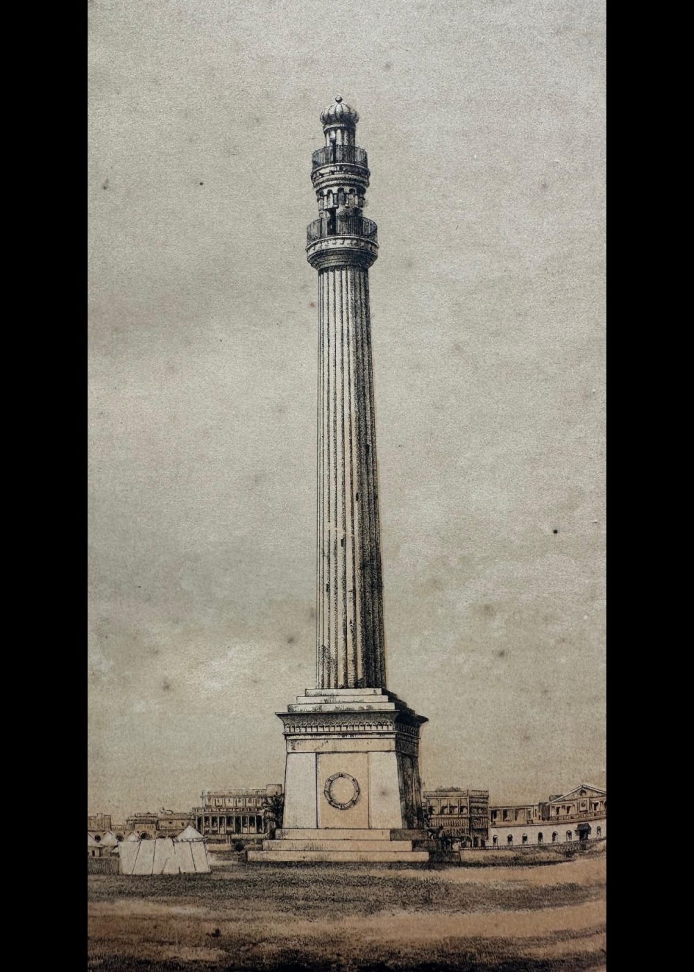 This chromo-lithograph depicts the Ochterlony Monument in Calcutta (now Kolkata), a significant landmark commemorating the British military officer, Sir David Ochterlony. The image showcases the tall, slender column with a crown-like structure at the top, surrounded by intricately designed stonework. The monument is placed on a pedestal, with detailed reliefs and a circular motif at the base. In the background, colonial-era buildings and tents add context to the scene, reflecting the historical atmosphere of the time. The lithograph, created by Vincent Brooks, captures the grandeur and architectural beauty of this colonial-era memorial, showcasing the art style of the period.