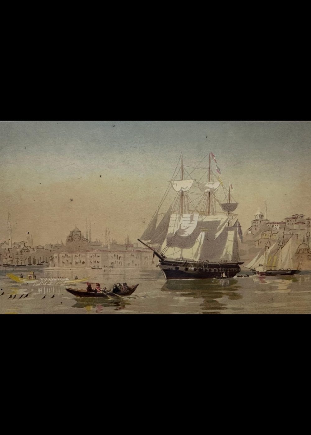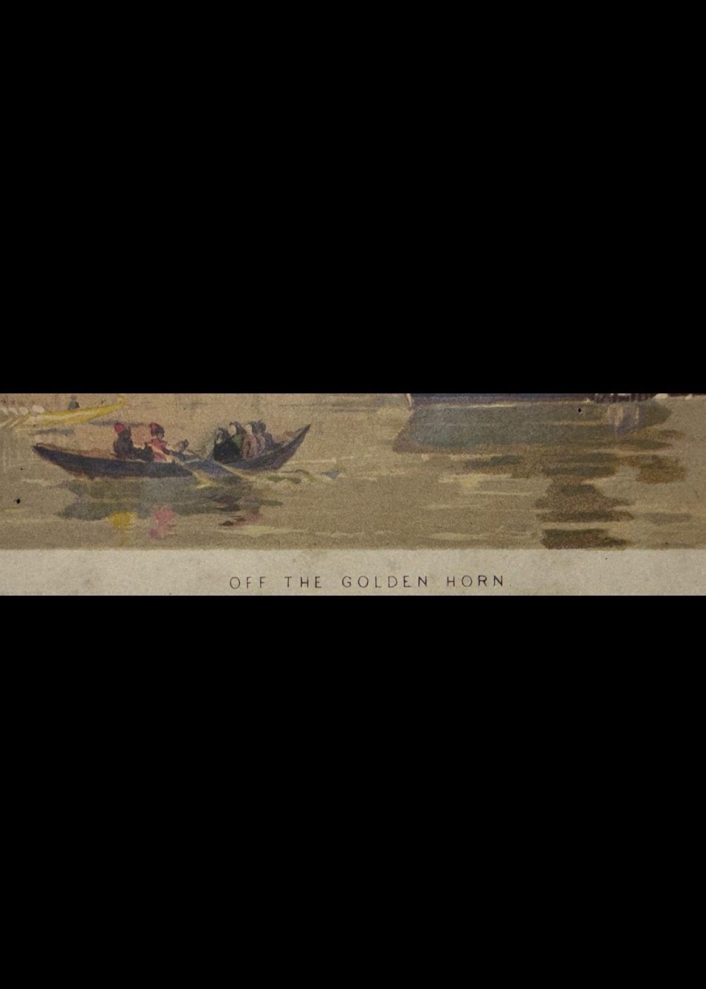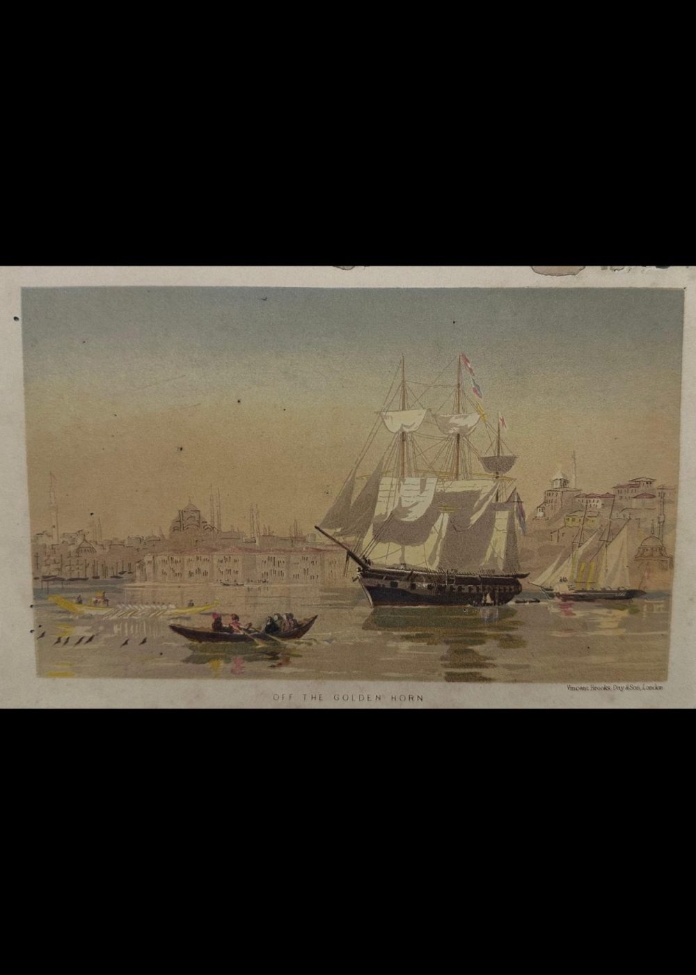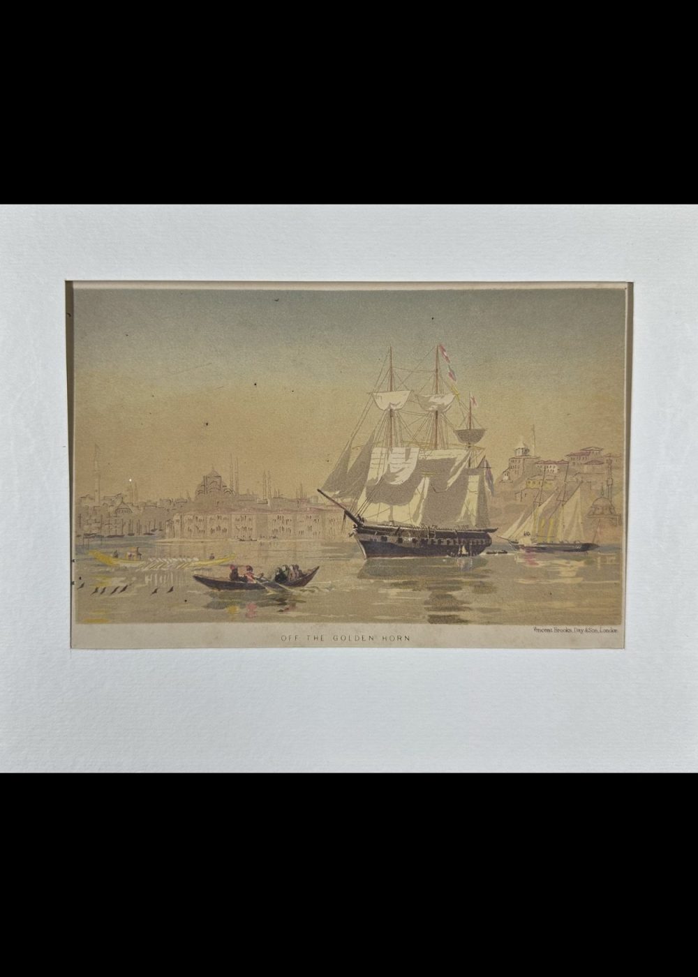 This elegant 19th-century lithograph titled “Off the Golden Horn” presents a tranquil maritime scene along the famous inlet of the Bosphorus in Istanbul, historically known as Constantinople. The composition captures a large sailing vessel anchored in the calm waters of the Golden Horn, its sails partly drawn and deck adorned with flags. To the left and foreground, several small boats—gondola-like rowboats—carry passengers across the glistening water.
