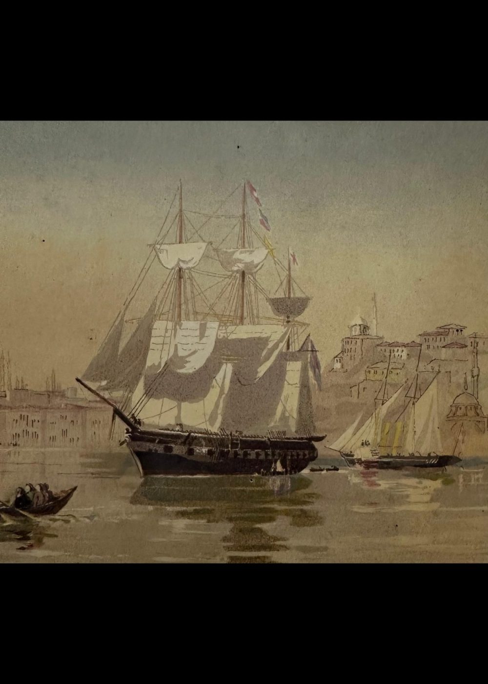 Produced by the renowned British firm Vincent Brooks, Day & Son, this lithograph reflects the 19th-century European fascination with the Ottoman Empire and Orientalist imagery. The pastel palette and serene setting evoke a sense of romantic travel, cultural richness, and the allure of exotic ports along key trade routes of the era.