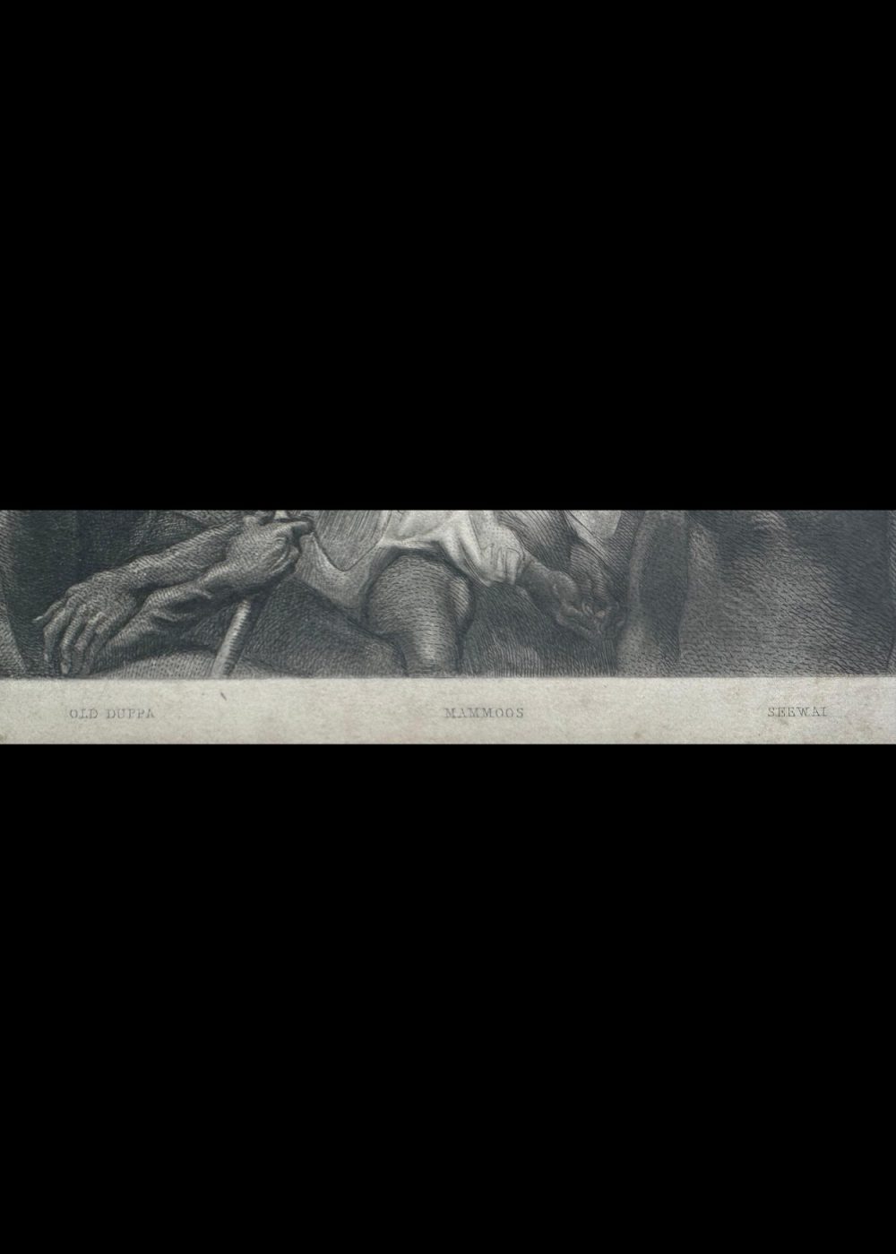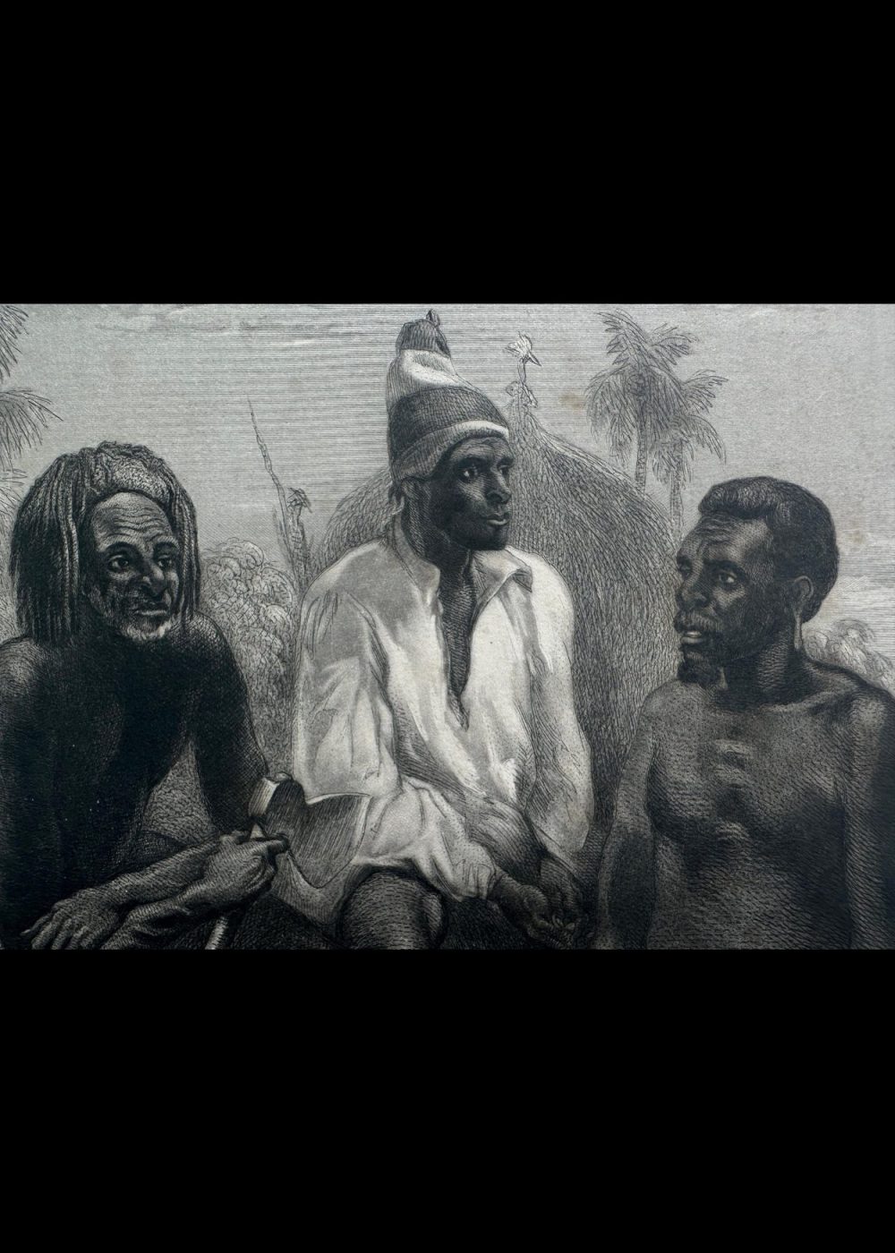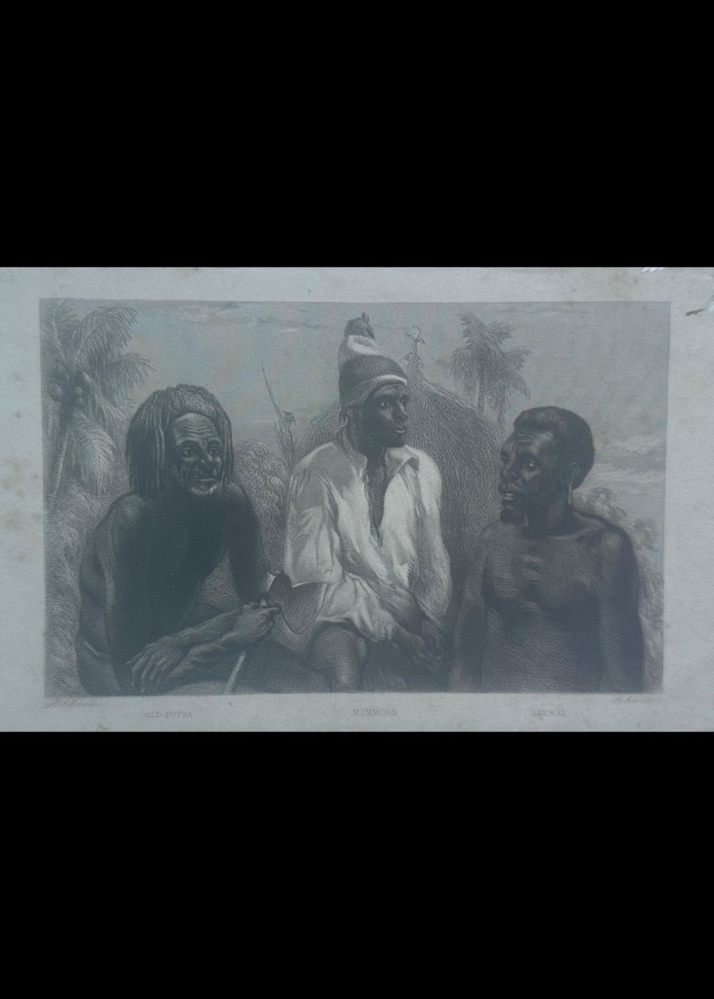 This historical engraving features three individuals—Old Buffa, Mammoo, and Shumai—posed before a tropical backdrop of palm trees and a thatched hut. The figure on the left, Old Buffa, holds a staff and wears a wrap around the waist. Mammoo, at center, is dressed in a light shirt and hat, suggesting a blend of local and colonial attire. Shumai, on the right, stands shirtless, with a cloth tied at the waist. Their varied clothing and postures reflect distinct roles or identities within their community. The composition offers a visual record of cultural presence and individuality, typical of 19th-century ethnographic portraiture.