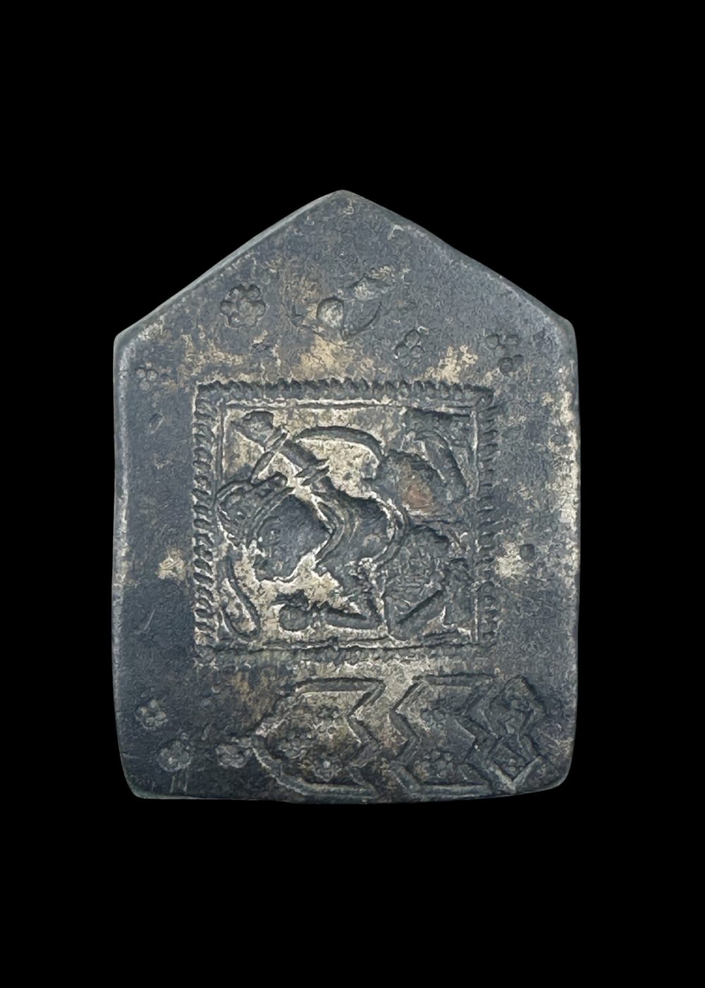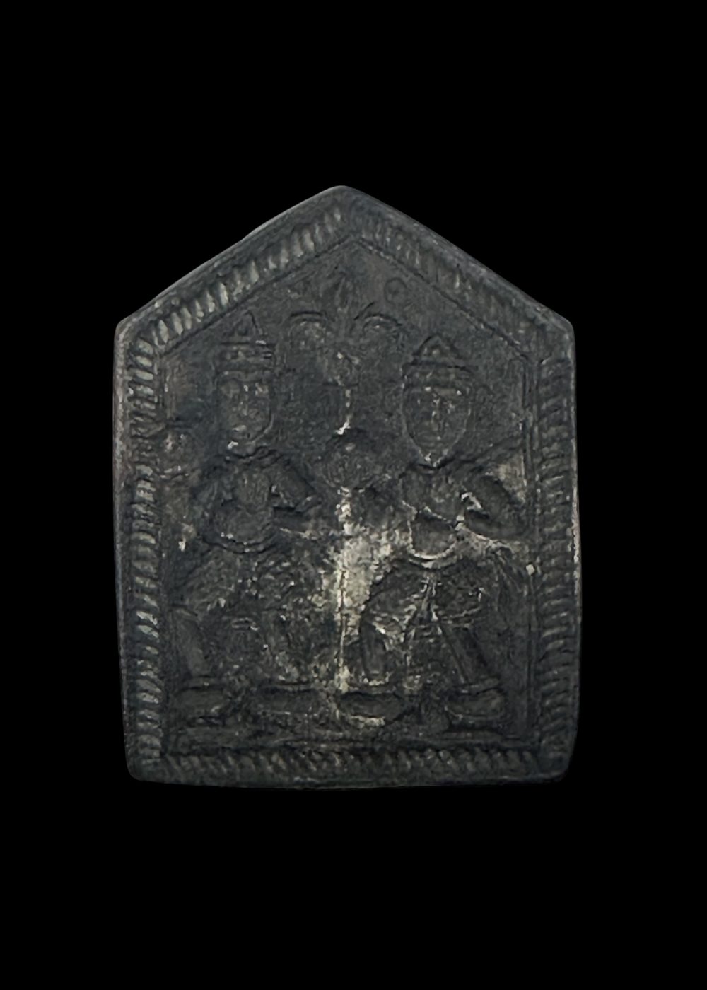 A brass ornamental dye from Karnataka. The piece is engraved with twin human figures in a stylized pose, framed within a pointed arch-like border. The intricate detailing suggests its use in creating decorative impressions on textiles or metal, reflecting traditional craftsmanship of the region.