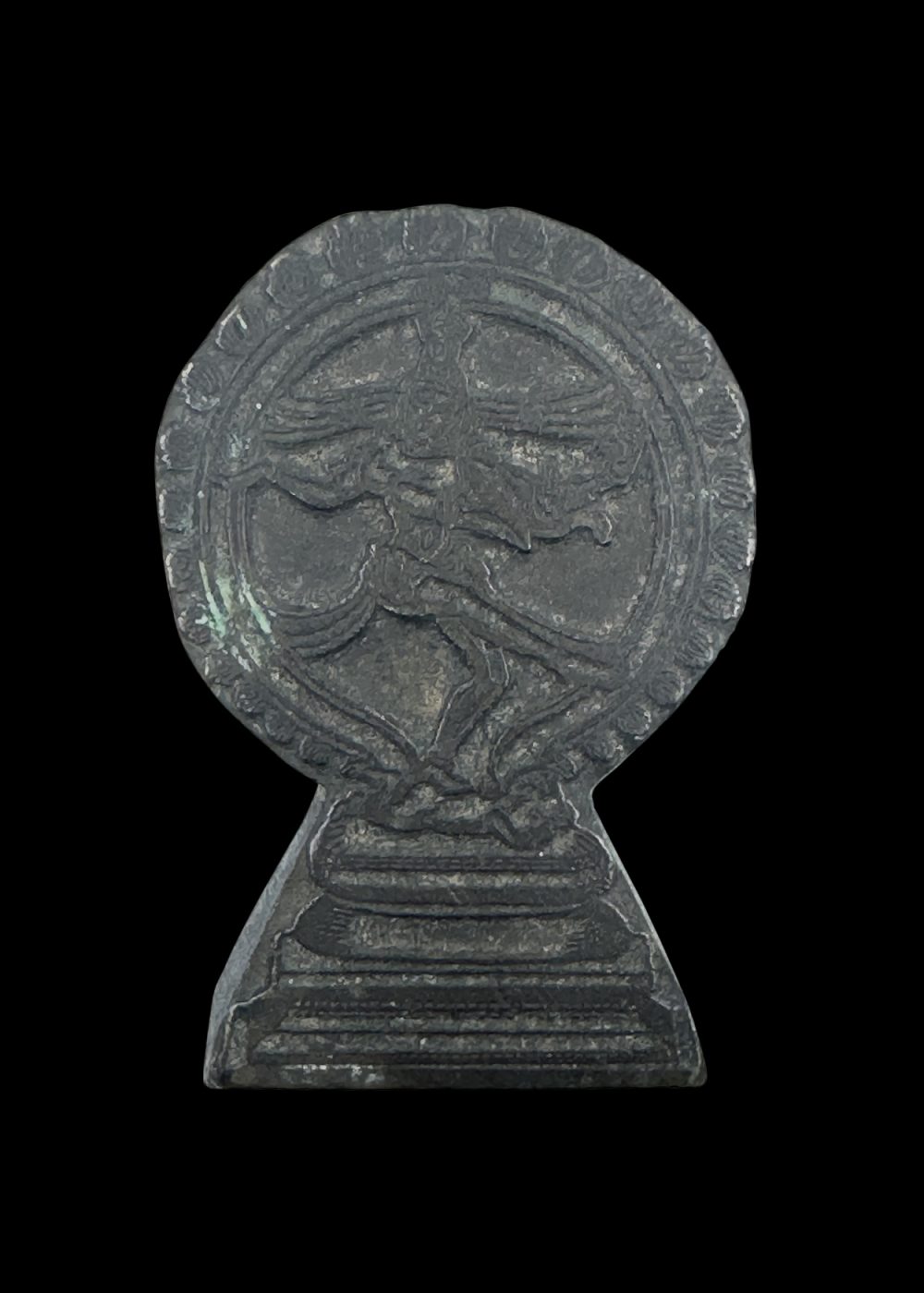 A brass ornamental dye depicting Nataraja, the dancing form of Lord Shiva, enclosed within a circular aureole of flames. The design is intricately engraved, showing the deity in a dynamic posture on a lotus pedestal. Likely used for stamping decorative motifs, this piece reflects contemporary craftsmanship inspired by classical iconography.