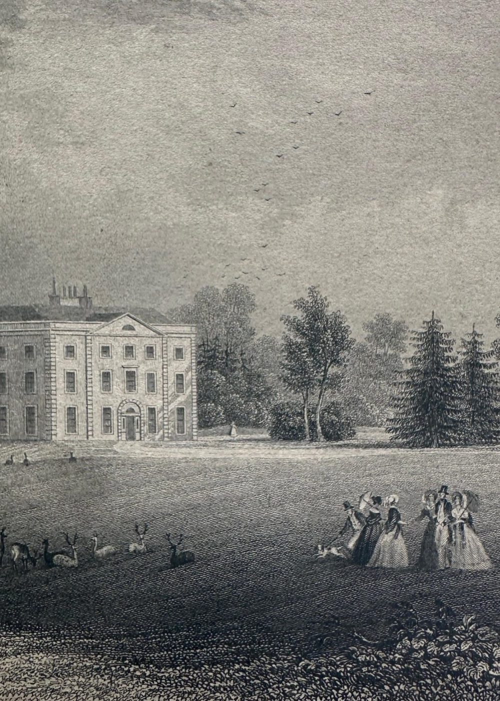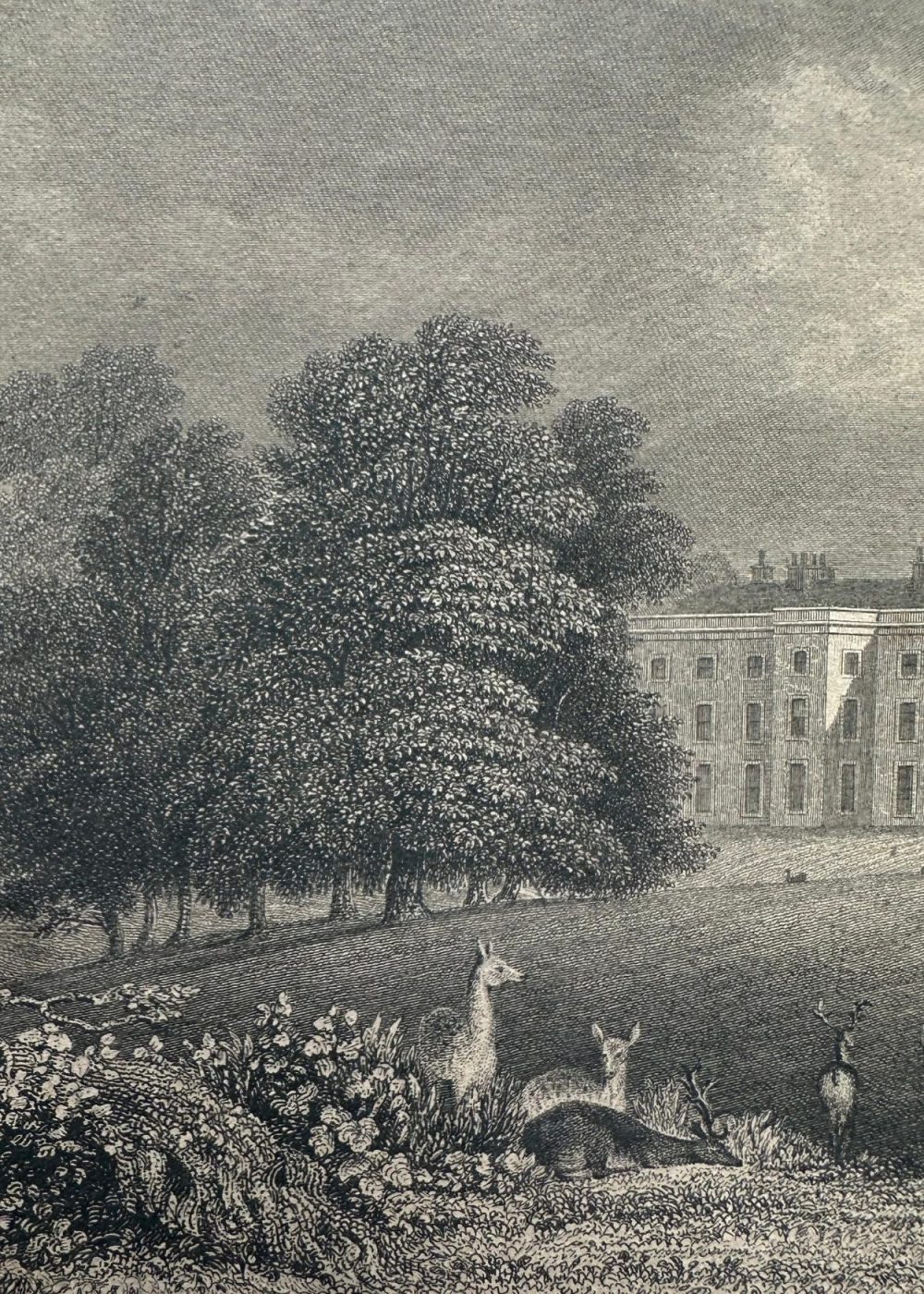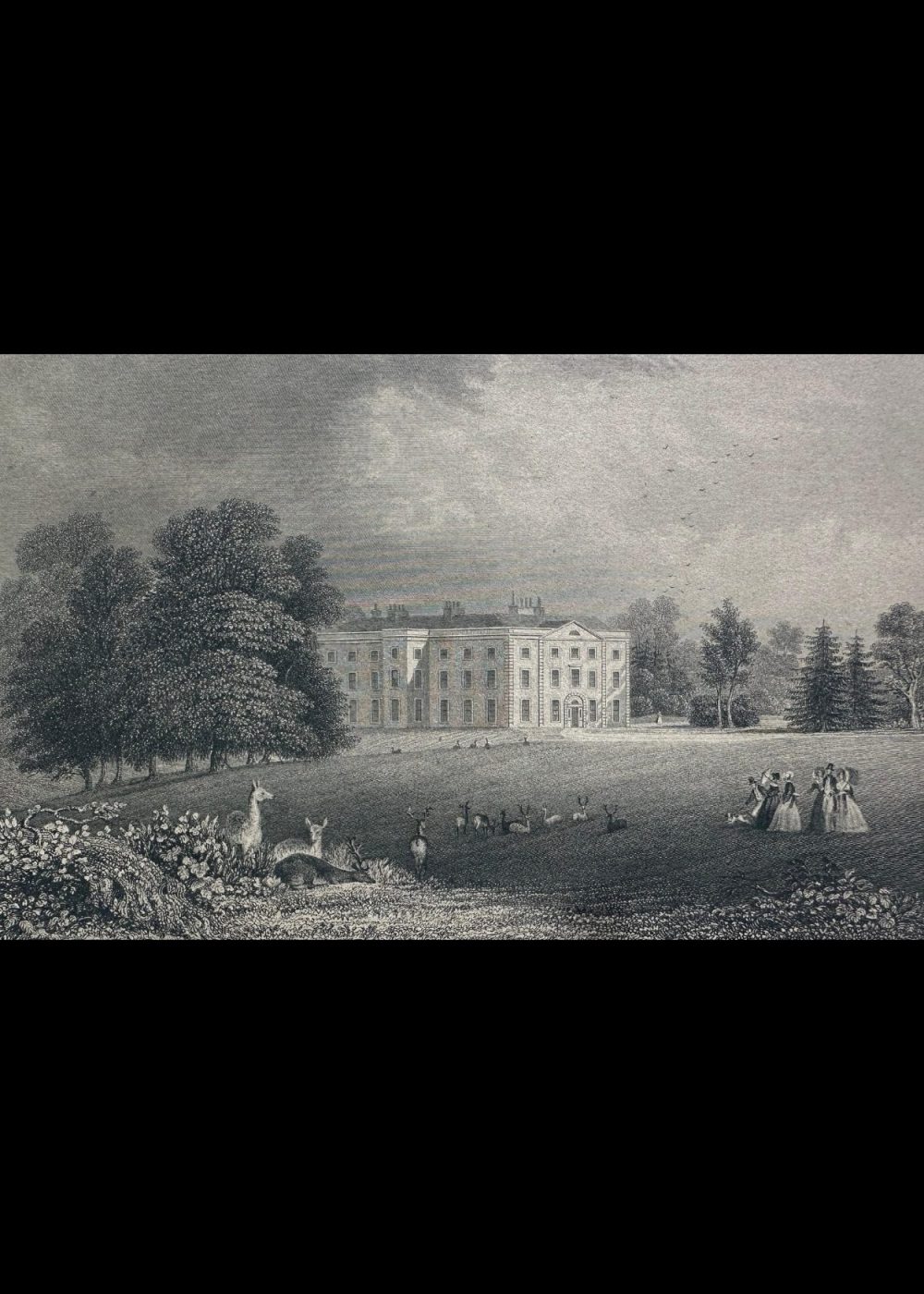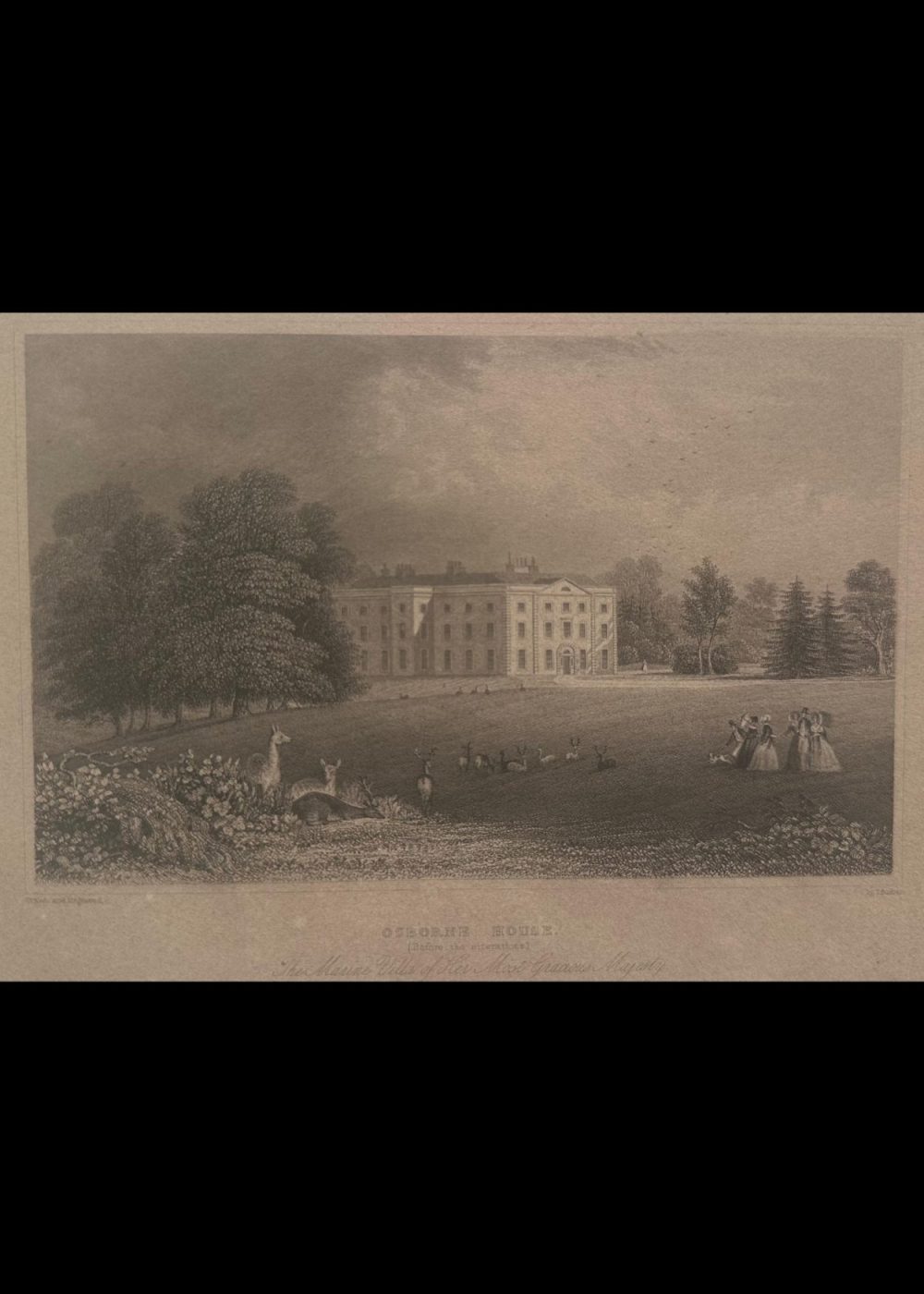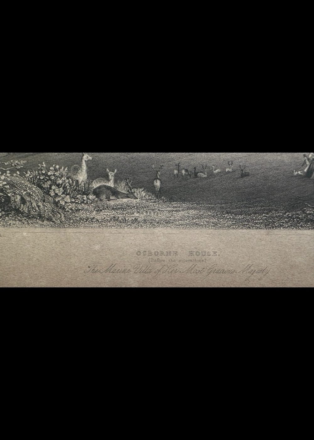 This engraving, titled “Osborne House (Before the Alterations)”, presents a serene and dignified view of the original Osborne House prior to its transformation into the grand Italianate palace we associate with Queen Victoria’s later reign. At the center of the composition is the earlier Georgian-style mansion — a stately yet modestly proportioned building with a symmetrical façade, tall sash windows, and a pedimented central bay. The architecture is restrained, reflecting the elegance and simplicity typical of 18th-century design. The surrounding landscape conveys peace and pastoral charm. In the foreground, a group of deer and kangaroos rest or graze peacefully on the lawn, evoking the exotic menagerie Queen Victoria is known to have kept on the grounds. To the right, well-dressed ladies in Victorian attire stroll or converse leisurely, emphasizing the house’s role not only as a residence but as a place of genteel recreation. Encircling the house are mature trees and well-tended shrubbery, providing both shade and a sense of secluded refinement. The soft tonal palette and delicate engraving lines evoke a sense of nostalgia and quiet grandeur, capturing Osborne House as it once stood — a royal retreat in its more understated form, before Prince Albert’s architectural ambitions reshaped it into a royal seaside villa.