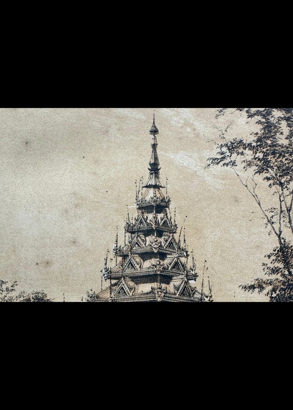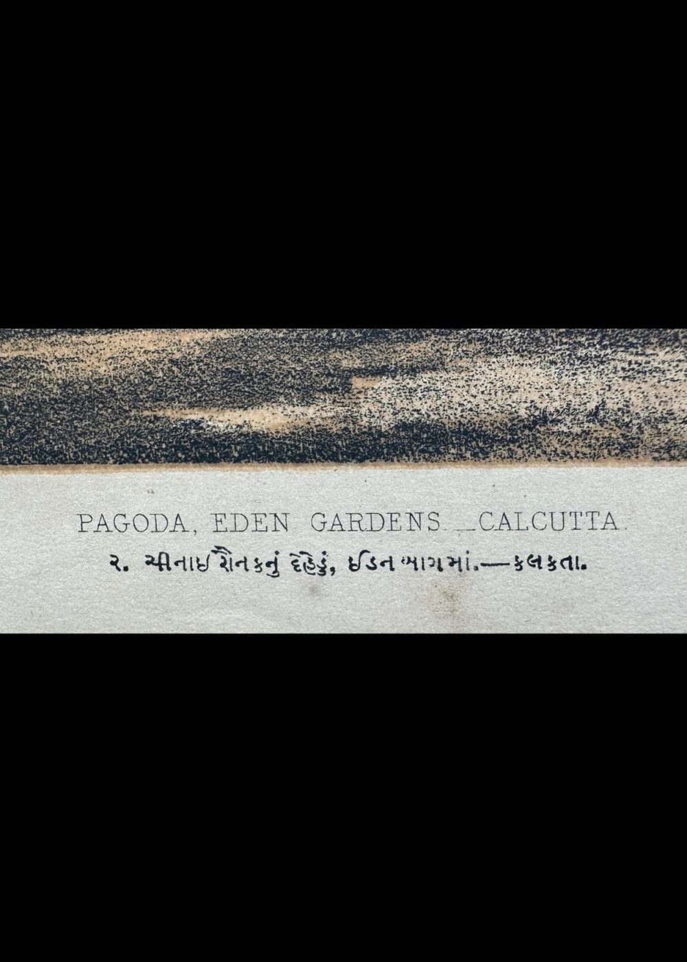This chromo-lithograph presents the Pagoda at Eden Gardens, located in Calcutta (now Kolkata), India, as part of the “Travels of India” series. The illustration highlights the distinctive architecture of the pagoda, with its tiered, multi-layered roof and ornate detailing, which are characteristic of traditional East Asian and Southeast Asian designs. The structure is intricately decorated with pointed spires and intricate carvings, creating a stunning visual impact. The surrounding trees and the fence enclosing the pagoda suggest that it is situated within the serene and picturesque Eden Gardens, a popular public park in Calcutta during the British colonial era.