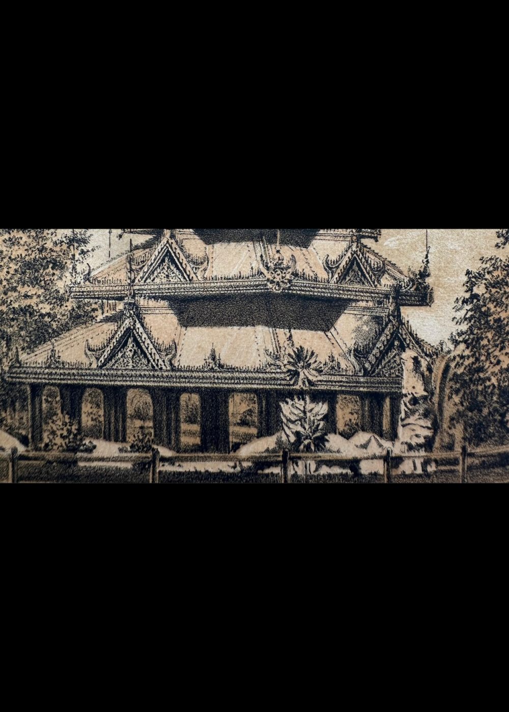This pagoda was built as part of the garden’s exotic and diverse attractions, reflecting the fascination with oriental architecture and the desire to create a varied, culturally rich experience for visitors. The print also conveys the tranquil atmosphere of the park, with lush greenery and a well-maintained landscape surrounding the pagoda. The gentle shading and fine details of the lithograph reflect the artistic style of the time, capturing not only the architectural beauty of the pagoda but also the landscape it inhabits.