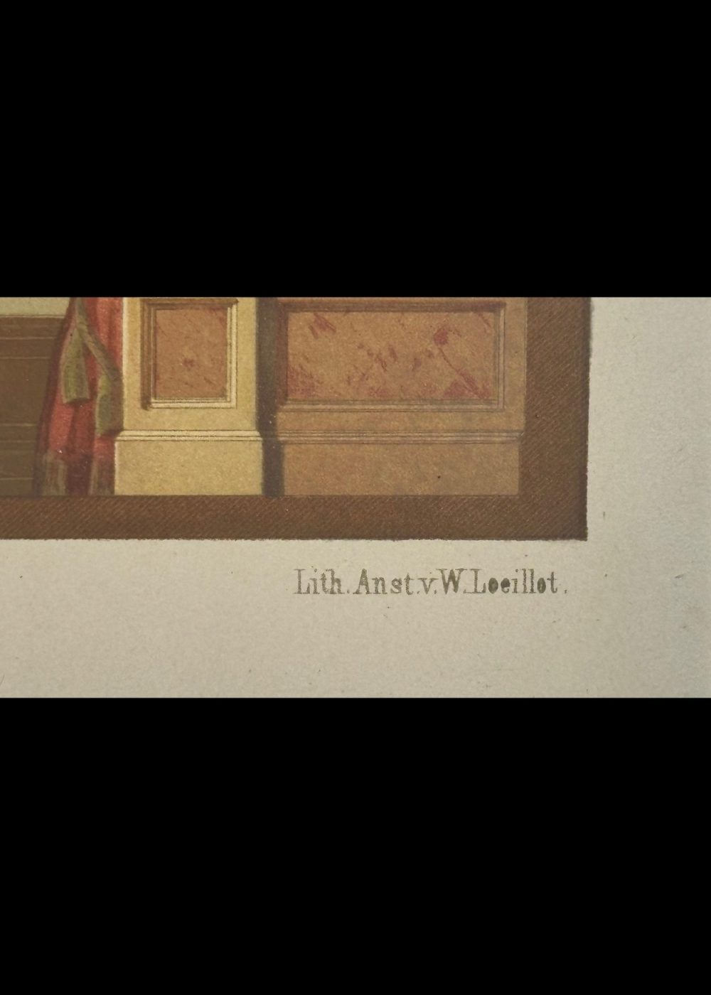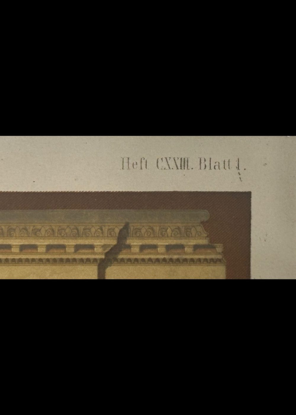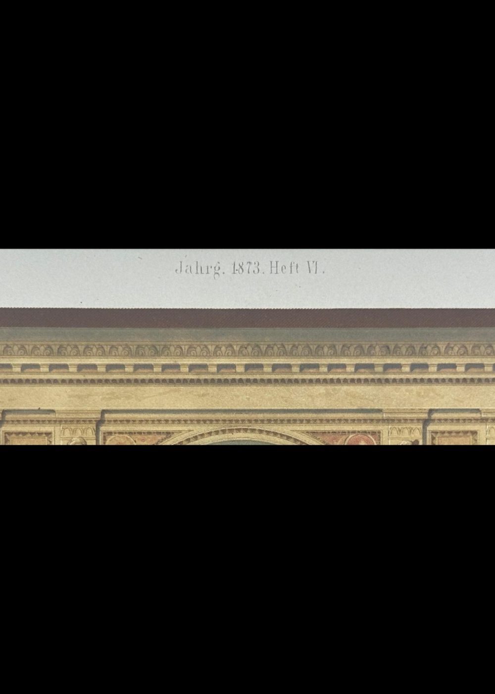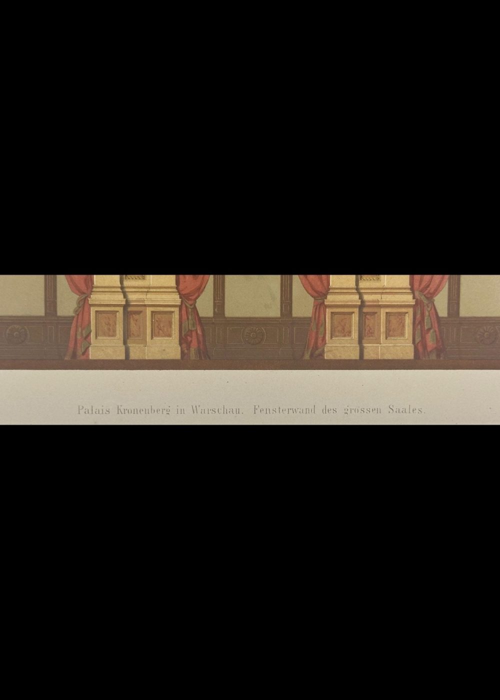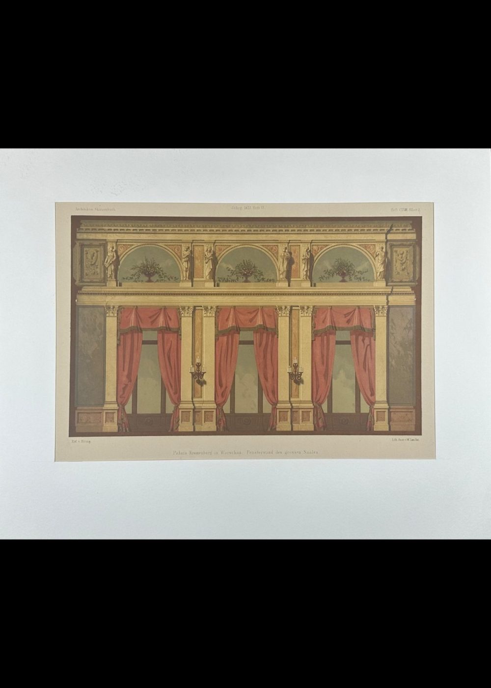 This elegant 1873 lithograph showcases the richly ornamented window wall of the grand hall (grossen Saales) in the Palais Kronenberg, Warsaw. Designed by architect Heinrich von Hürzig, the composition features Corinthian columns, lush red drapery, and decorative wall sconces flanking tall arched windows. Above, a classical frieze is adorned with sculptural figures in niches and painted floral motifs within arched panels. The refined neoclassical interior reflects 19th-century aristocratic taste. This plate is from the Architekton Skizzenbuch and was lithographed by W. Loeillot in Berlin.