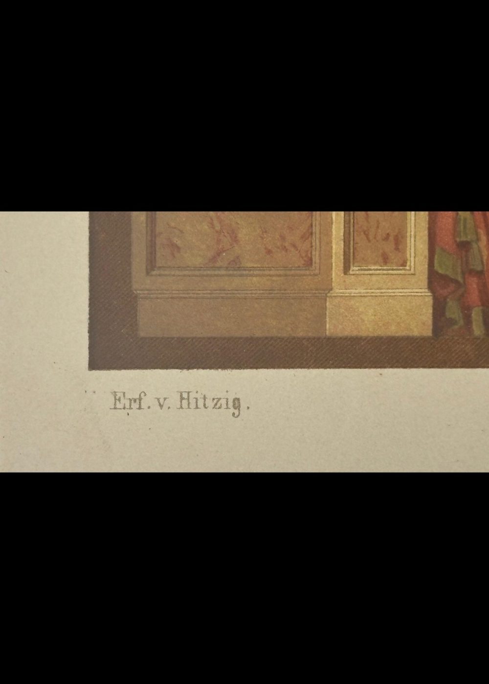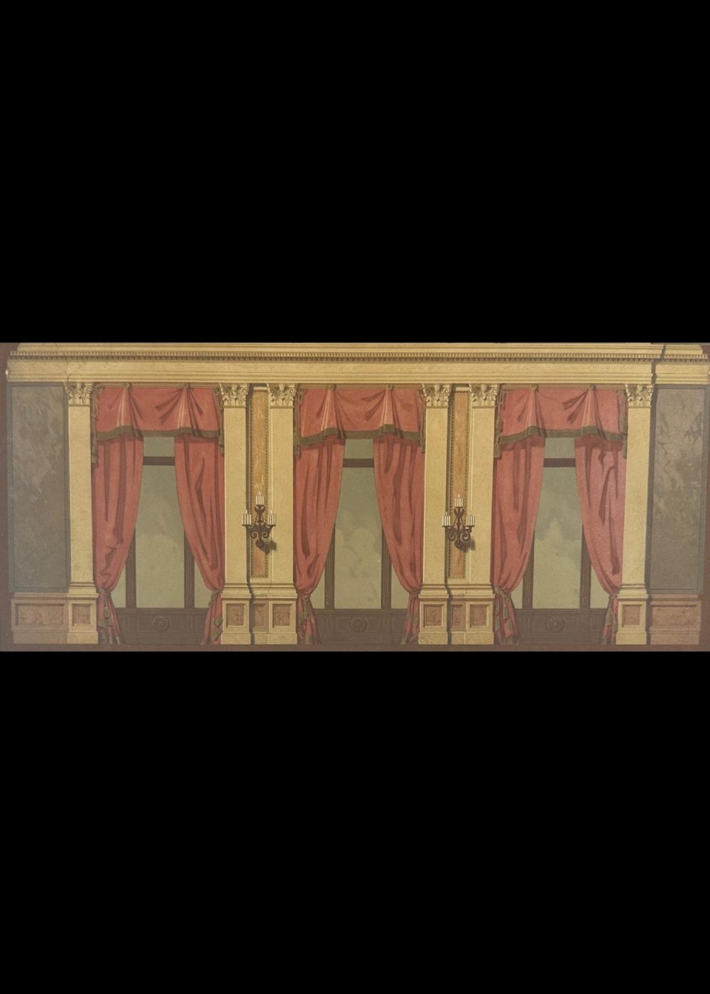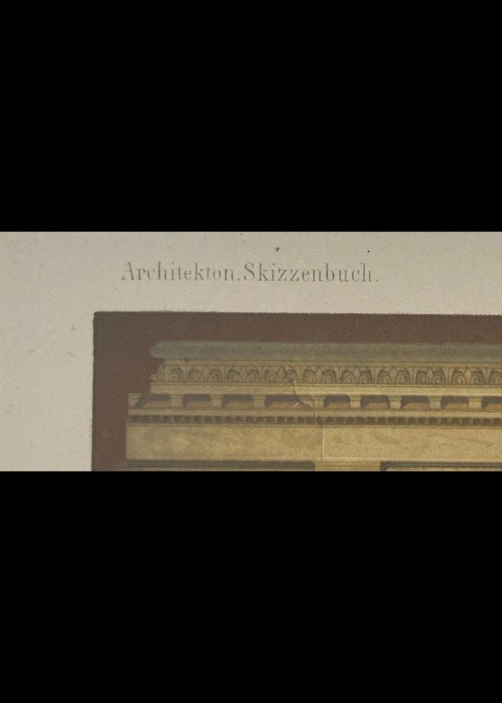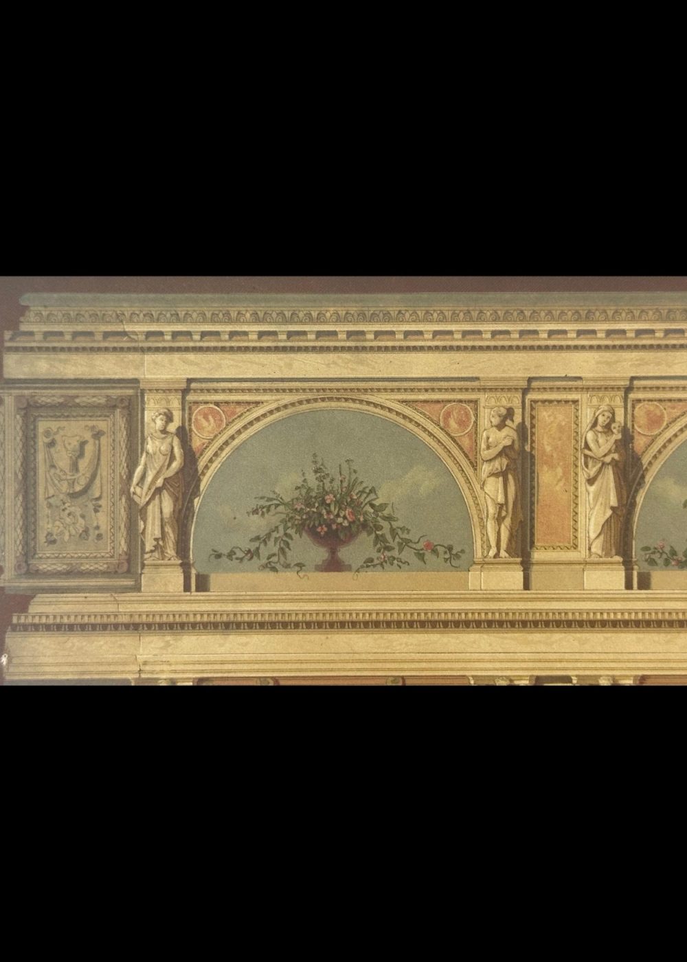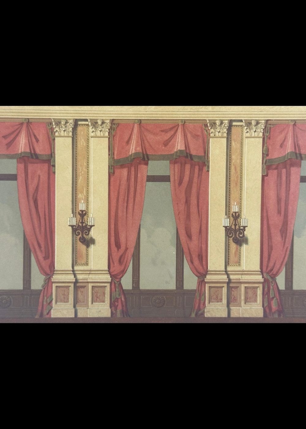 This elegant 1873 lithograph showcases the richly ornamented window wall of the grand hall (grossen Saales) in the Palais Kronenberg, Warsaw. Designed by architect Heinrich von Hürzig, the composition features Corinthian columns, lush red drapery, and decorative wall sconces flanking tall arched windows. Above, a classical frieze is adorned with sculptural figures in niches and painted floral motifs within arched panels. The refined neoclassical interior reflects 19th-century aristocratic taste. This plate is from the Architekton Skizzenbuch and was lithographed by W. Loeillot in Berlin.