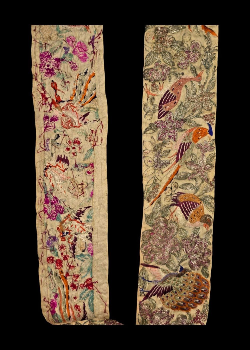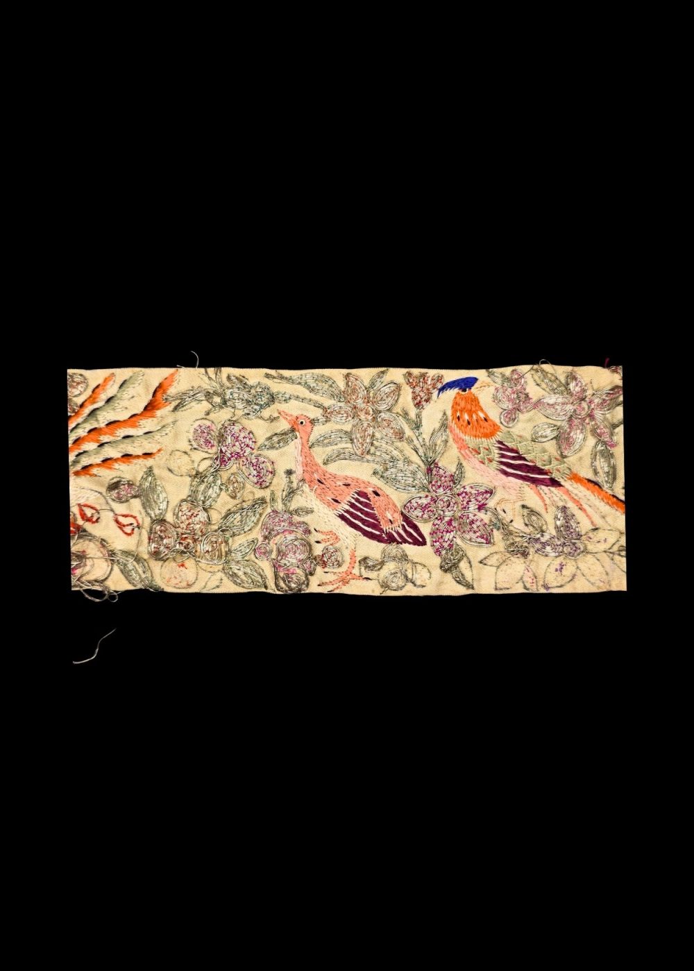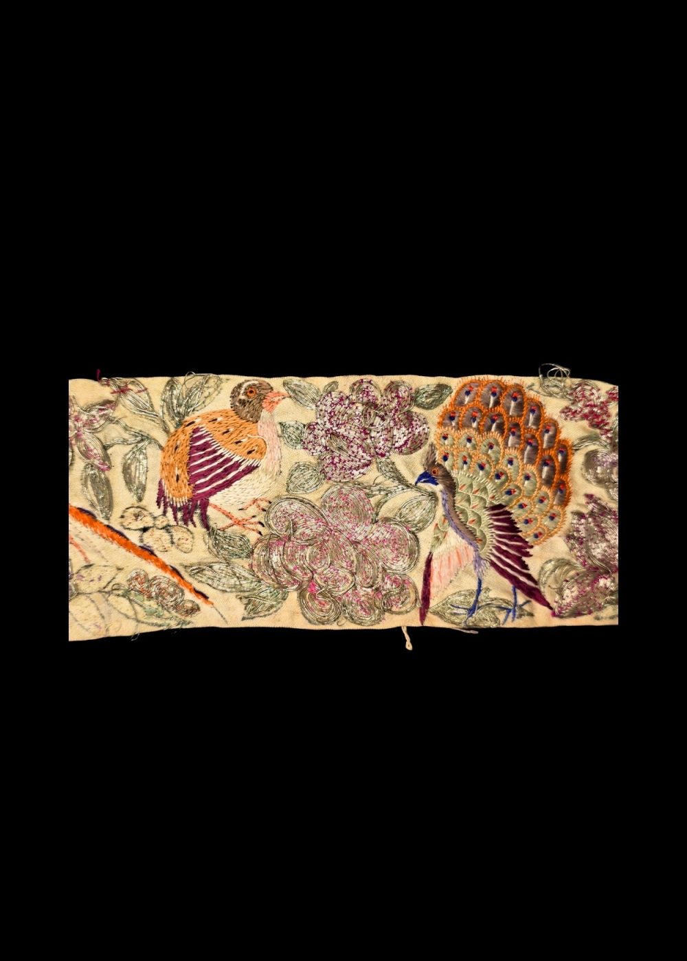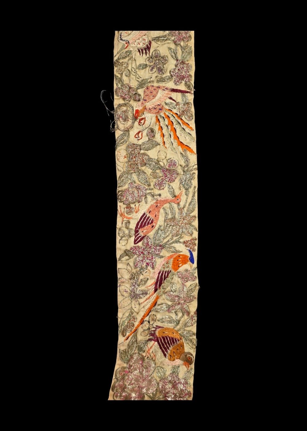 This is a Parsi Gara saree border roll, featuring intricate hand embroidery using real gold and silver threads. The design showcases vibrant birds amid detailed floral motifs, a hallmark of traditional Parsi craftsmanship. The rich texture and meticulous detailing reflect the cultural elegance and heritage of Parsi textile art, making it a rare and valuable piece for collectors and connoisseurs.