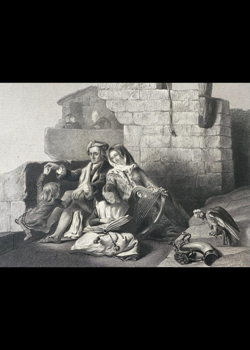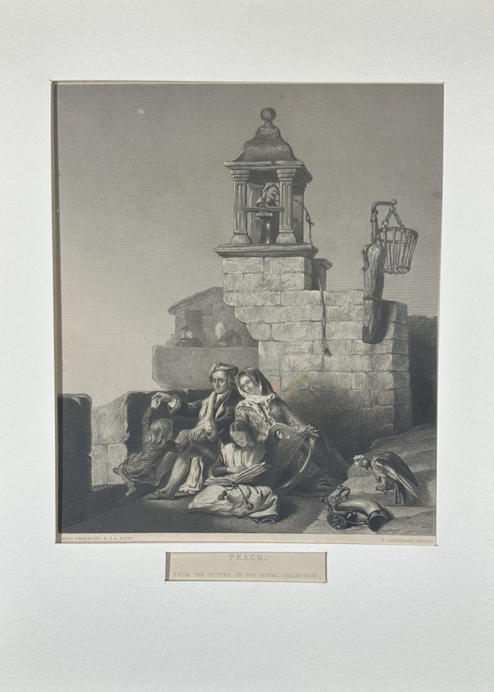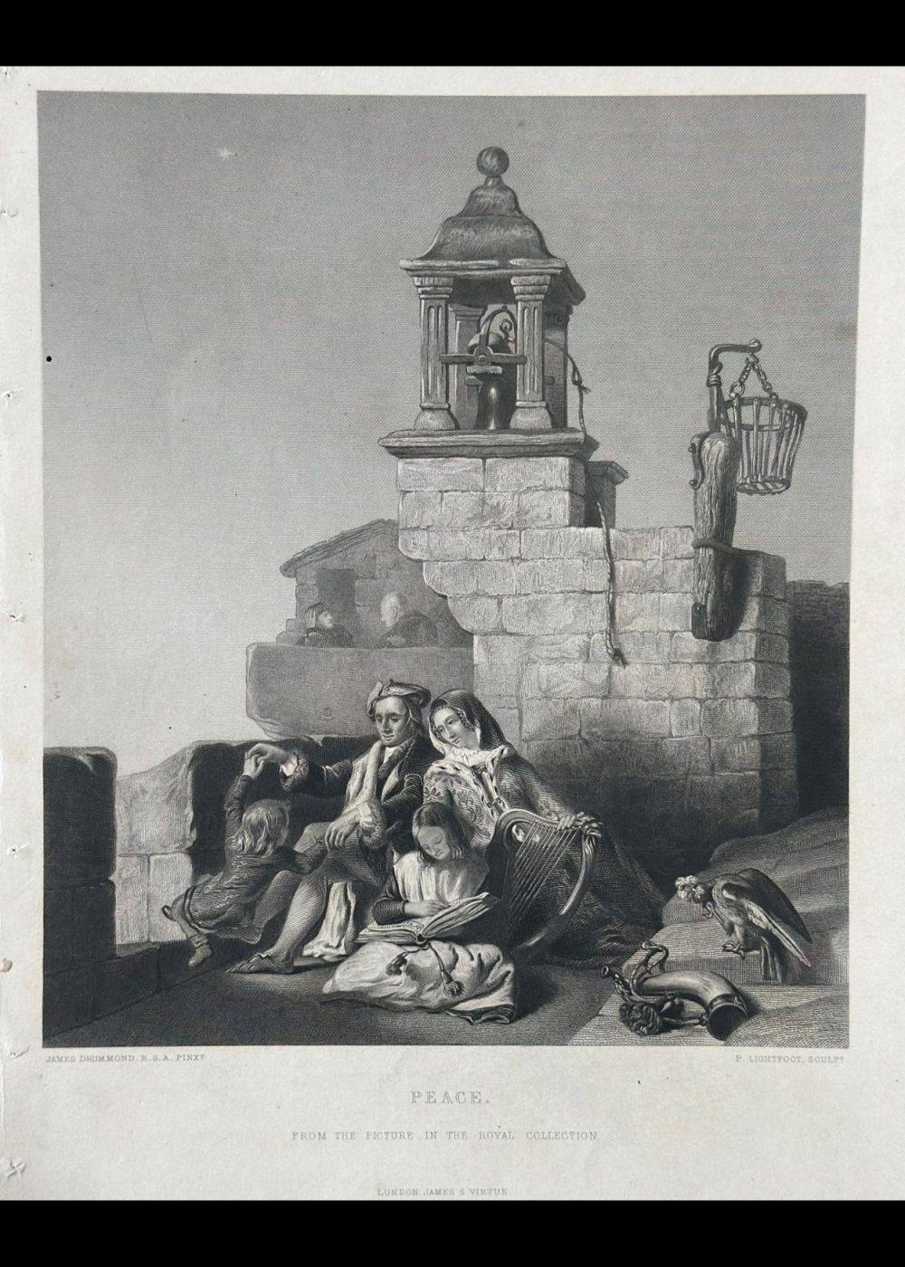 This poignant engraving by Peter Lightfoot, after an original work by Scottish artist James Drummond, R.S.A., is titled Peace and depicts a serene domestic moment following the end of conflict. Set atop a stone fortification or castle, the scene presents a group of women and children gathered in a moment of calm and quiet joy. A mother lovingly embraces her children, while others read or rest, basking in the stillness. In contrast to the foreground’s tender humanity, subtle references to war remain: a cannon lies unused, and a helmet and sword rest discarded — clear symbols of a past battle now concluded. Above them, a bell tower and a watchman’s empty post reinforce the sense of vigilant peace that has taken hold. Drummond’s composition and Lightfoot’s skillful engraving beautifully evoke the relief and warmth of peace after turmoil, celebrating domesticity, safety, and the human cost — and value — of harmony.