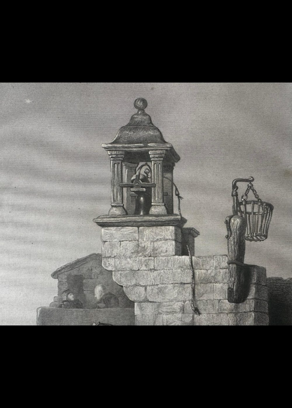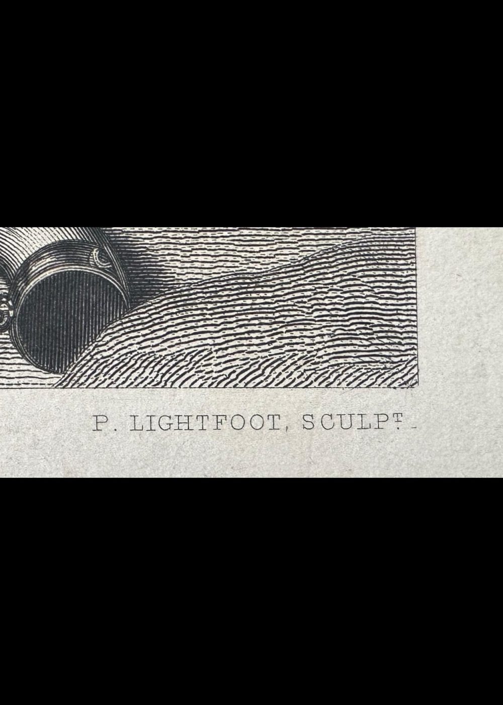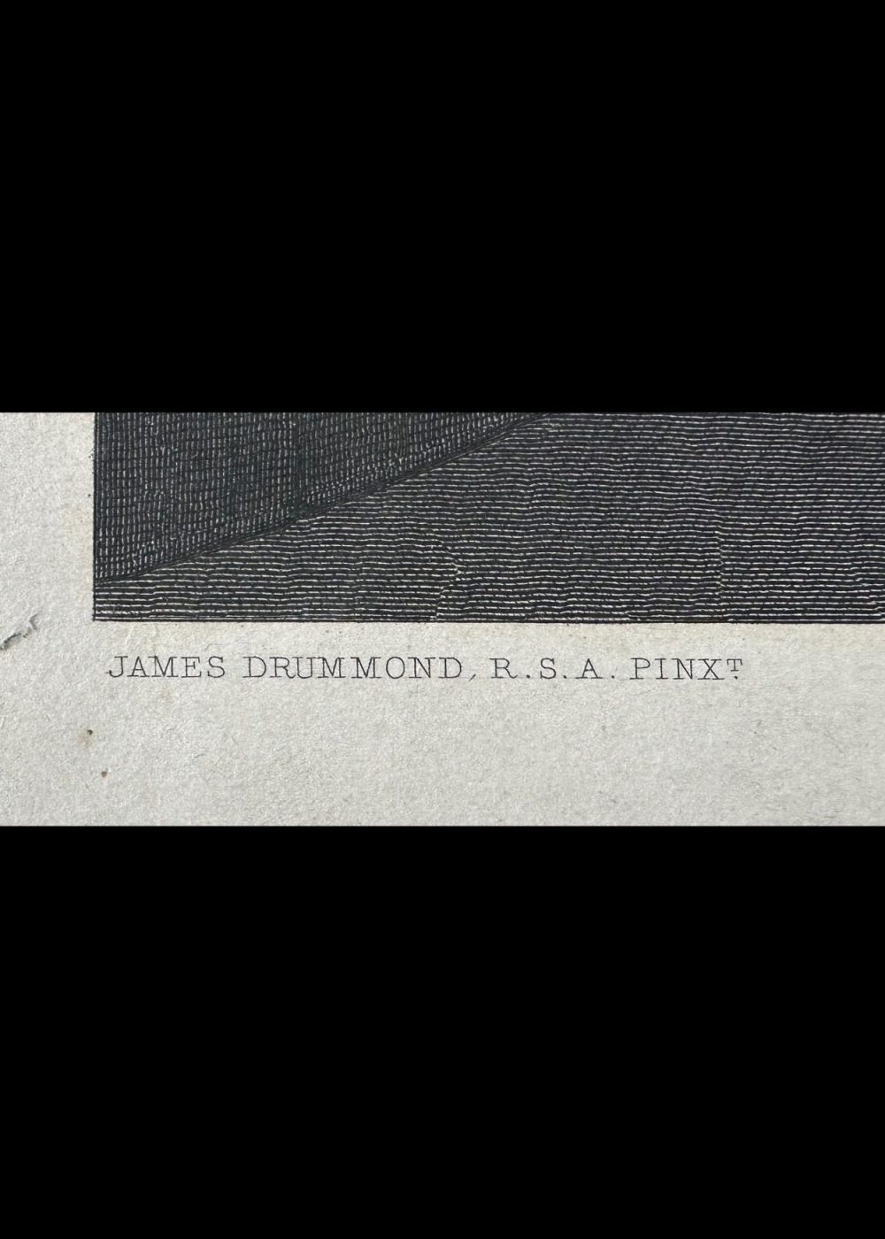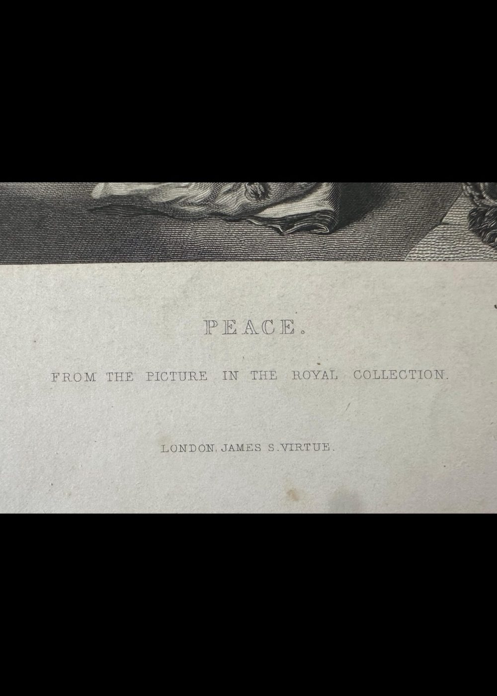 This poignant engraving by Peter Lightfoot, after an original work by Scottish artist James Drummond, R.S.A., is titled Peace and depicts a serene domestic moment following the end of conflict. Set atop a stone fortification or castle, the scene presents a group of women and children gathered in a moment of calm and quiet joy. A mother lovingly embraces her children, while others read or rest, basking in the stillness. In contrast to the foreground’s tender humanity, subtle references to war remain: a cannon lies unused, and a helmet and sword rest discarded — clear symbols of a past battle now concluded. Above them, a bell tower and a watchman’s empty post reinforce the sense of vigilant peace that has taken hold. Drummond’s composition and Lightfoot’s skillful engraving beautifully evoke the relief and warmth of peace after turmoil, celebrating domesticity, safety, and the human cost — and value — of harmony.