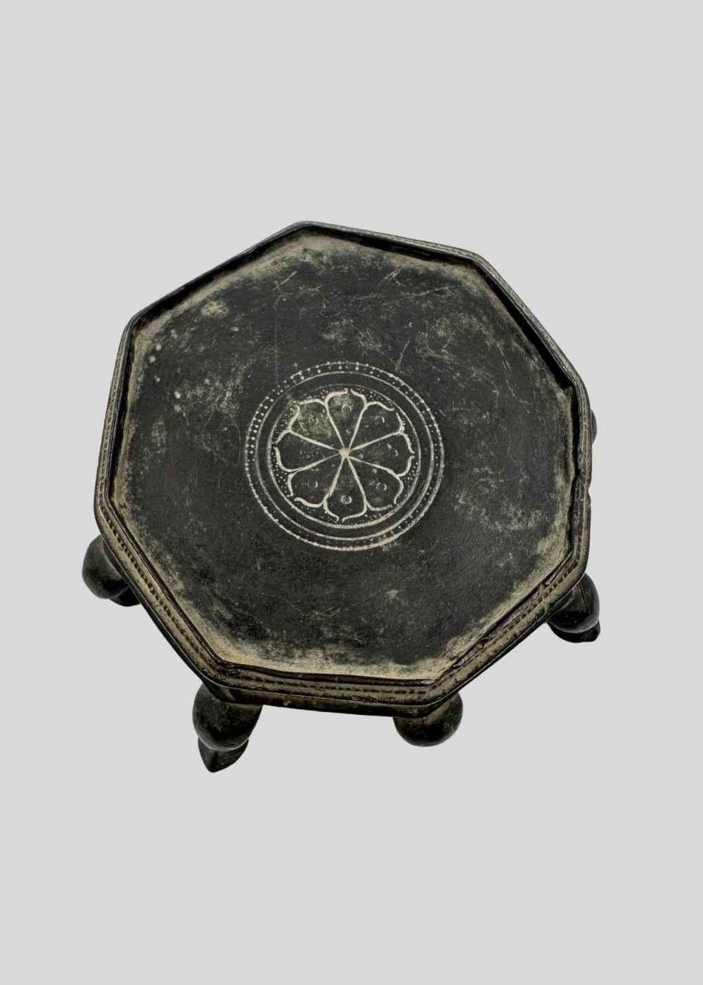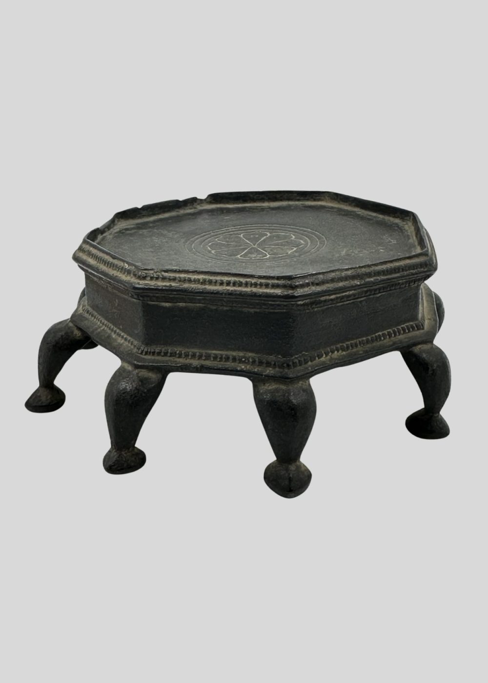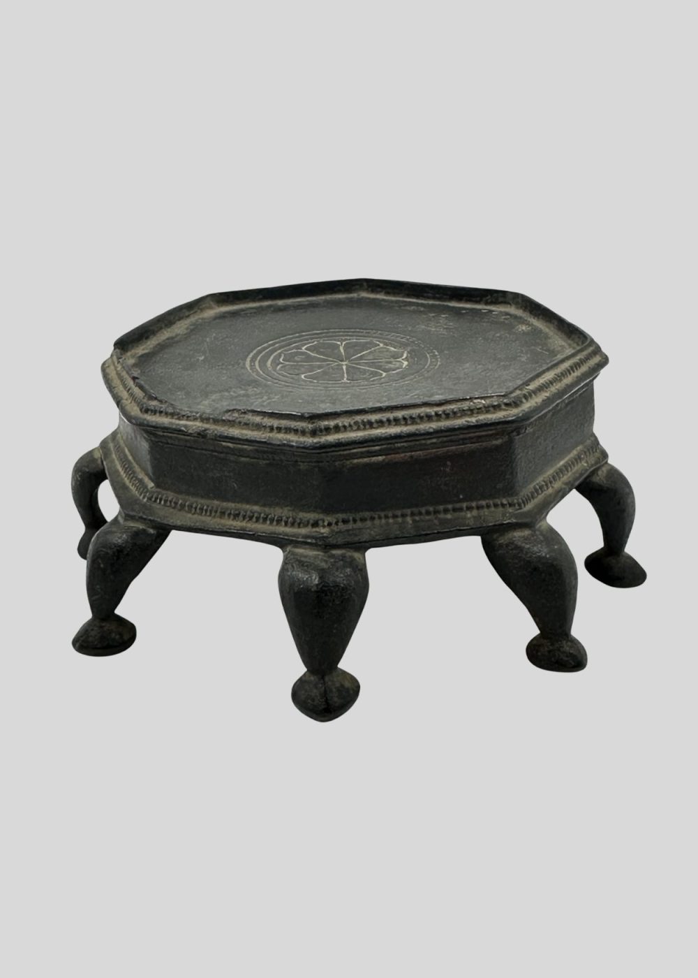 This bronze pedestal, octagonal in shape, reflects the skilled craftsmanship and ornamental precision of North Indian metalwork. The platform is engraved with concentric decorative bands radiating from a central rosette, framed by repeating floral and geometric motifs. Supported by four bulbous, claw-footed legs, the structure balances solidity with aesthetic grace. A dark patina blankets the surface, accentuating its age and use. Likely intended for ritual or ceremonial placement, the piece exemplifies the regional tradition of elevating sacred or decorative objects through finely cast and tooled supports.