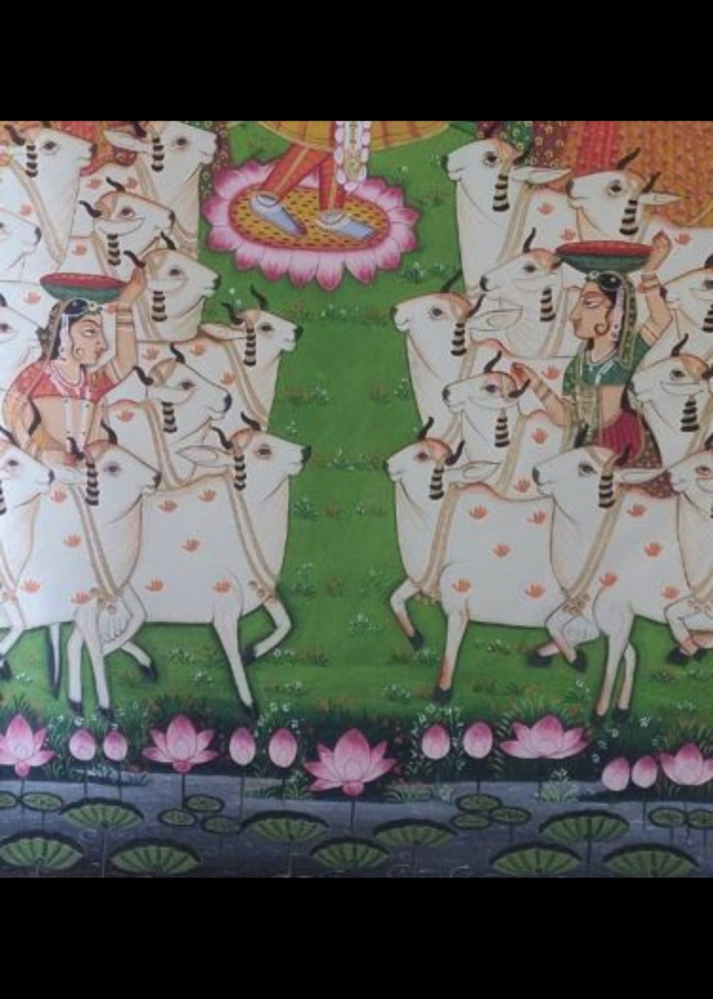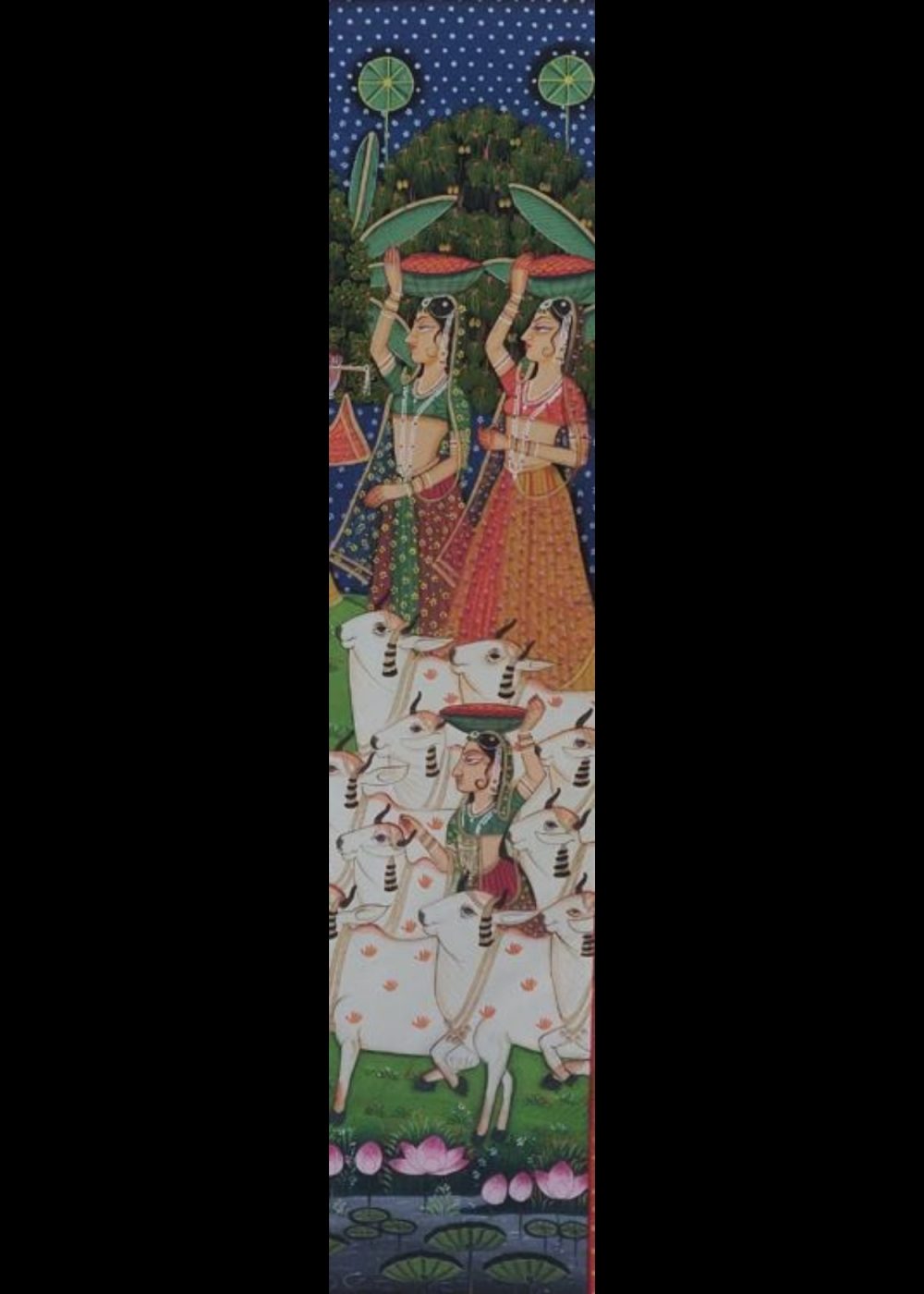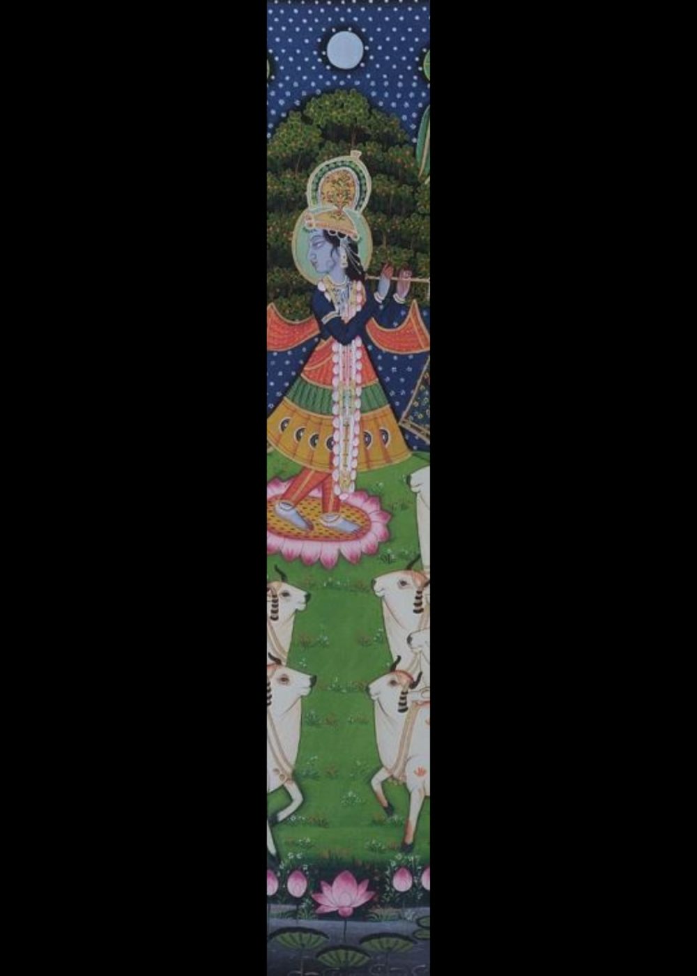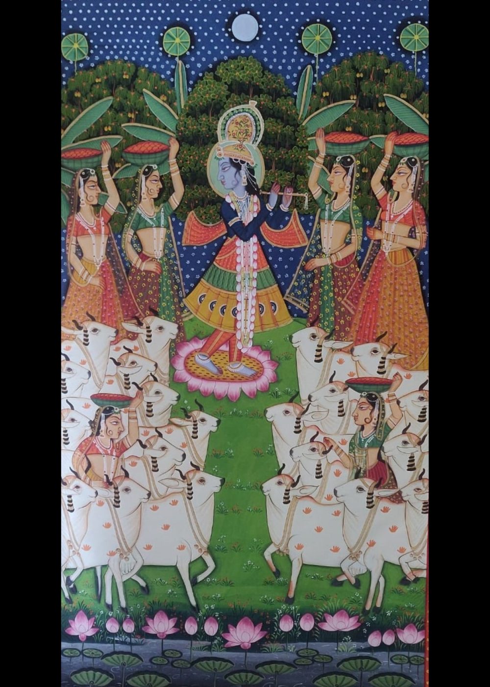 This vibrant Nathdwara-style painting portrays Lord Krishna amidst a pastoral Vrindavan setting under a moonlit sky. Standing gracefully atop a lotus, Krishna plays his enchanting flute, surrounded by adoring gopis carrying pots on their heads, symbolizing devotion and daily village life. Below, a herd of sacred cows, guided by gopas, fills the foreground, emphasizing Krishna’s divine role as Govinda, the protector of cows. The rich floral border, with motifs of cows and lotuses, enhances the devotional and bucolic charm of the scene, celebrating Krishna’s divine play and his loving bond with both nature and his devotees.