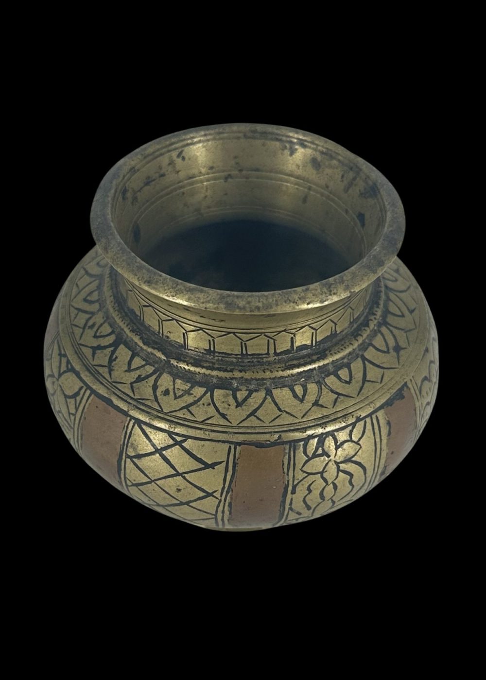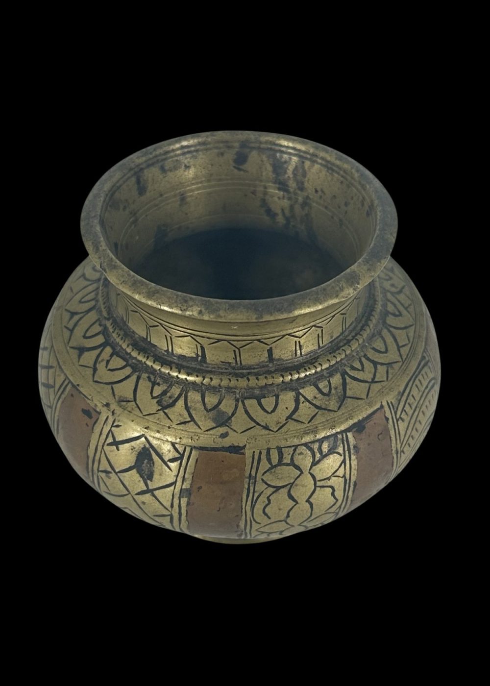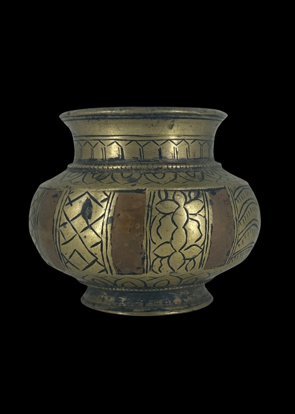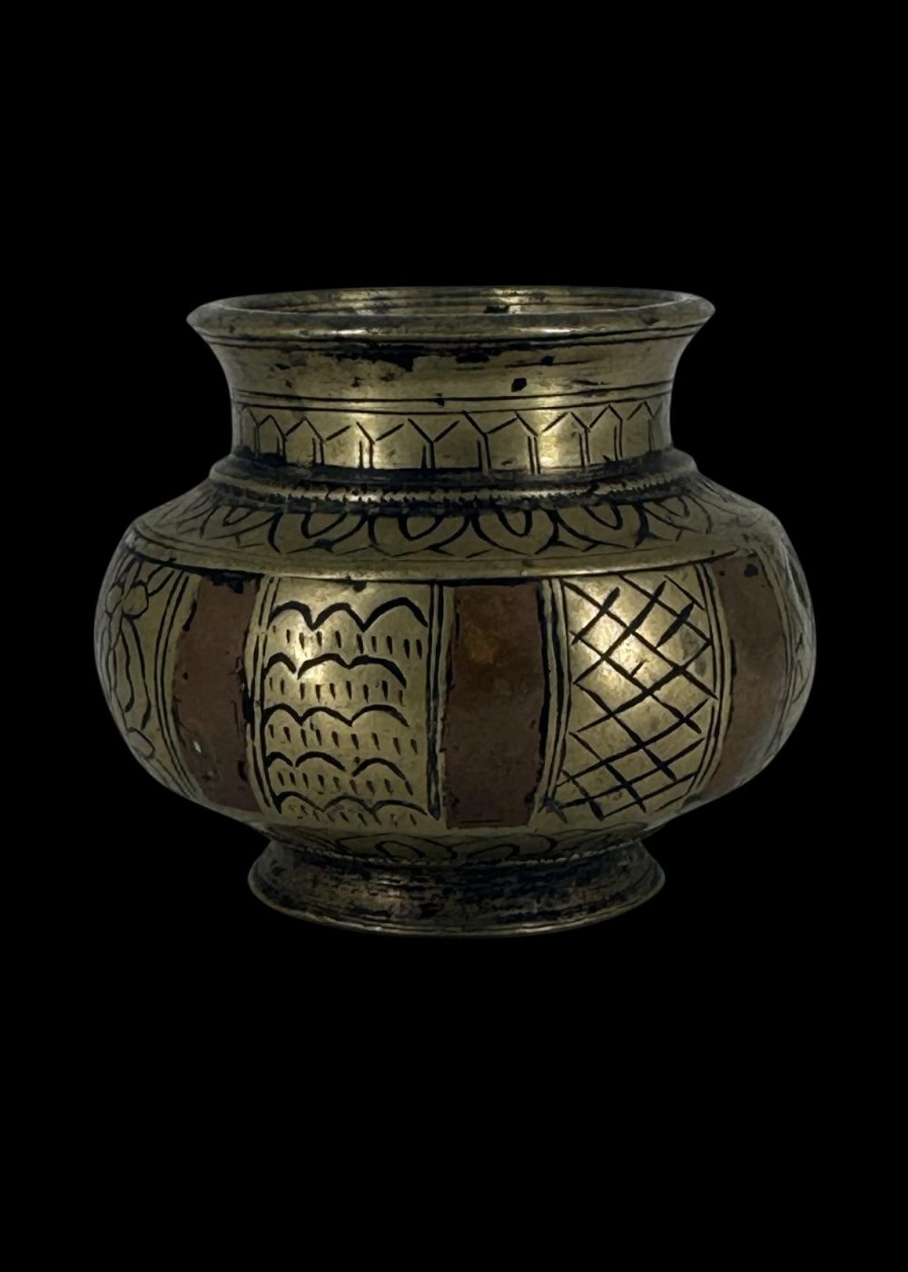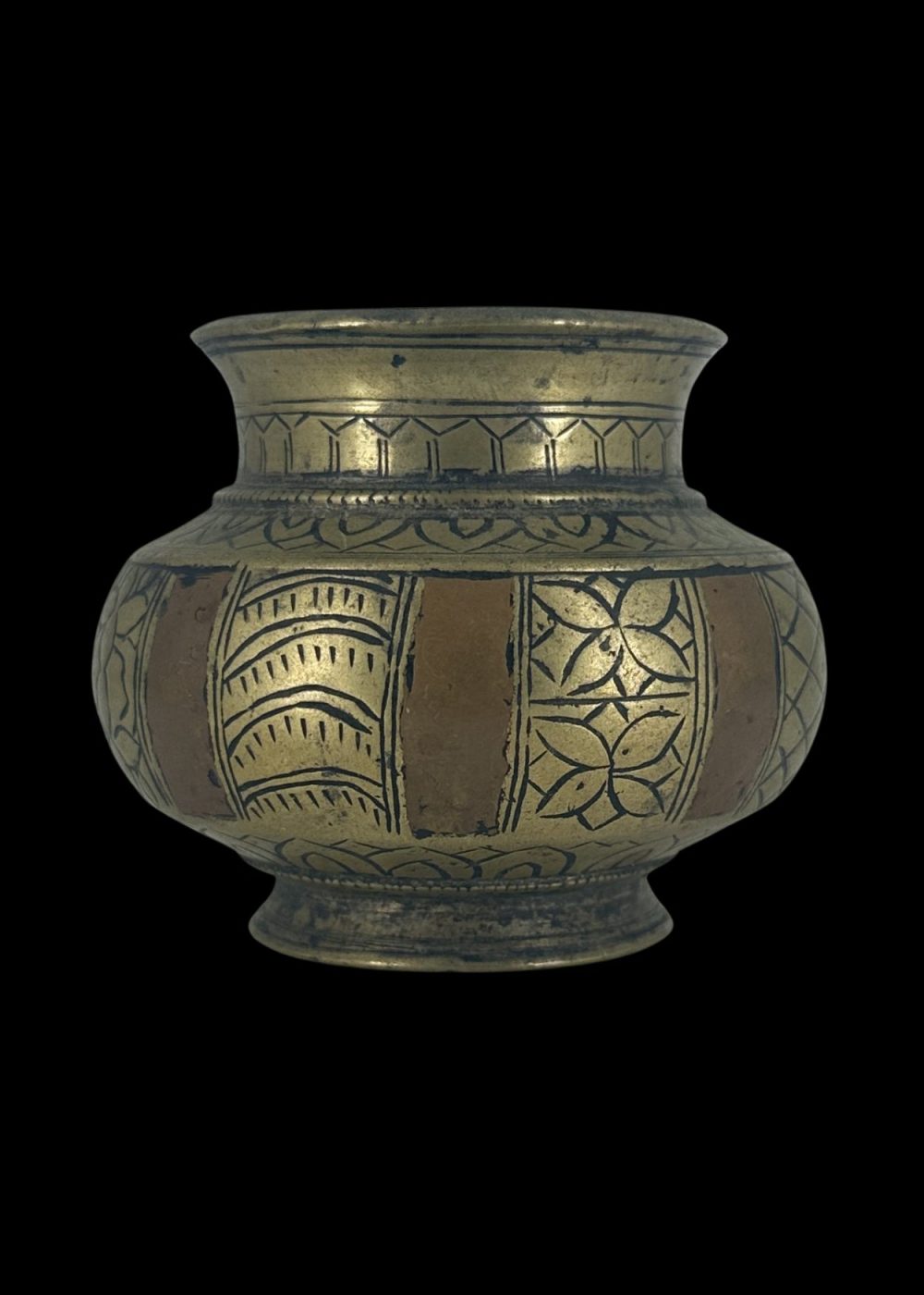 This Ganga Jamuna vessel from Maharashtra showcases the traditional use of two contrasting metals—typically brass and copper—expertly fused to create a harmonious visual effect. Adorned with engraved floral and geometric motifs, the piece reflects both aesthetic sophistication and the symbolic interplay of duality often seen in regional ritual and decorative arts.