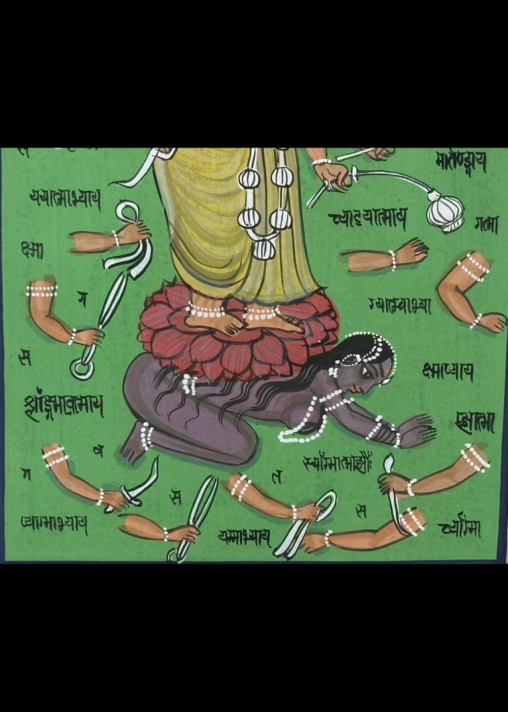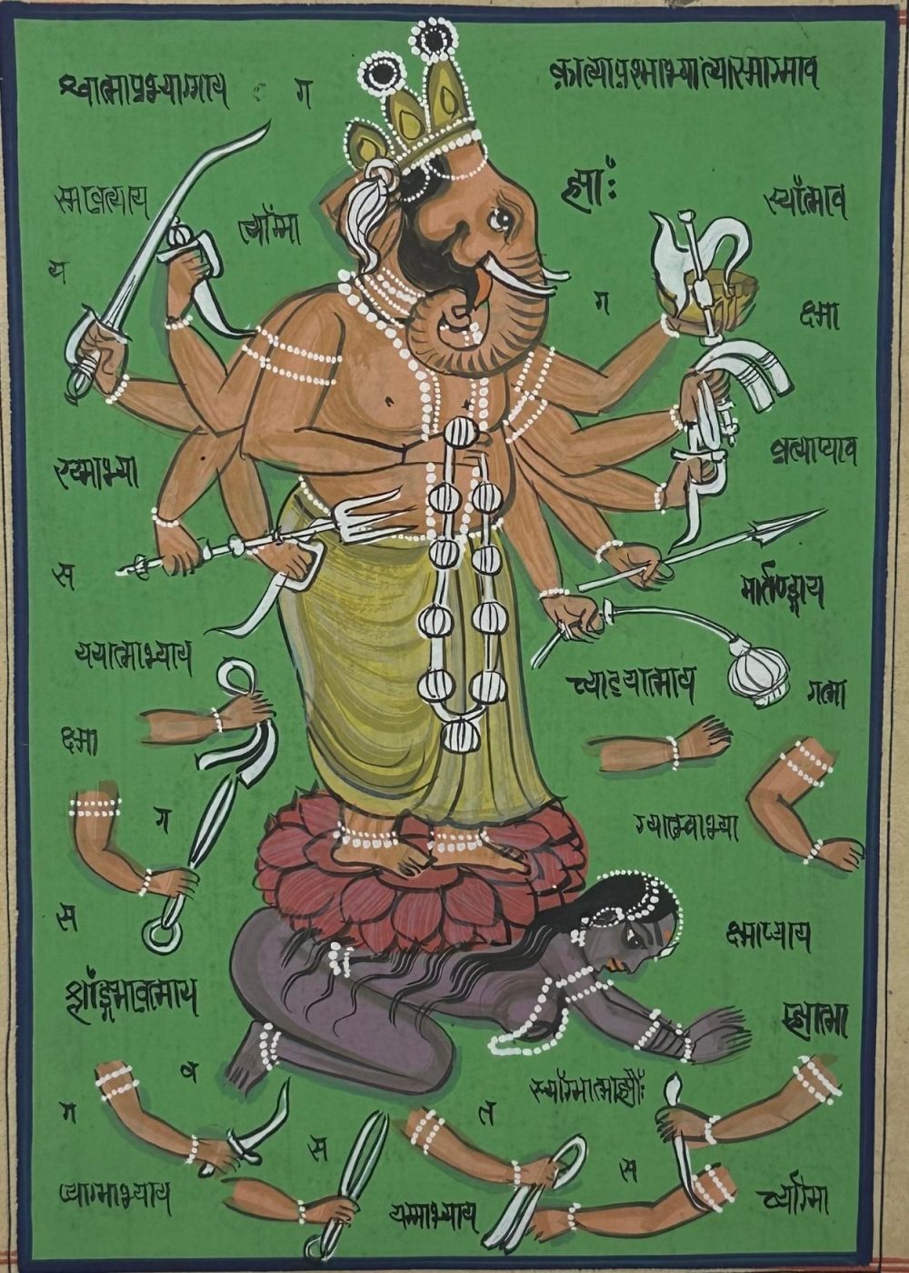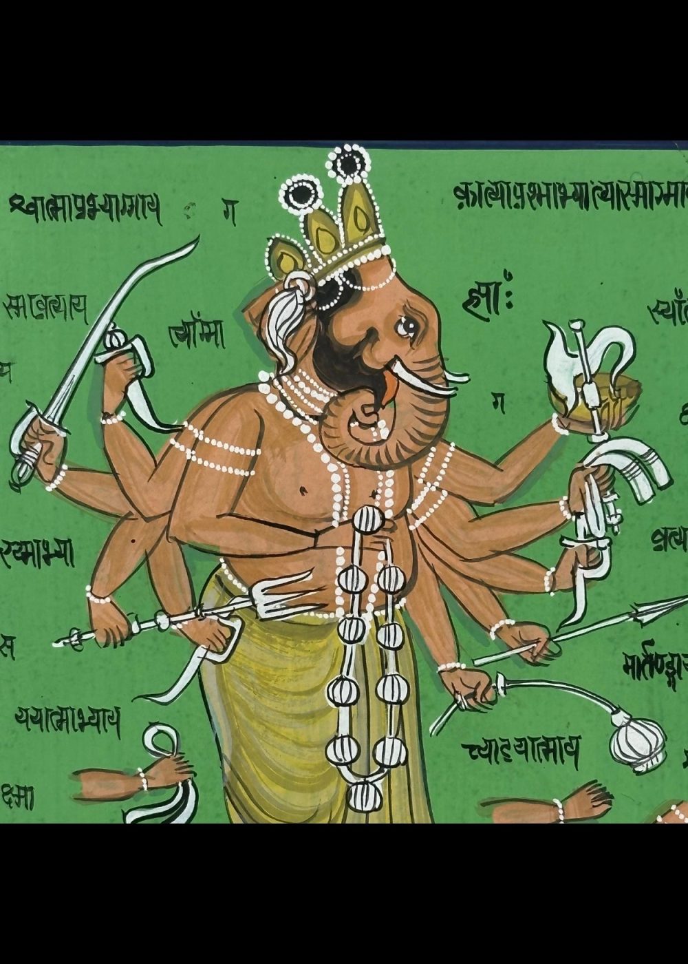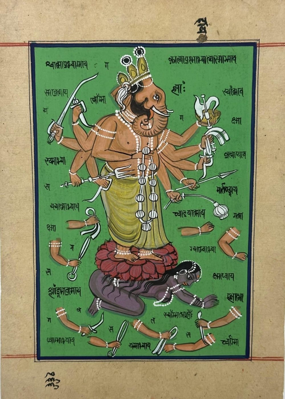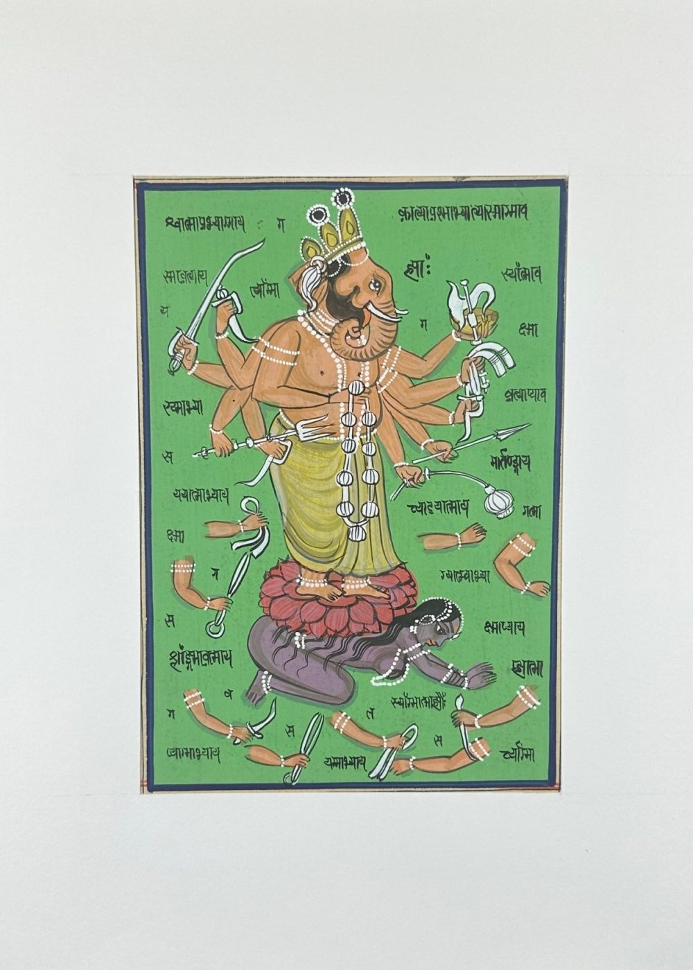 This striking Rajasthani miniature painting portrays a fierce multi-armed form of Lord Ganesha, depicted in dynamic combat stance, subduing a demoness beneath his feet. Armed with an array of weapons, including swords, tridents, and maces, Ganesha is shown with multiple arms symbolizing omnipotence and divine intervention. The composition is surrounded by Devanagari script, likely identifying the attributes or symbolic representations associated with the deity. The vibrant green background enhances the dramatic effect, while the floral pedestal adds a traditional devotional context. This artwork exemplifies the power of divine forces in overcoming evil, a common theme in folk and devotional art traditions.