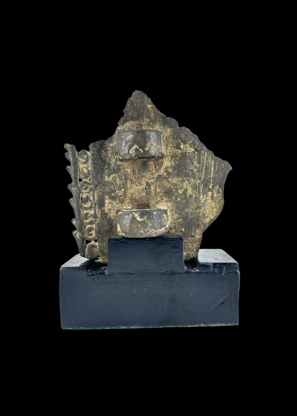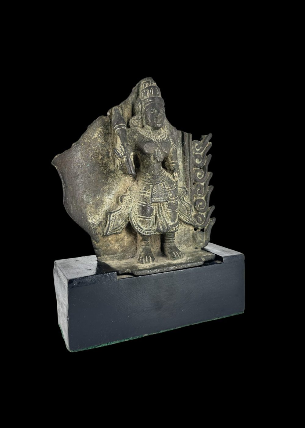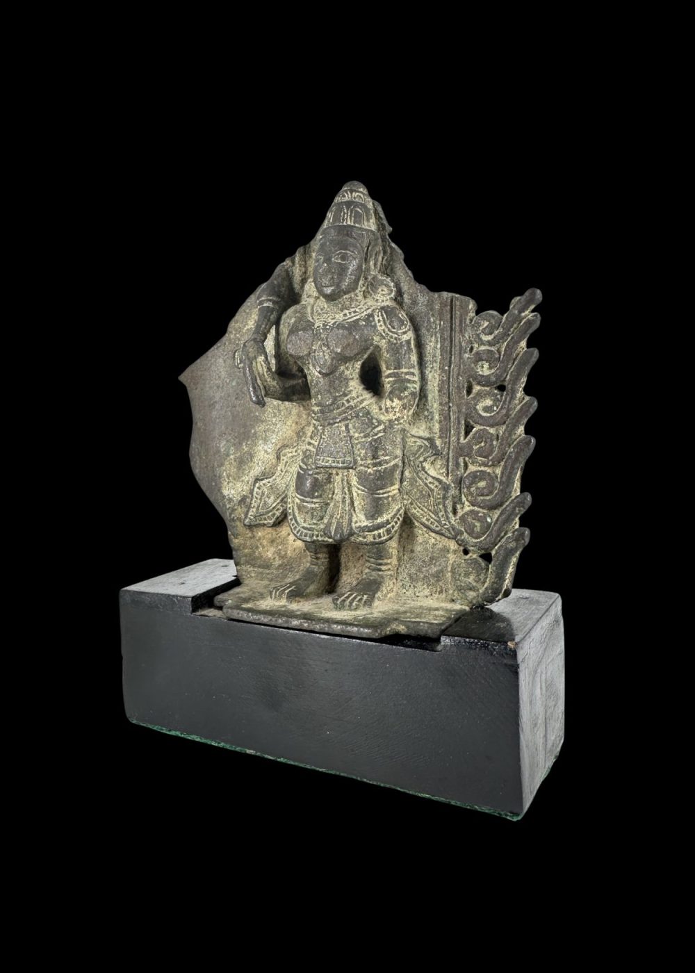 This bronze fragment from Karnataka is part of a prabhavali, the ornamental arch that traditionally frames Hindu deities in South Indian temple art. The central figure depicted is a goddess, possibly part of a larger composition surrounding a principal deity such as Vishnu or Shiva. She stands adorned with intricate jewelry and a tall headdress, embodying grace and divine energy. The stylized flames along the edge of the arch symbolize spiritual radiance. This fragment highlights Karnataka’s refined bronze craftsmanship and its role in enriching temple iconography with both artistic beauty and religious symbolism.