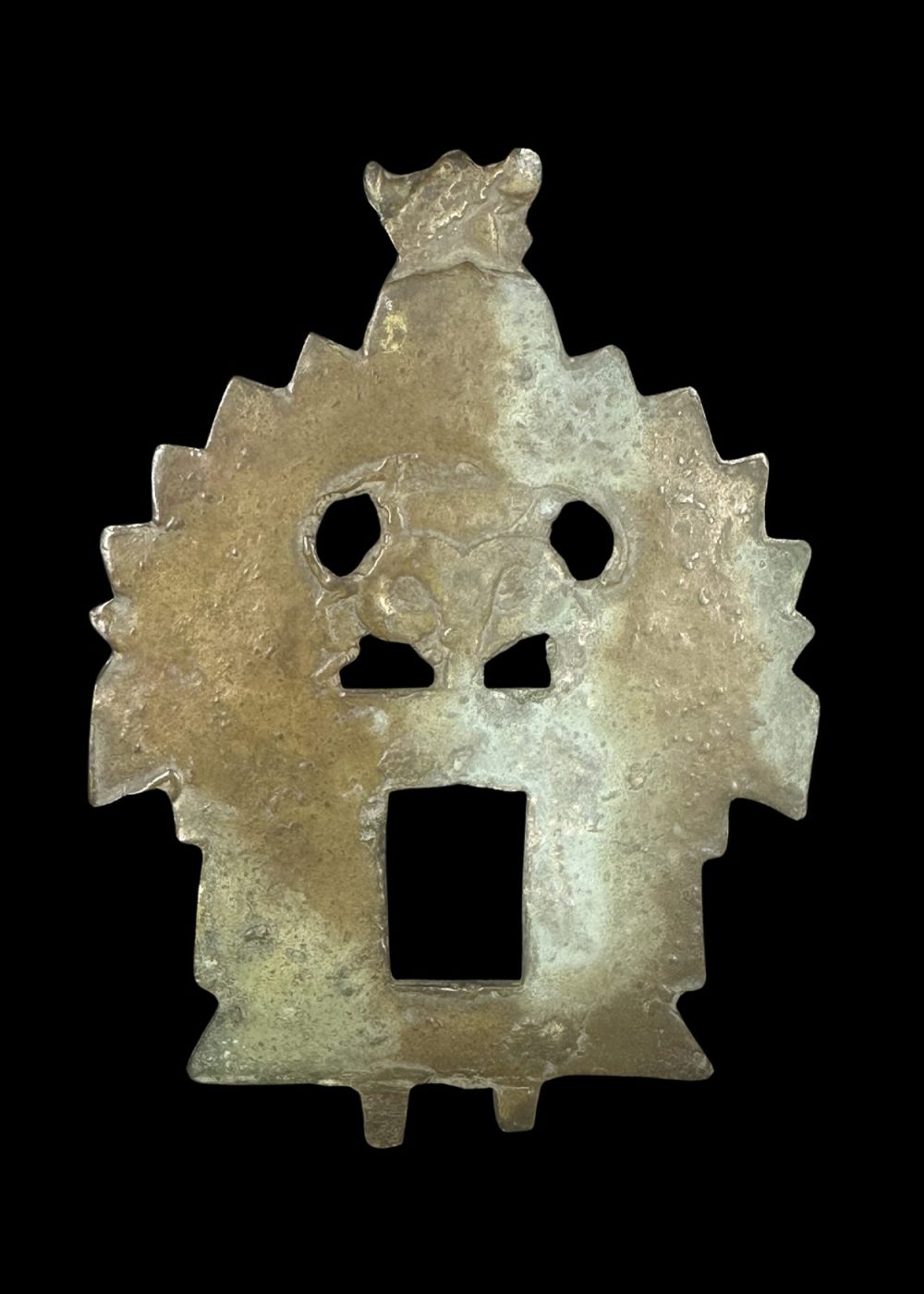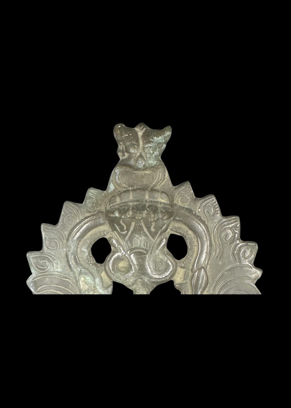 This bronze artifact is a Prabhavali—a traditional ornamental arch typically placed behind Hindu deity idols in temples or shrines. It features a central rectangular opening, which would frame the deity, while the upper section is adorned with intricate motifs, including intertwined serpents (nagas) and a kalasha (sacred pot), symbolizing prosperity and divine presence. The radiating flame-like patterns around the arch represent spiritual aura or divine energy. This piece is a fine example of sacred South Indian bronze craftsmanship.