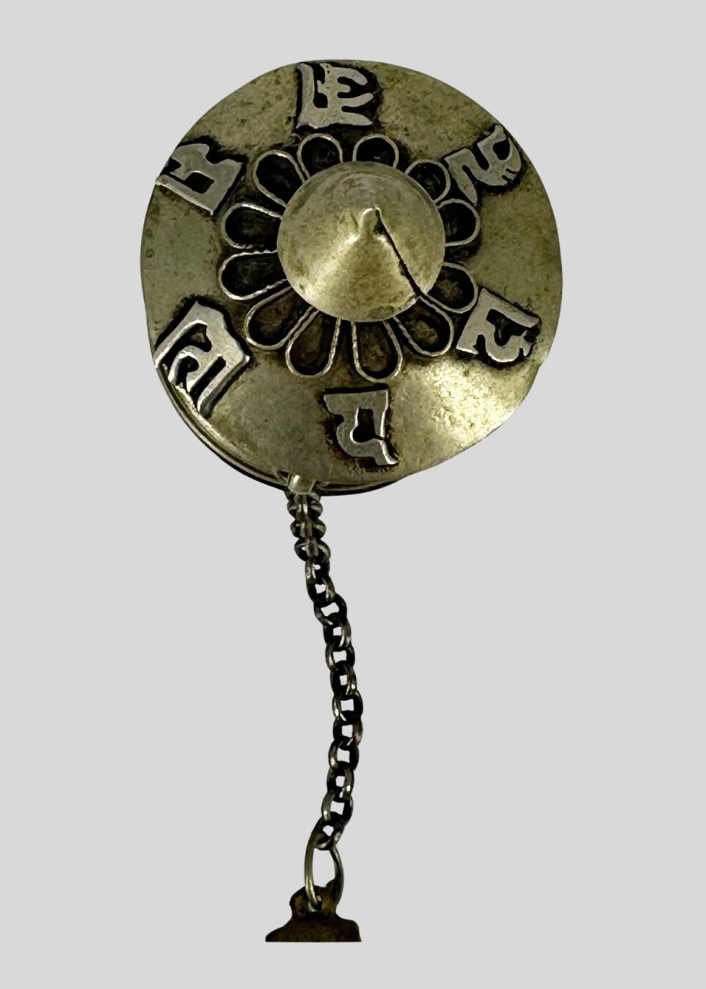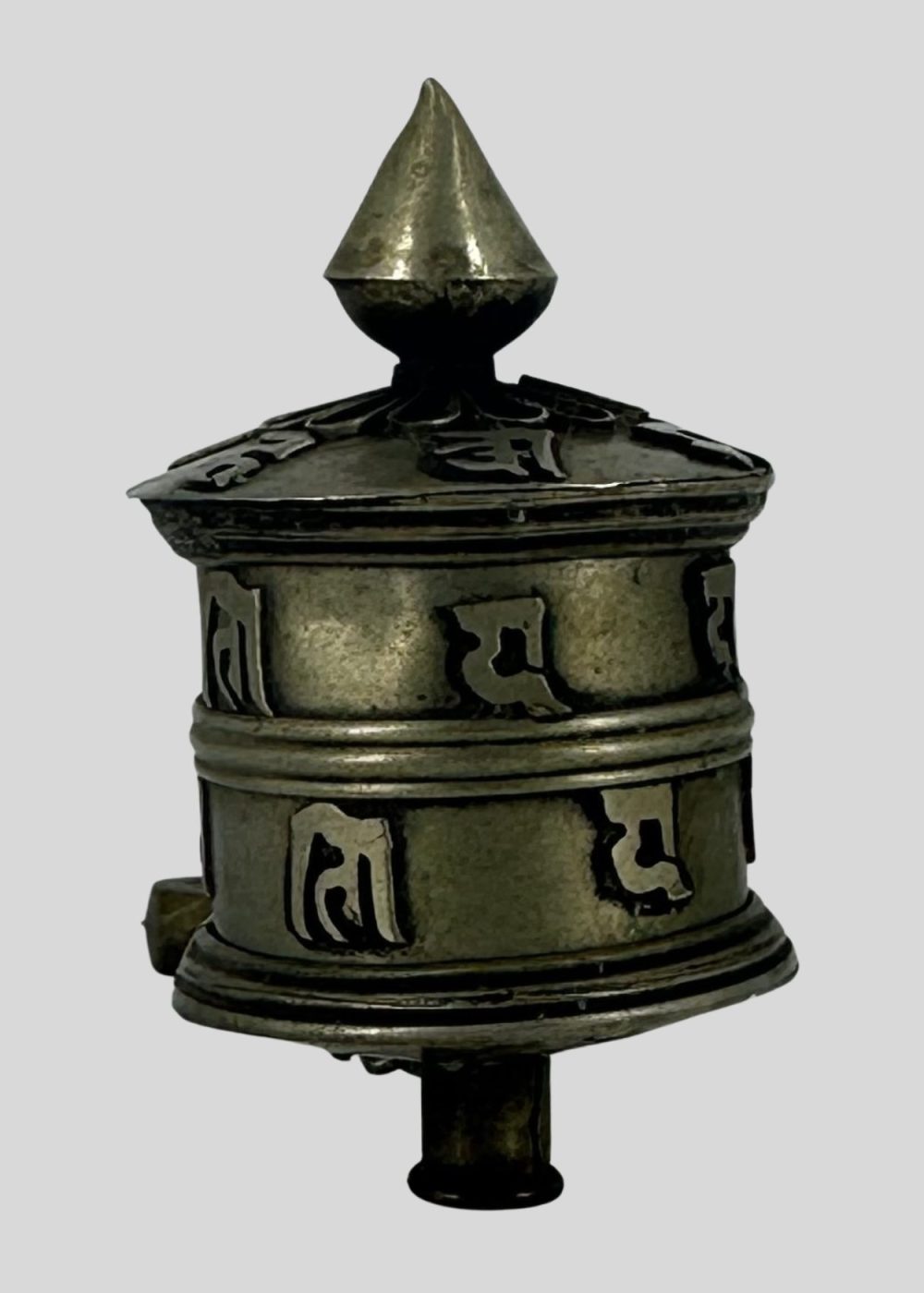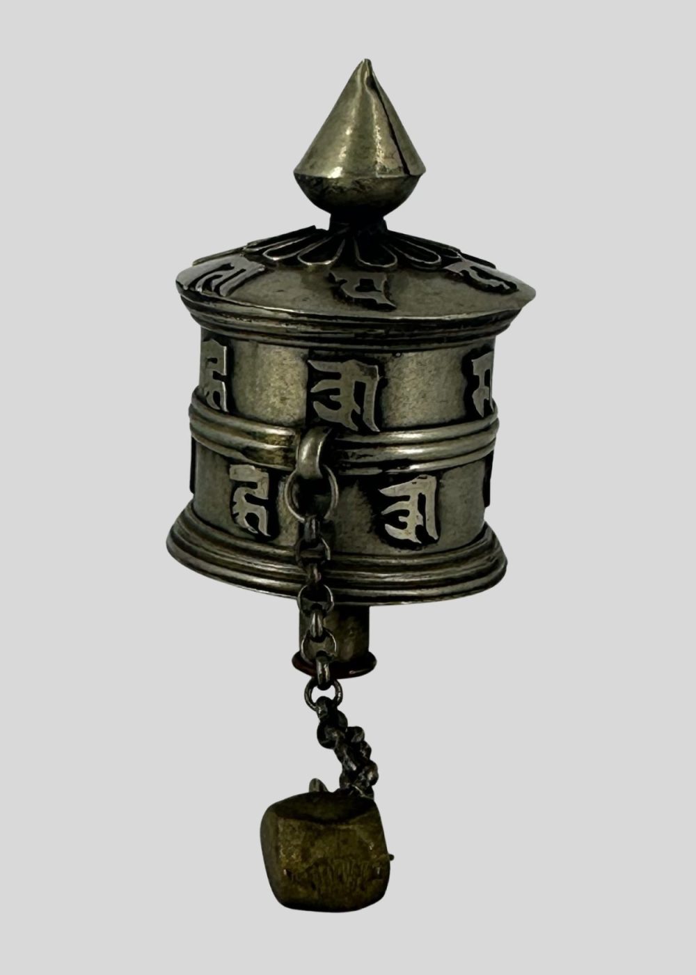 This cylindrical prayer wheel, crafted in copper and embellished with silver accents, exemplifies Nepal’s enduring mastery in devotional metalwork. The body is encircled with embossed or inlaid sacred script—likely Tibetan mantras—set within framed horizontal bands that evoke both spiritual meaning and visual harmony. A conical finial tops the structure, echoing flame or lotus symbolism, while a short chain terminating in a weighted pendant facilitates rotational movement in ritual practice. Mounted on a stepped, squared base, the wheel merges traditional Buddhist iconography with updated fabrication techniques, reflecting the continued vitality of Himalayan religious craftsmanship into the modern era.