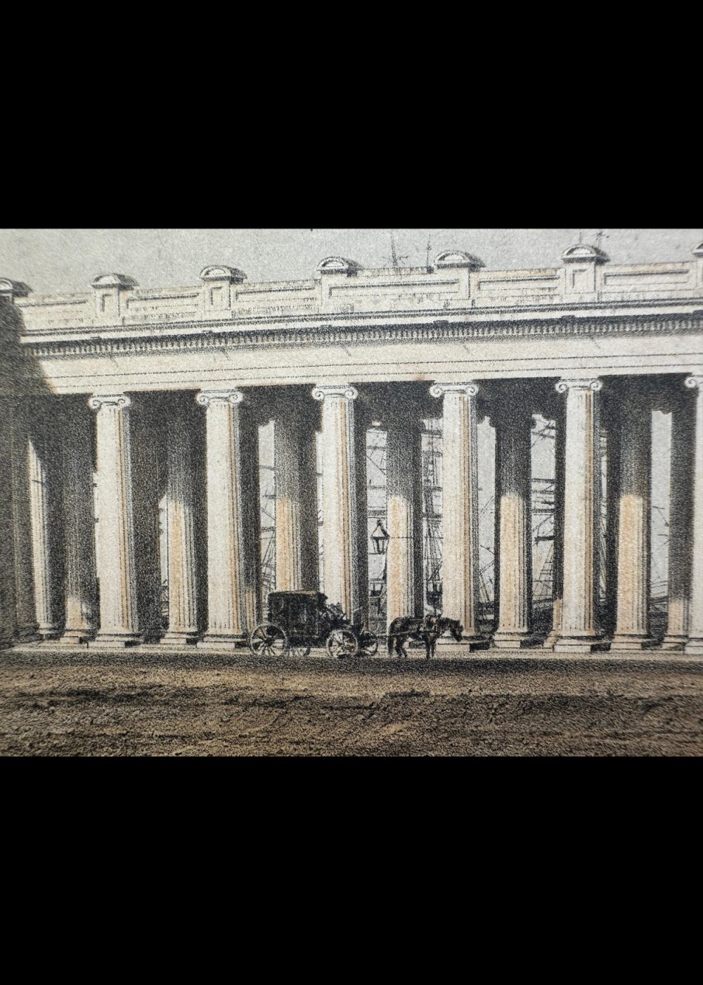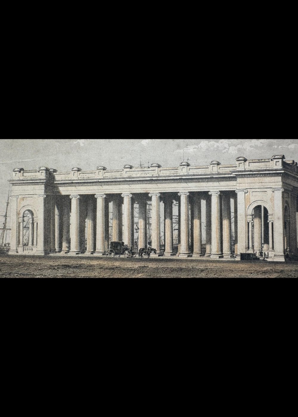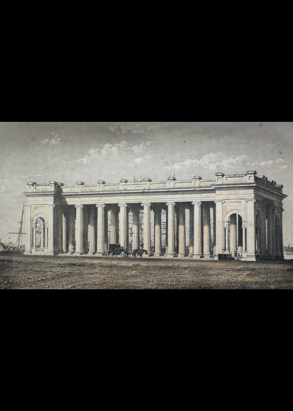 In the foreground, a horse-drawn carriage is visible, along with a few figures near the base of the structure. On the left, a ship can be seen docked, hinting at the ghat’s proximity to the river and its historical role as a center of trade and transportation. The print is indicative of the colonial era’s fascination with monumental structures and the blending of European architectural styles with Indian landscapes.